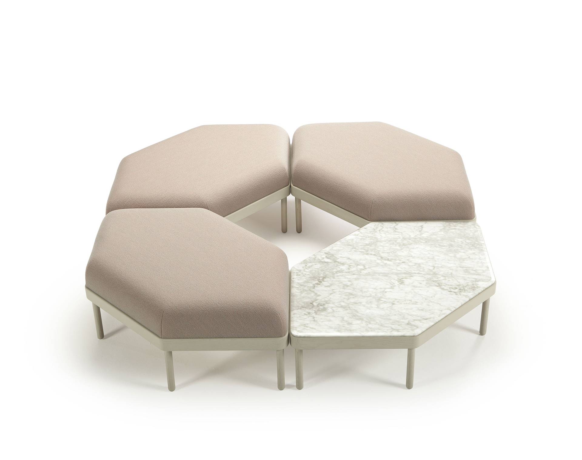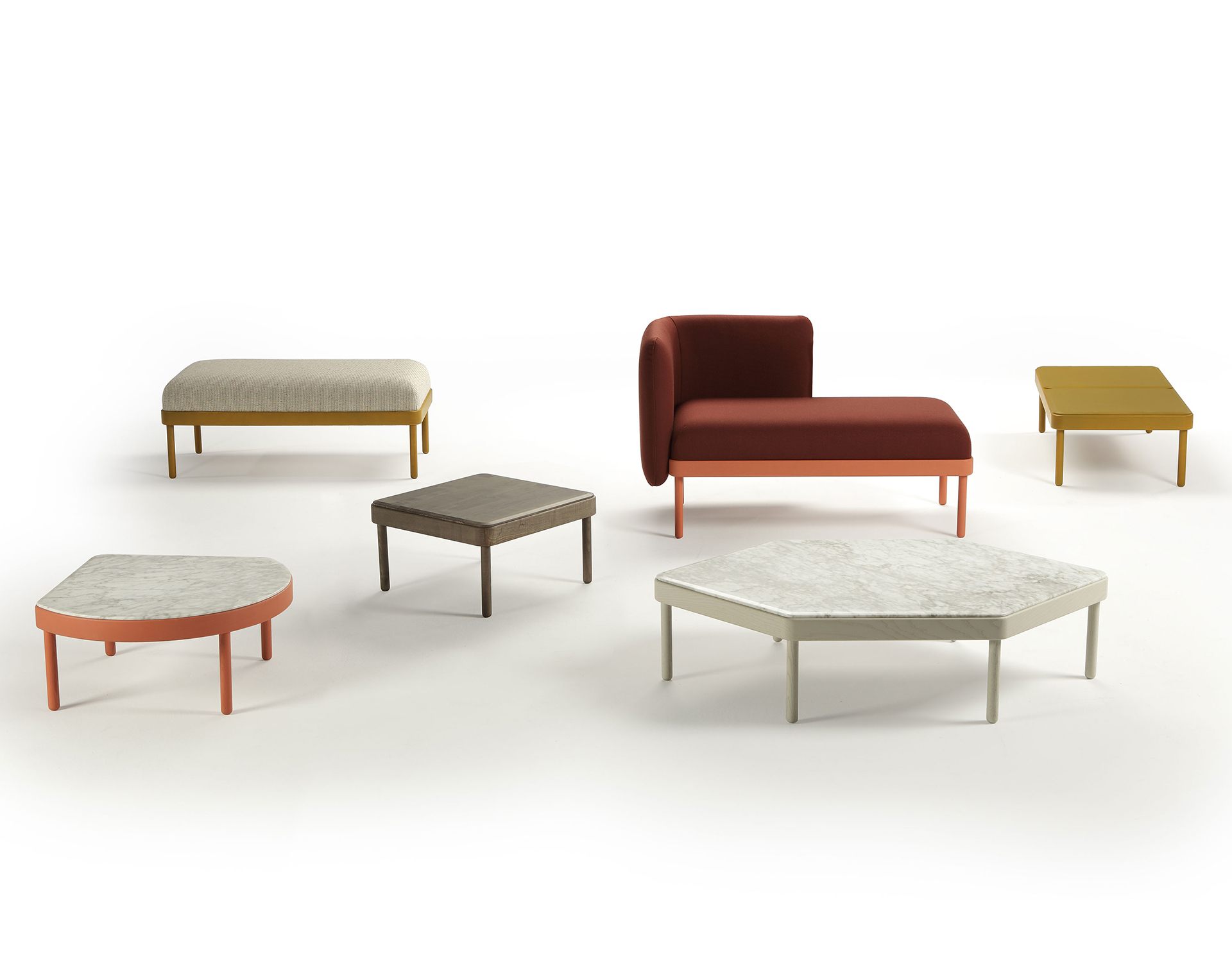 Rodina MOSAICO zahrnuje taburetky, lavice, lenošky a konferenční stolky, které lze libovolně kombinovat mezi sebou. Vyřeší snadno celou řadu prostorových omezení a nabízí mnoho barevných kombinací i provedení (např. mramor nebo masivní jasan).