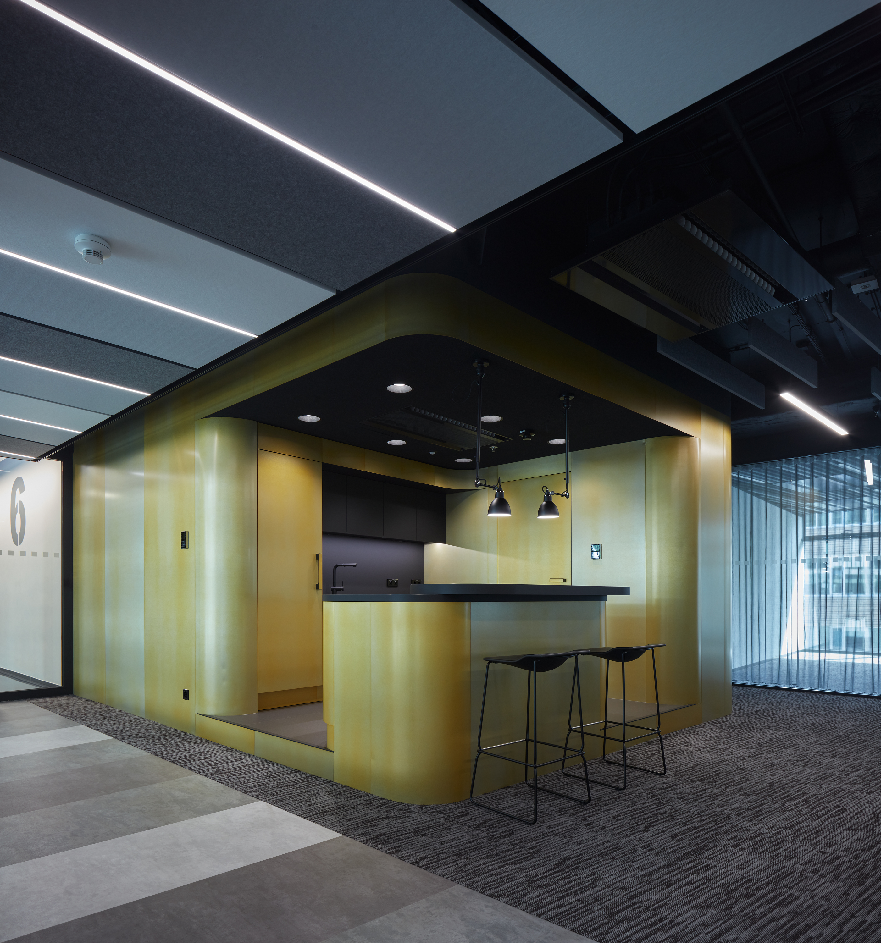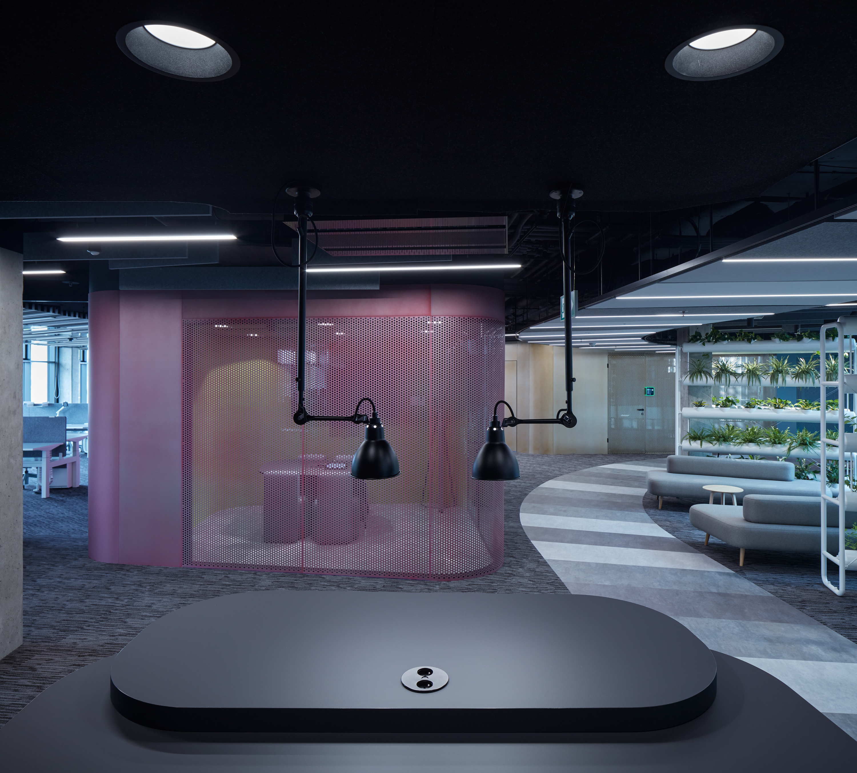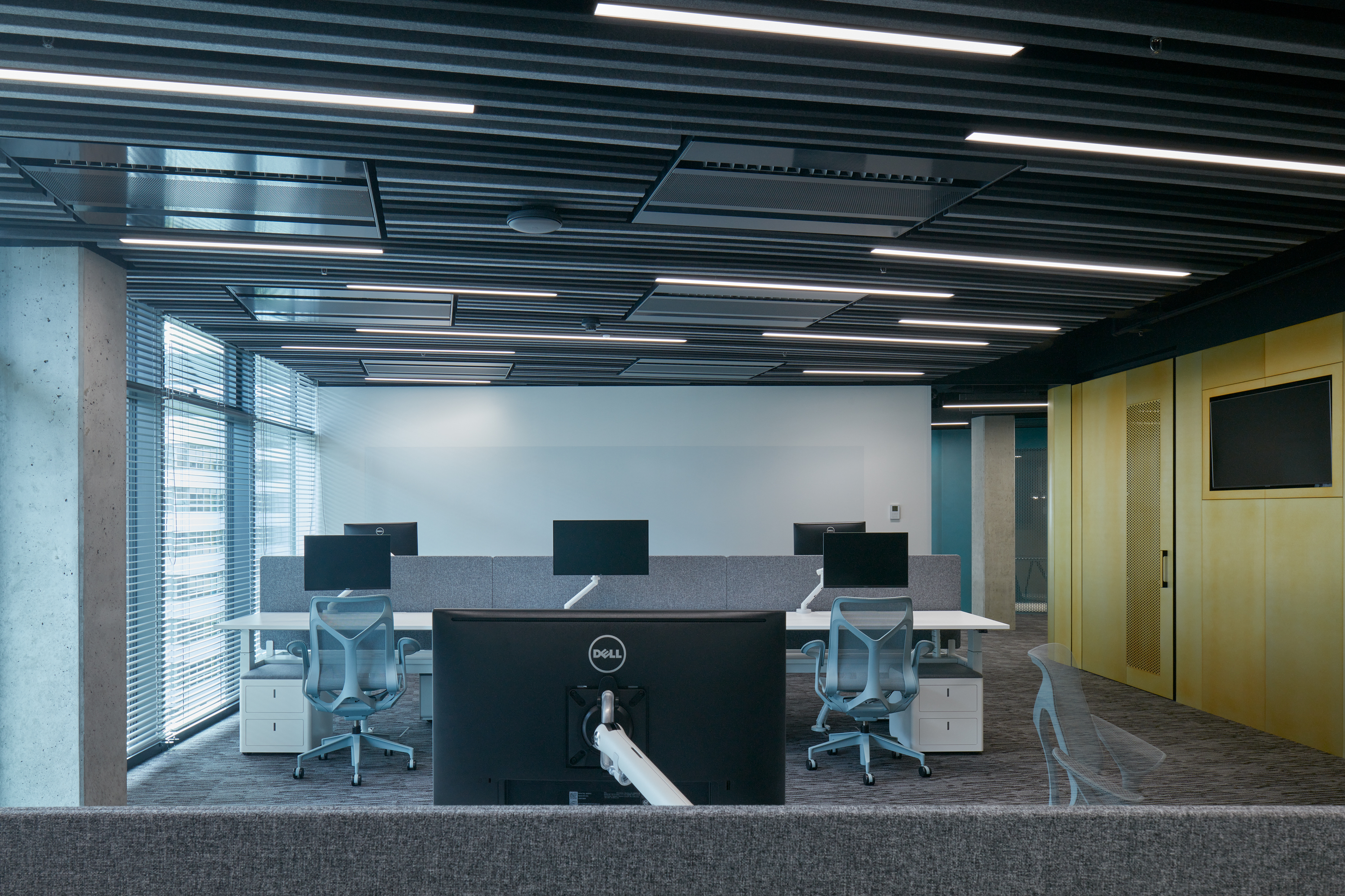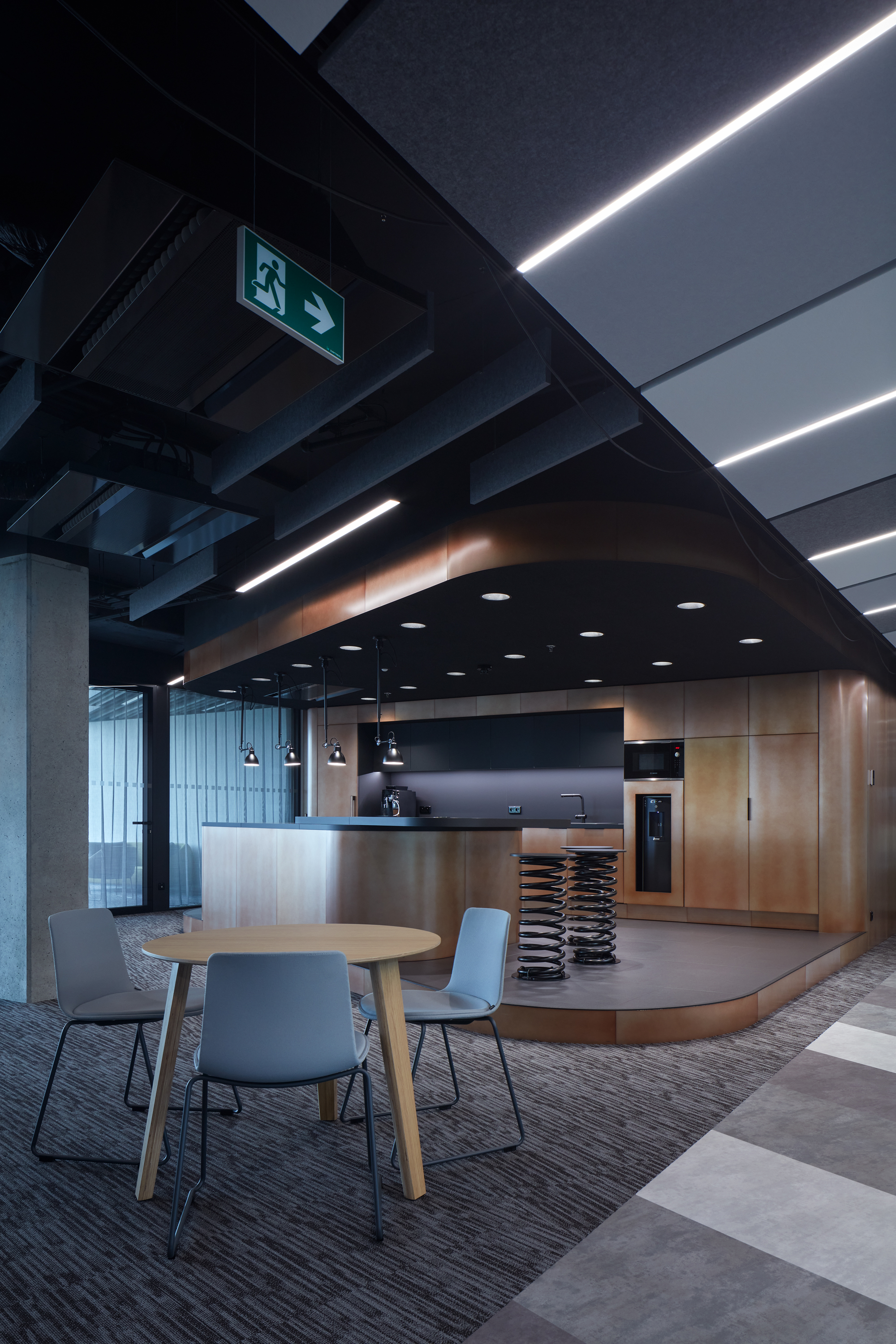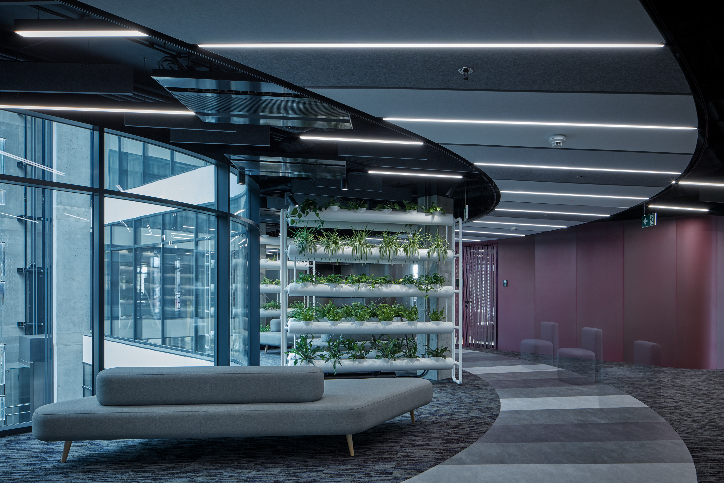 Další úžasné patro v budově Aspira. Otevřený prostor s oddělenými boxy z netradičně použitého perforovaného plechu, vše propojeno koridorem, v němž je sladěna podlaha se stropními akustickými panely a to jak tvarově, tak i po stránce barevnosti. Vše citlivě doplněno začleněným osvětlením. Strop navíc není zakrytý a jsou přiznány technologie, čímž je podtržen moderní lehce industriální design celého patra. "Chtěli jsme, aby nic nebylo zakryto a přiznané technologické prvky působily svou krásou stejně, jako třeba motor pod otevřenou kapotou auta." říkají architekti ze studia REAKTOR.