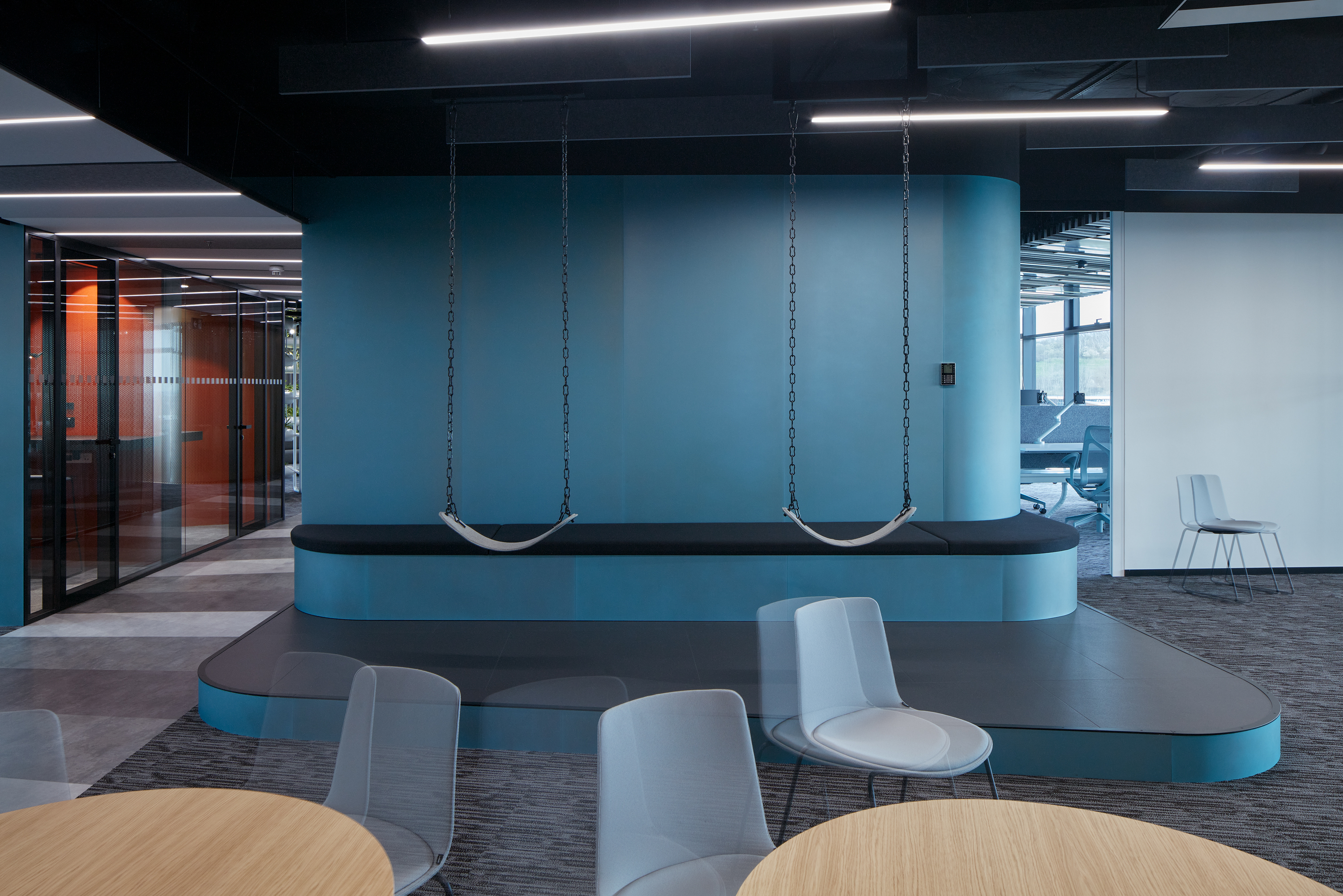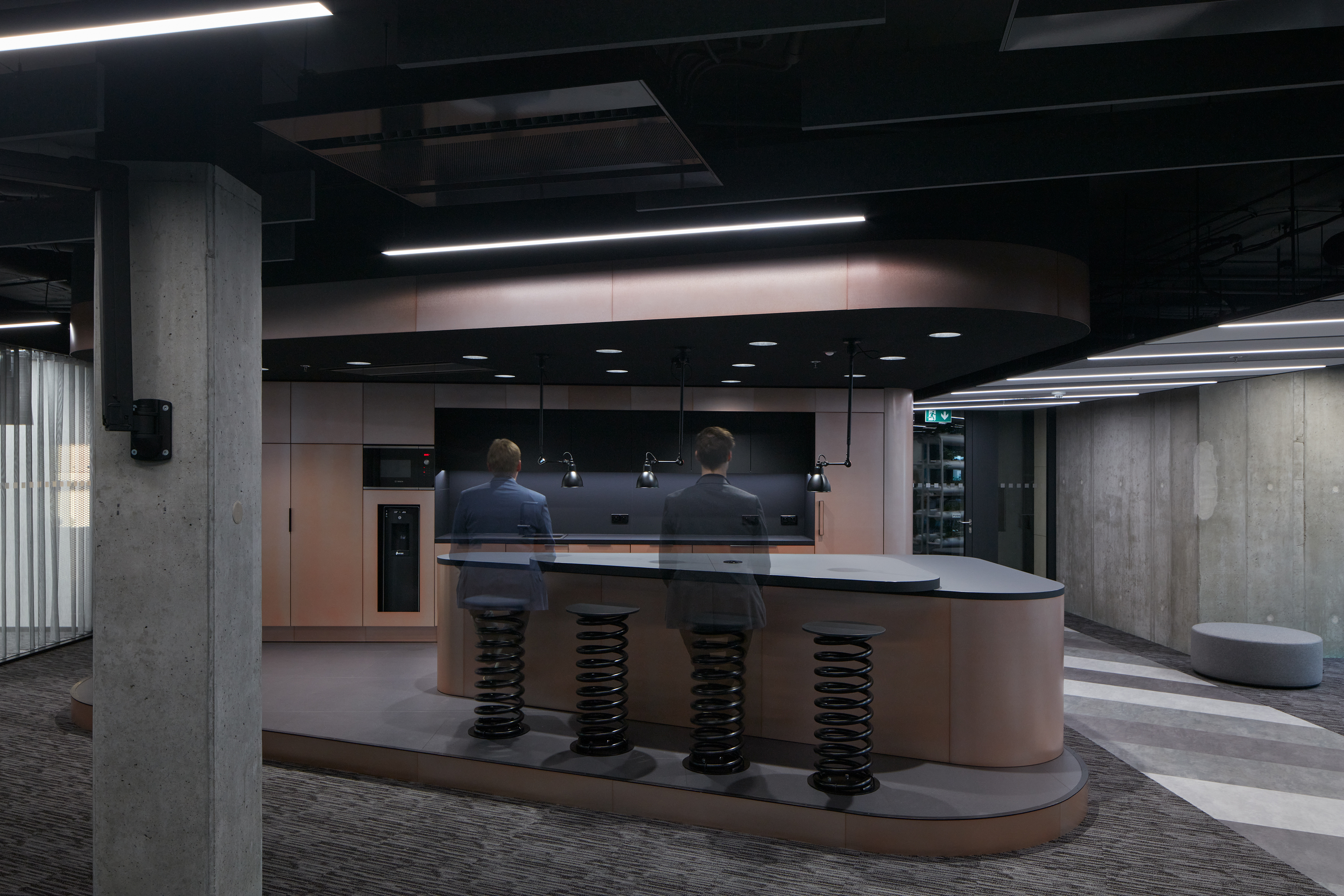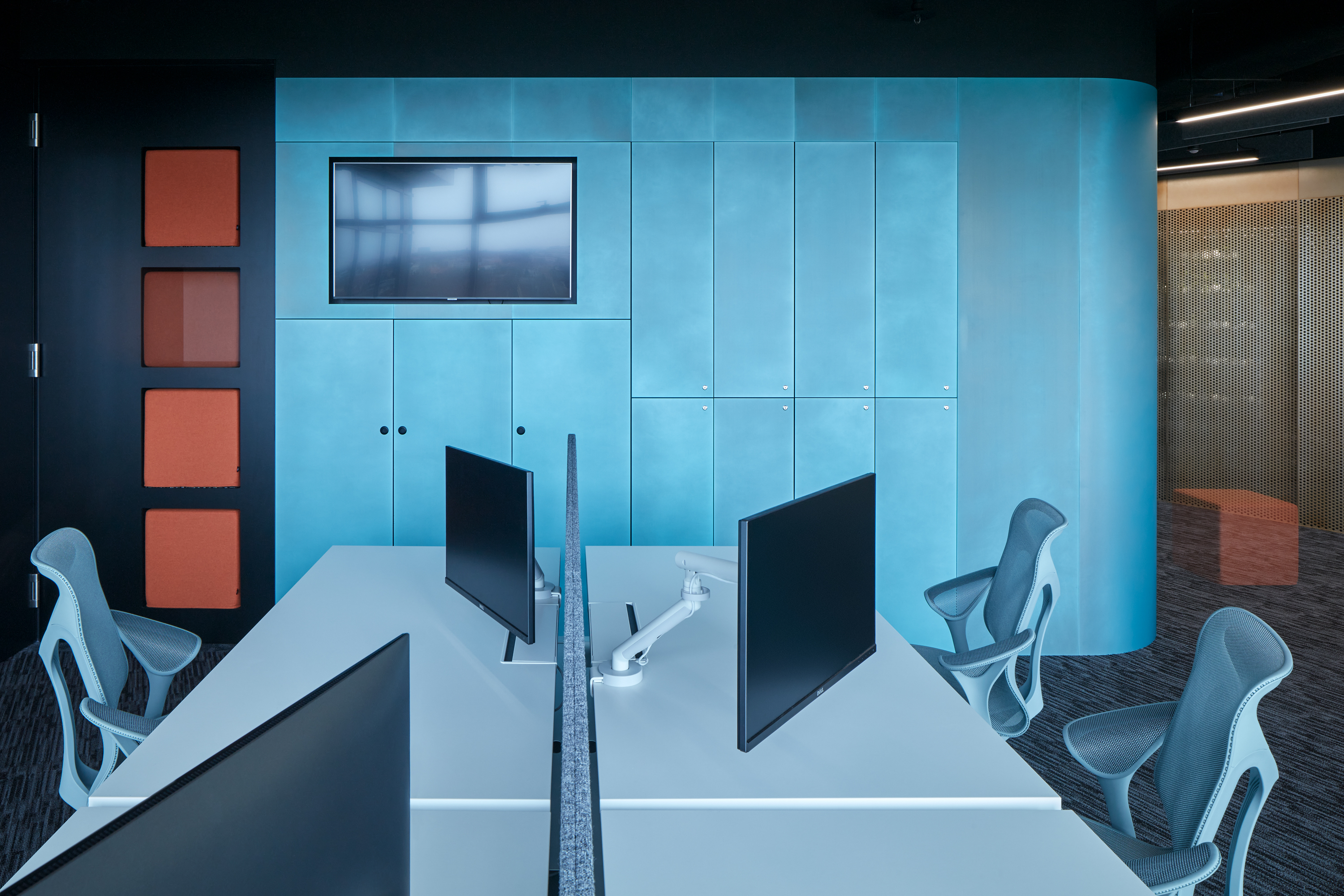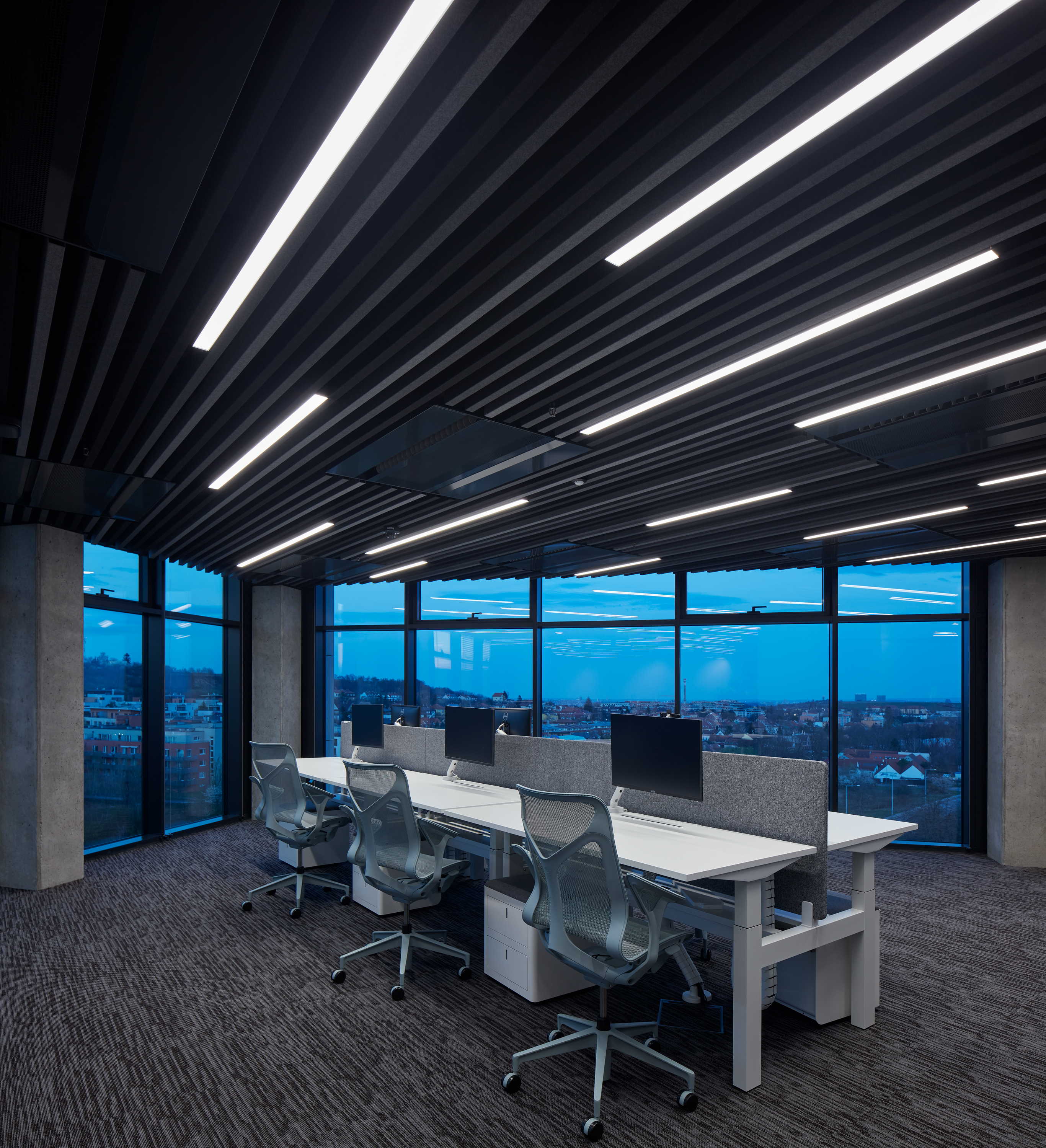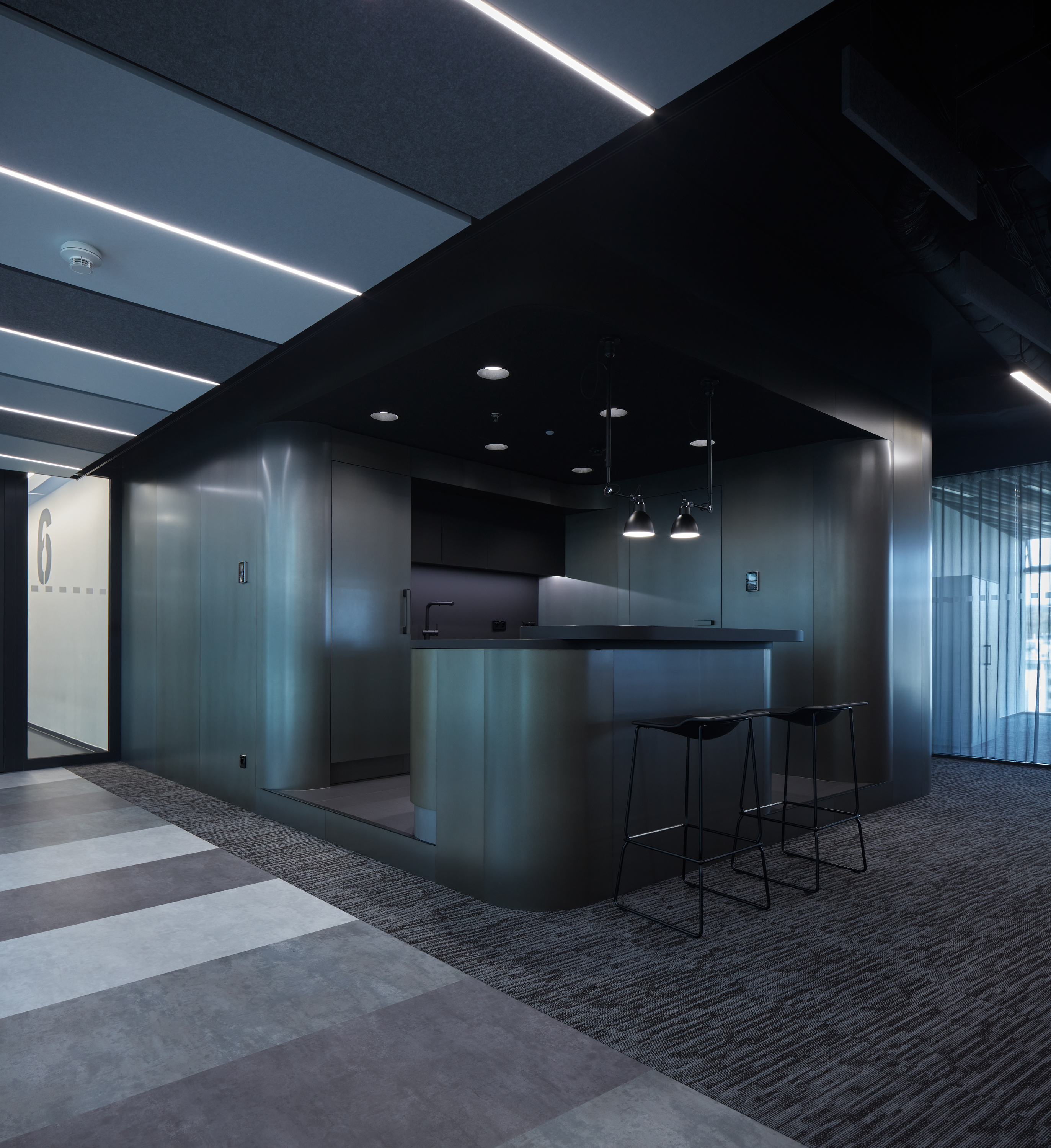 Další úžasné patro v budově Aspira. Otevřený prostor s oddělenými boxy z netradičně použitého perforovaného plechu, vše propojeno koridorem, v němž je sladěna podlaha se stropními akustickými panely a to jak tvarově, tak i po stránce barevnosti. Vše citlivě doplněno začleněným osvětlením. Strop navíc není zakrytý a jsou přiznány technologie, čímž je podtržen moderní lehce industriální design celého patra. "Chtěli jsme, aby nic nebylo zakryto a přiznané technologické prvky působily svou krásou stejně, jako třeba motor pod otevřenou kapotou auta." říkají architekti ze studia REAKTOR.