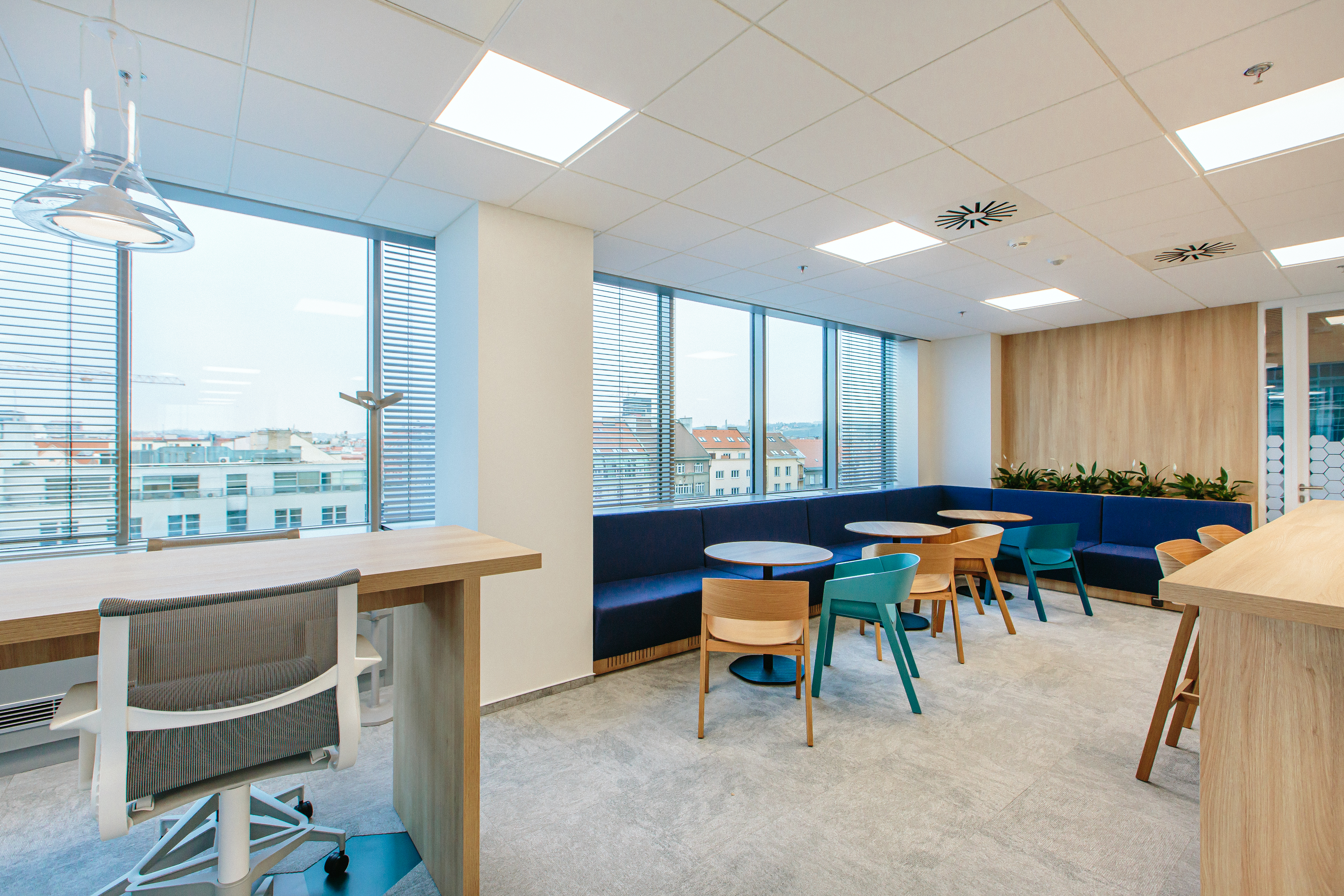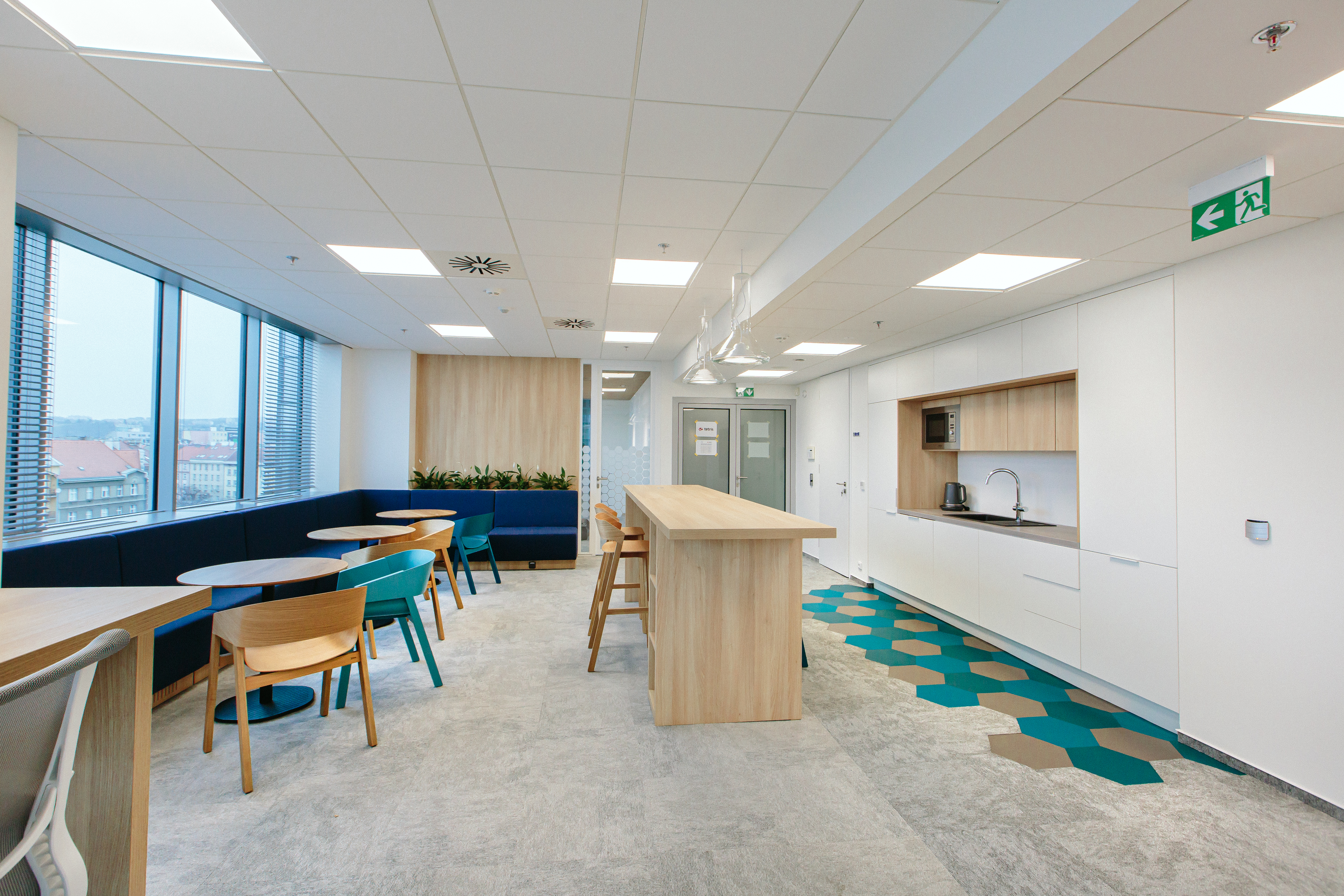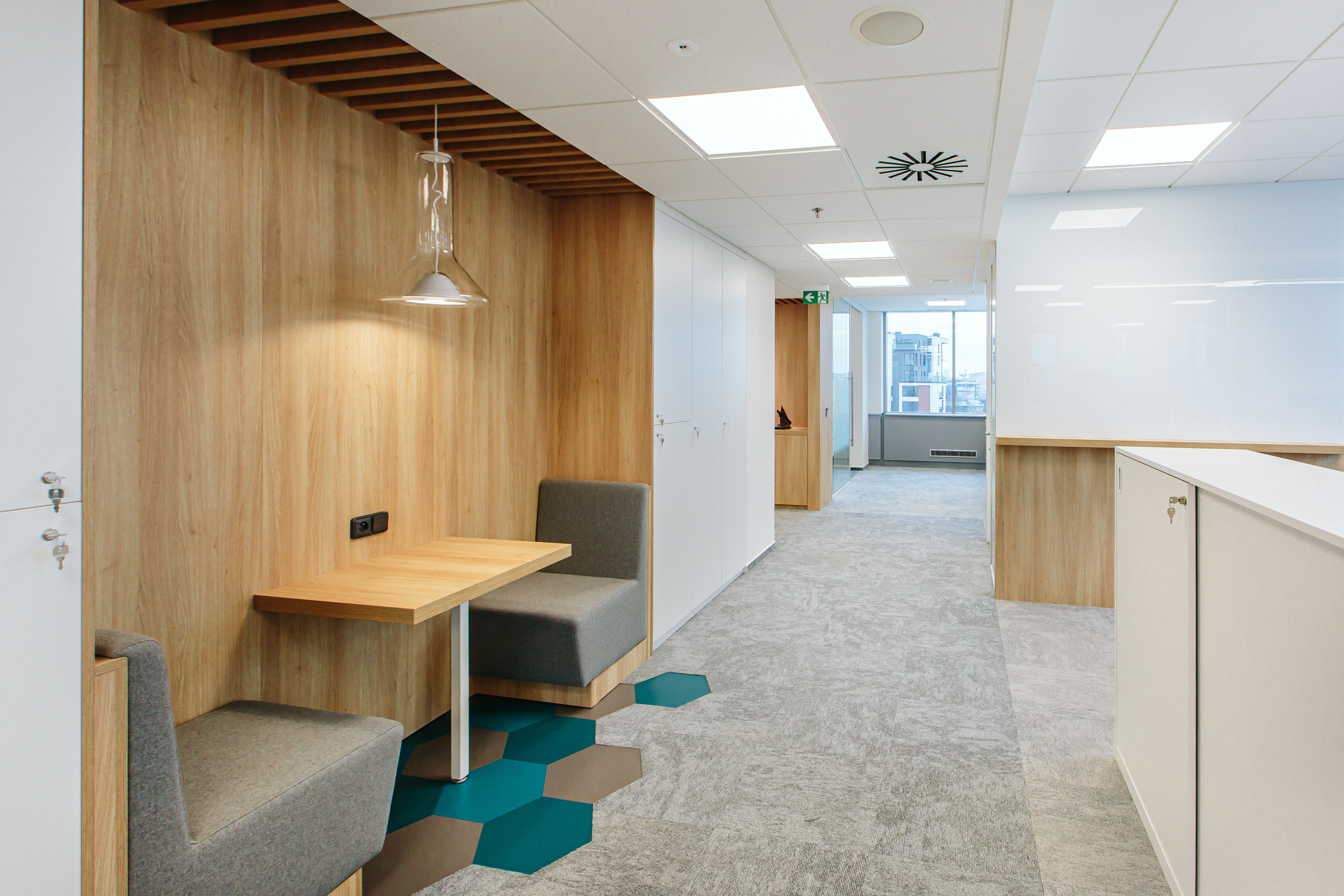 Nový kancelářský fit-out pro UCB Pharma v budově TOKOVO na Praha 7. Rozloha nových kanceláří je 250 m2- projekt pro zhruba 12 zaměstnanců. Prostory v původním stavu bylo potřeba zcela modernizovat a vdechnout jim zcela nový ráz. Bylo zapotřebí citlivě reagovat na limity budovy, která pochází ze 70. let minulého století. Uspořádání dispozice se soustředilo na vytvoření pracovního prostředí odpovídajícího konceptu openspace s možností částečného oddělení a vytvoření soukromí pro soustředěnou práci. V interiéru je hodně skla, dřevěné obklady příček působí teple a navzdory relativně malému prostoru se podařilo zasadit i spousty neformálních zón s různými typy sezení a zasedací místnost. Celkové uspořádání obsahuje měkké lavice a singl křesílka v common area, ušáky, sezení typu coupé, solidní stůl v zasedací místnosti s odlehčenými židlemi, netradiční vysokou recepci spojenou s kuchyňkou. Výrazné logo naproti vstupu, spousty úložného prostoru, šatnu a copy point. Pečlivě vybraný design kvalitních svítidel doplnil charakter vzdušného a čistého prostoru. Pracovní stanice tvoří výškově stavitelné motorické stoly se společnými podnožemi. Jednotlivá pracoviště dělí akustické paravány. Pracovní židle byly vybrány velmi pečlivě s ohledem na ergonomii a celkový design interiéru.