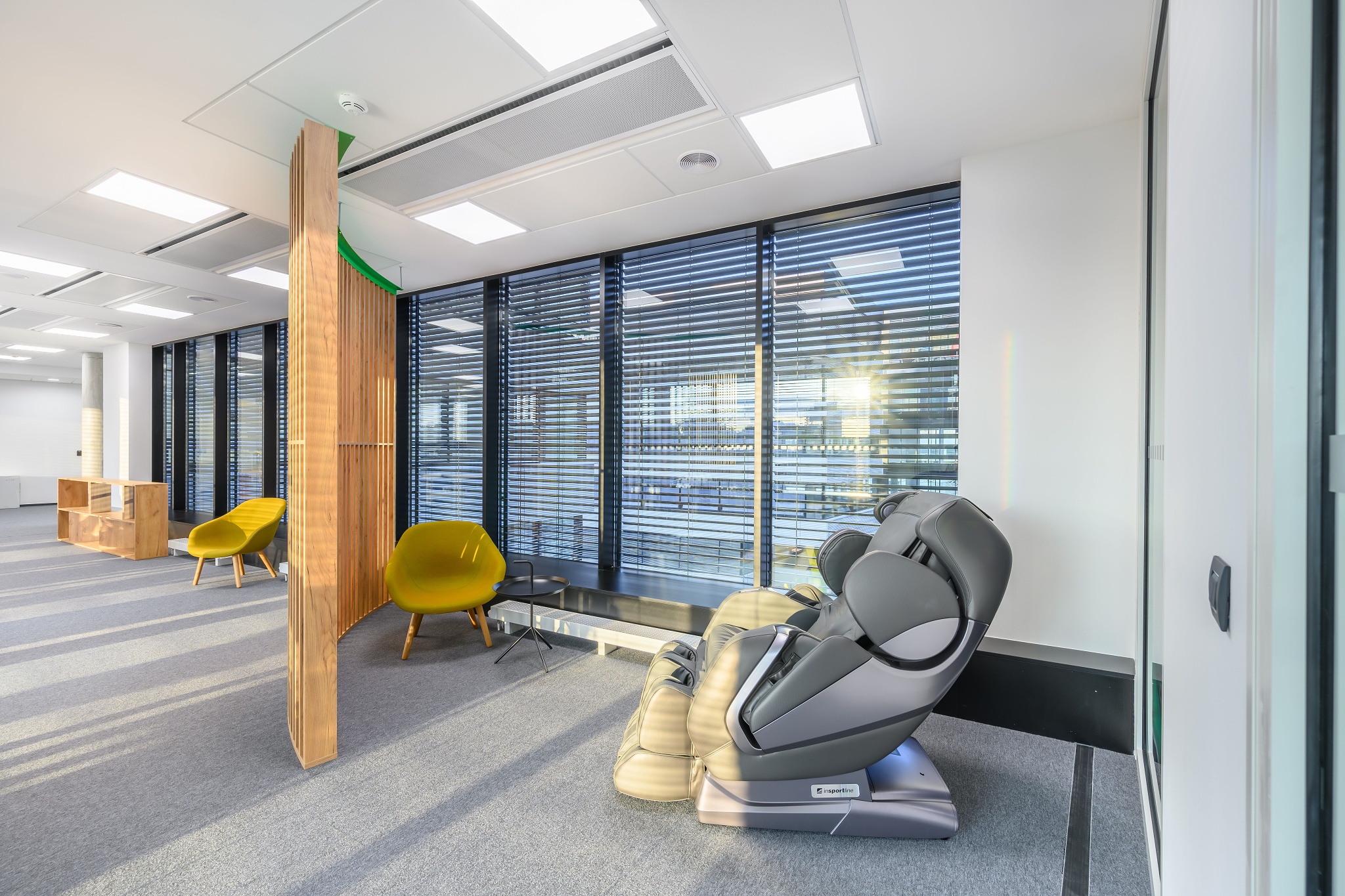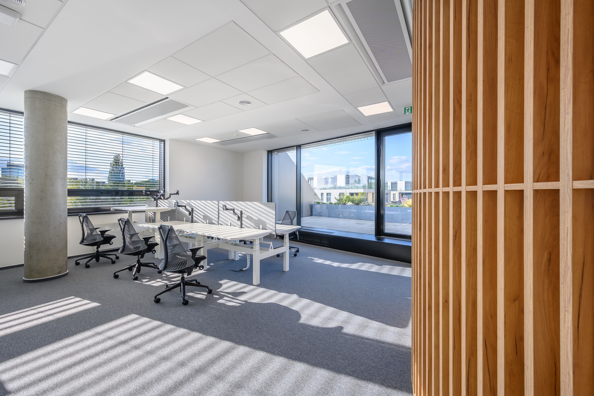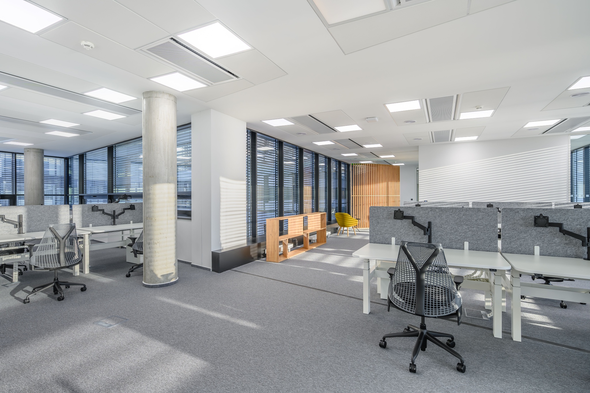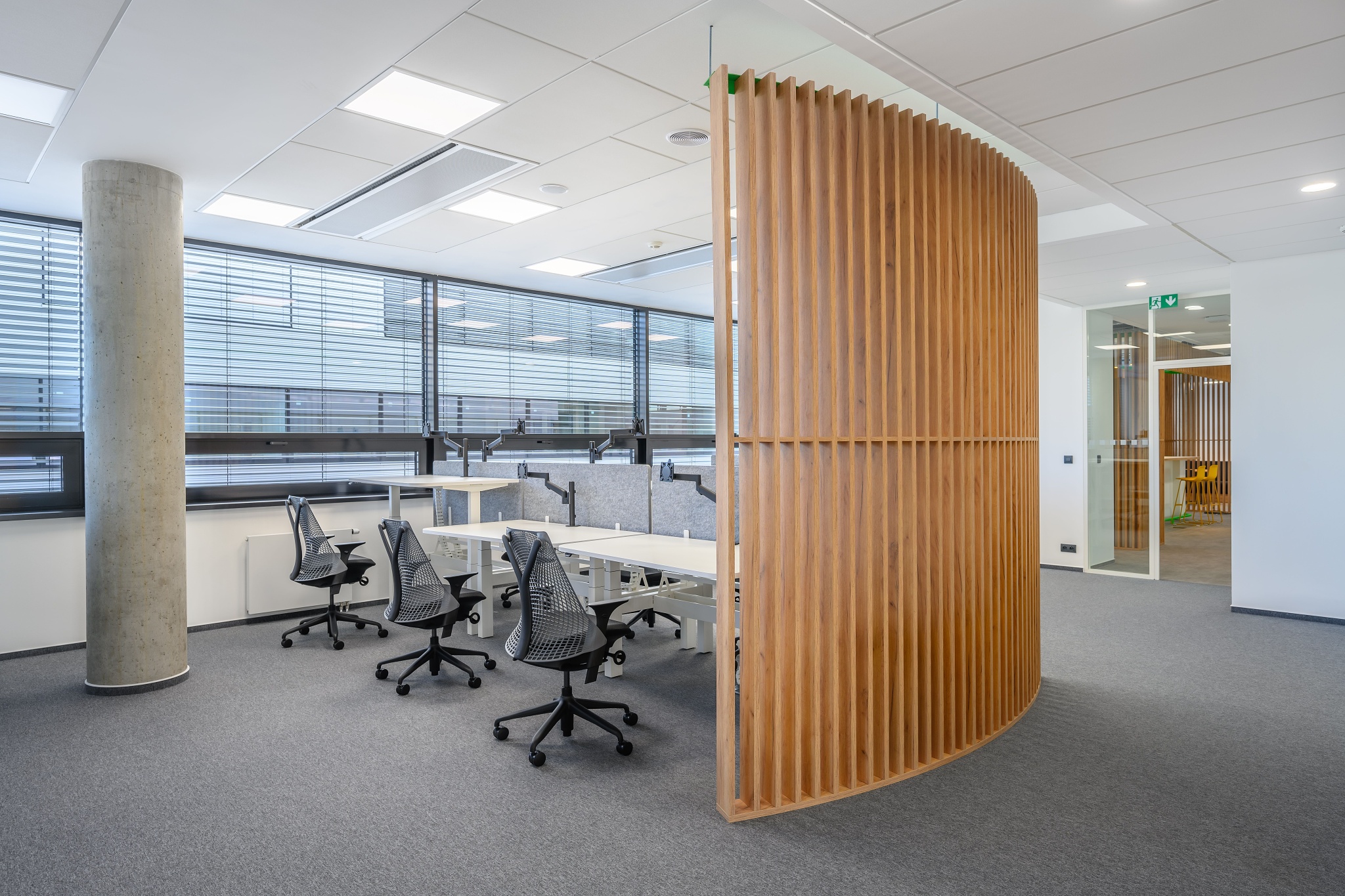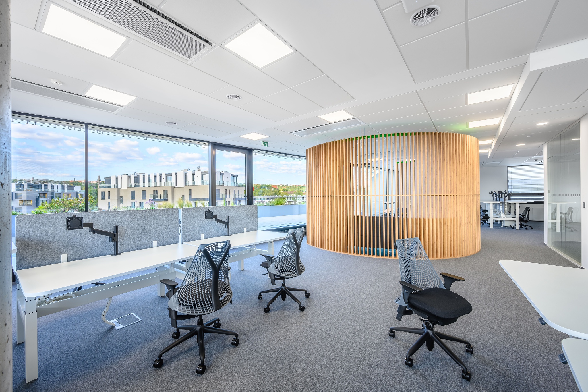 V nových prostorách společnosti Wrike zaznívají příjemné barevné přírodní tóny dřeva v kontrastu s přiznanou průmyslovou šedí pohledového betonu. To vše oživeno paletou jasných barev použitých na podlahových krytinách. Do takto komplexně řešeného projektu jsme přispěli jednak mnoha originálními prvky atypického nábytku, ale také našimi osvědčenými evergreeny od společnosti Herman Miller, Hay a Enea. Pracoviště jsme vybavili ergonomickou novinkou od CBS - rameny Lima a skvělými kancelářskými židlemi Sayl. Naopak zasedací místnosti zdobí naše řada meetingových stolů cre8 Puzzle a aby ladily s pracovišti, i zde jsou použity židle Sayl, ovšem ve své zasedací podobě. Jedním prvkem tak vznikl propojený harmonický celek.
