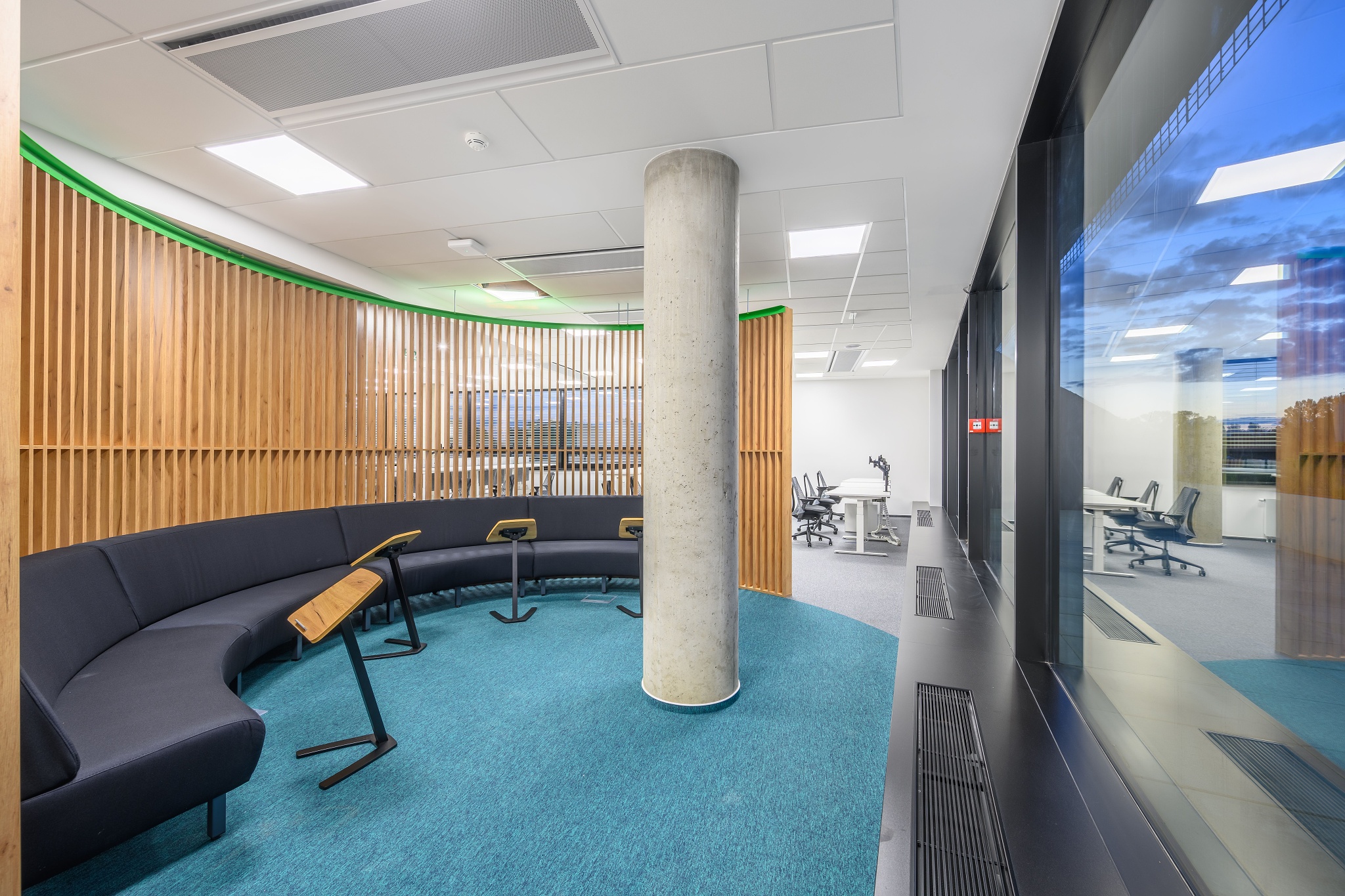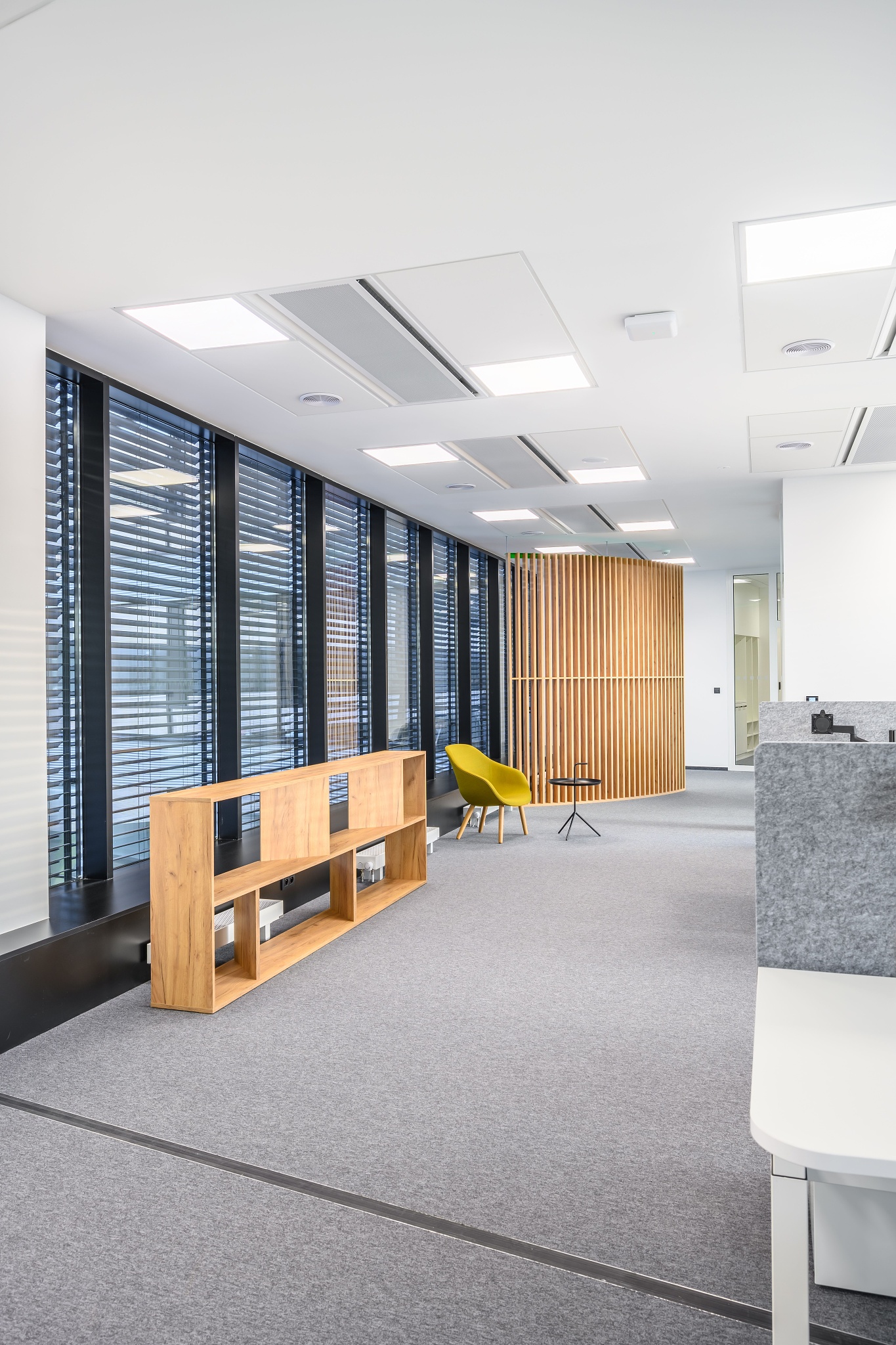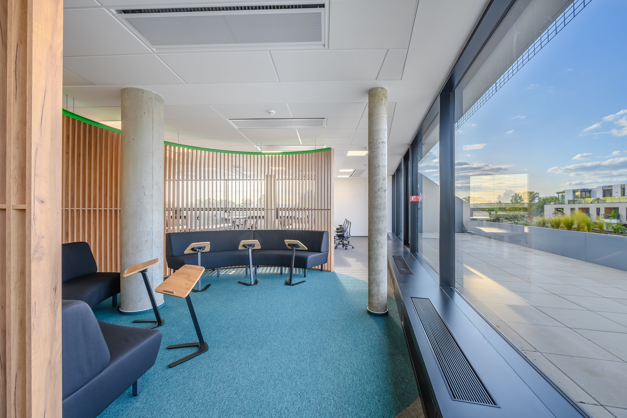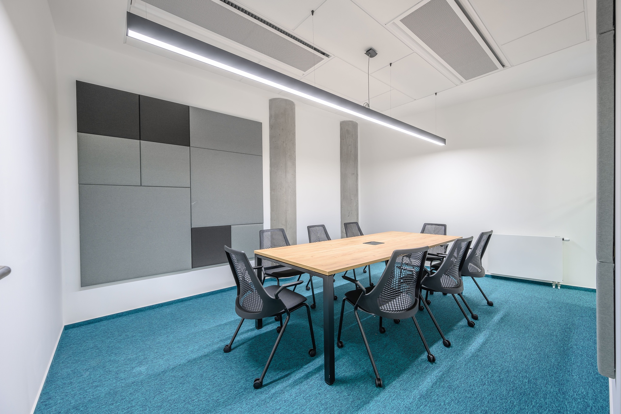 V nových prostorách společnosti Wrike zaznívají příjemné barevné přírodní tóny dřeva v kontrastu s přiznanou průmyslovou šedí pohledového betonu. To vše oživeno paletou jasných barev použitých na podlahových krytinách. Do takto komplexně řešeného projektu jsme přispěli jednak mnoha originálními prvky atypického nábytku, ale také našimi osvědčenými evergreeny od společnosti Herman Miller, Hay a Enea. Pracoviště jsme vybavili ergonomickou novinkou od CBS - rameny Lima a skvělými kancelářskými židlemi Sayl. Naopak zasedací místnosti zdobí naše řada meetingových stolů cre8 Puzzle a aby ladily s pracovišti, i zde jsou použity židle Sayl, ovšem ve své zasedací podobě. Jedním prvkem tak vznikl propojený harmonický celek.