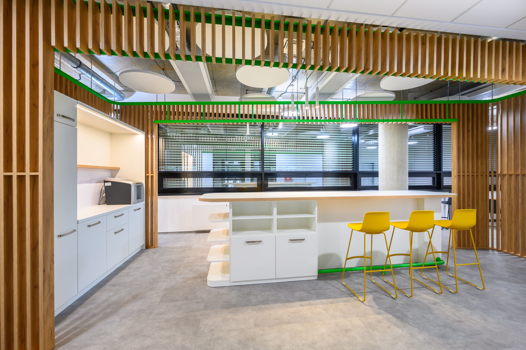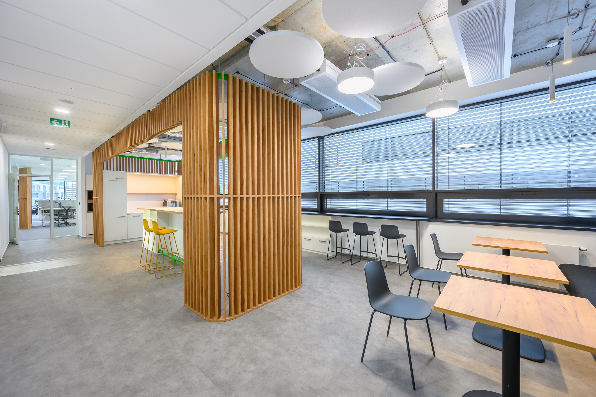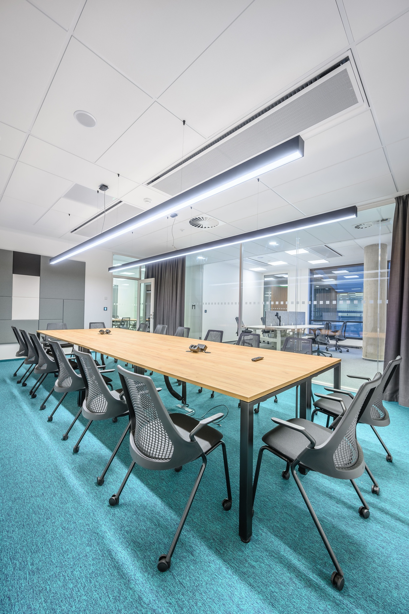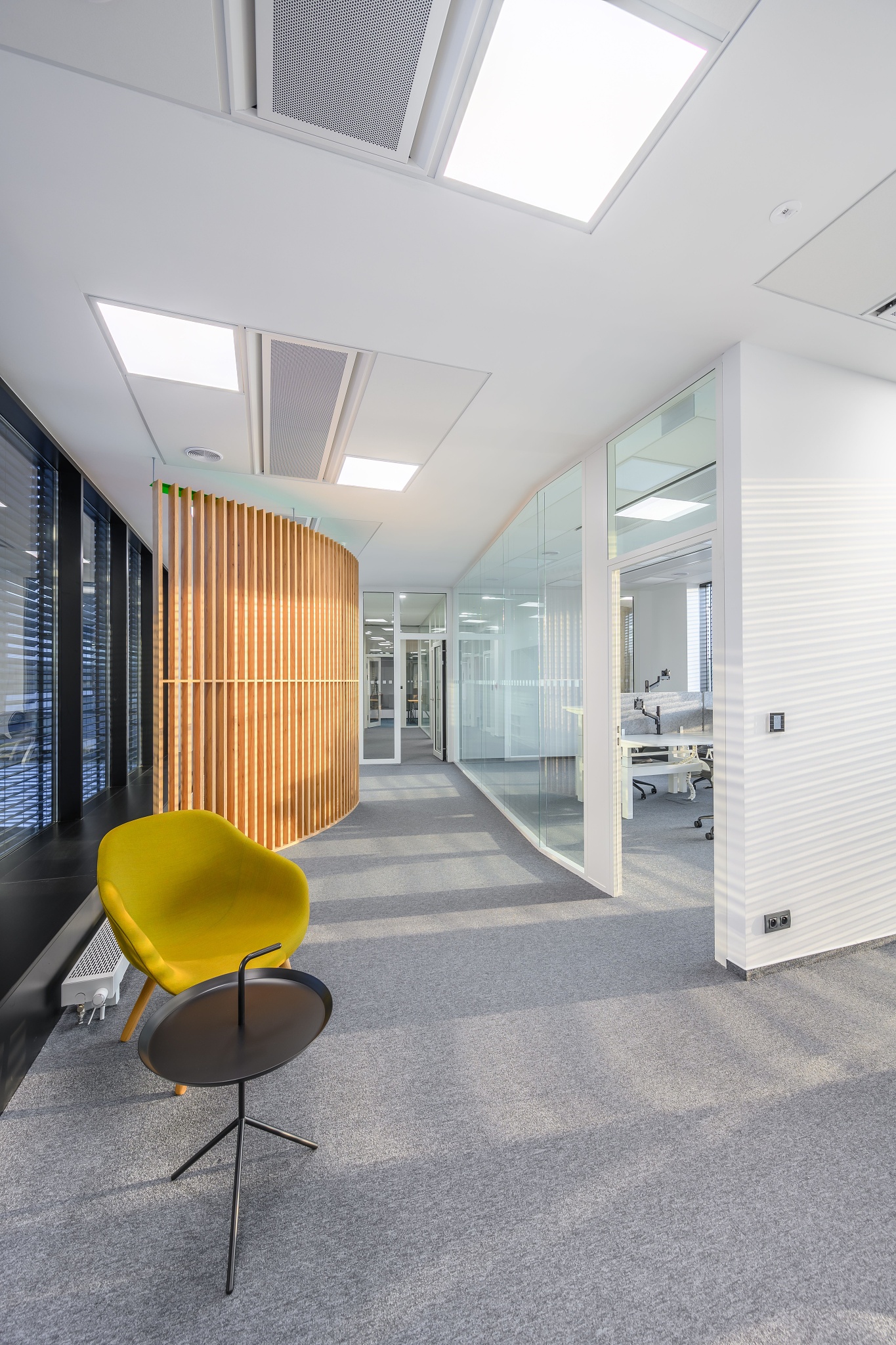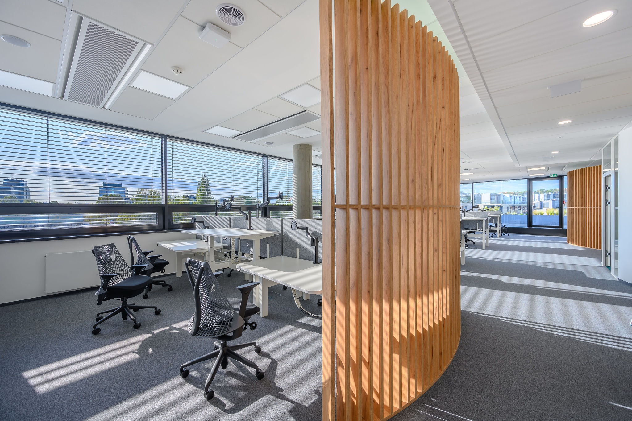 V nových prostorách společnosti Wrike zaznívají příjemné barevné přírodní tóny dřeva v kontrastu s přiznanou průmyslovou šedí pohledového betonu. To vše oživeno paletou jasných barev použitých na podlahových krytinách. Do takto komplexně řešeného projektu jsme přispěli jednak mnoha originálními prvky atypického nábytku, ale také našimi osvědčenými evergreeny od společnosti Herman Miller, Hay a Enea. Pracoviště jsme vybavili ergonomickou novinkou od CBS - rameny Lima a skvělými kancelářskými židlemi Sayl. Naopak zasedací místnosti zdobí naše řada meetingových stolů cre8 Puzzle a aby ladily s pracovišti, i zde jsou použity židle Sayl, ovšem ve své zasedací podobě. Jedním prvkem tak vznikl propojený harmonický celek.