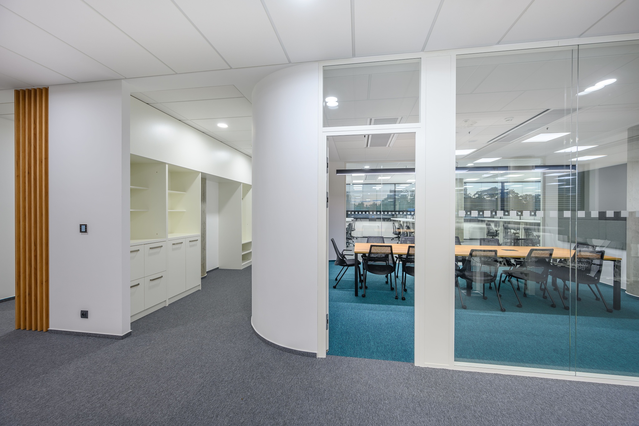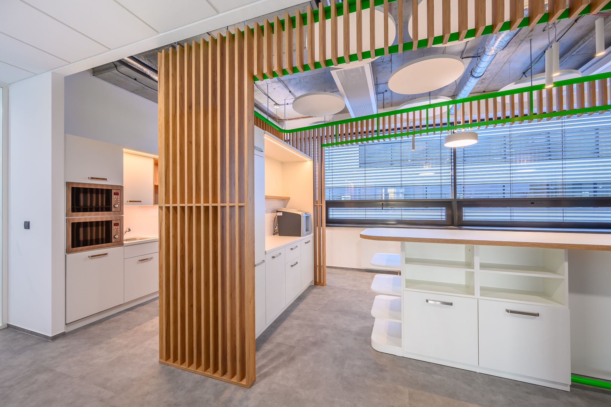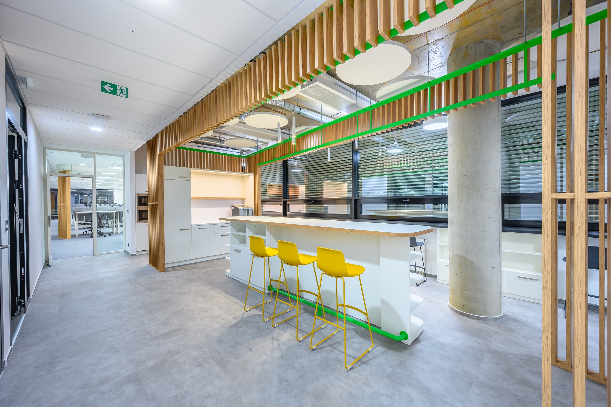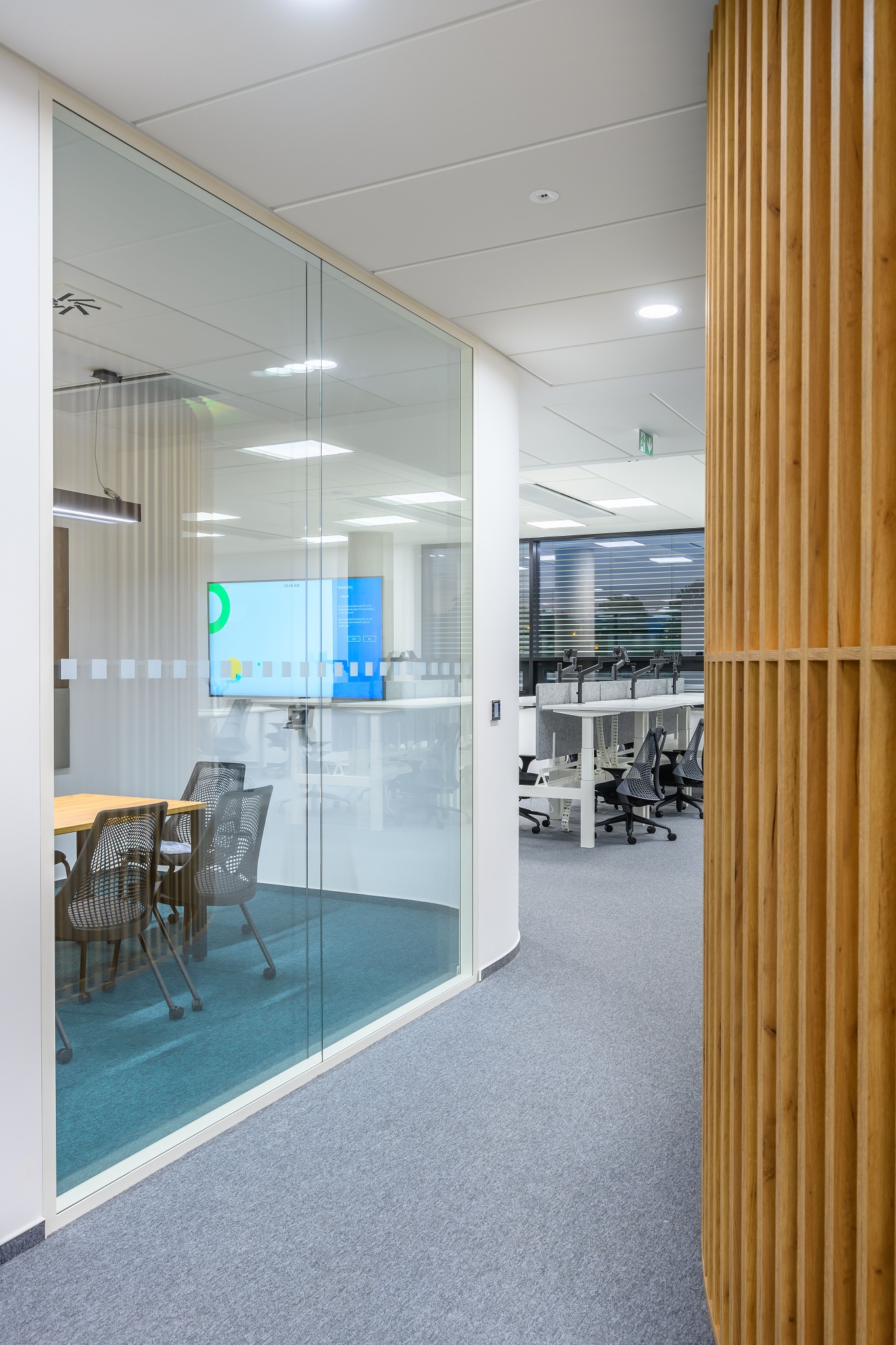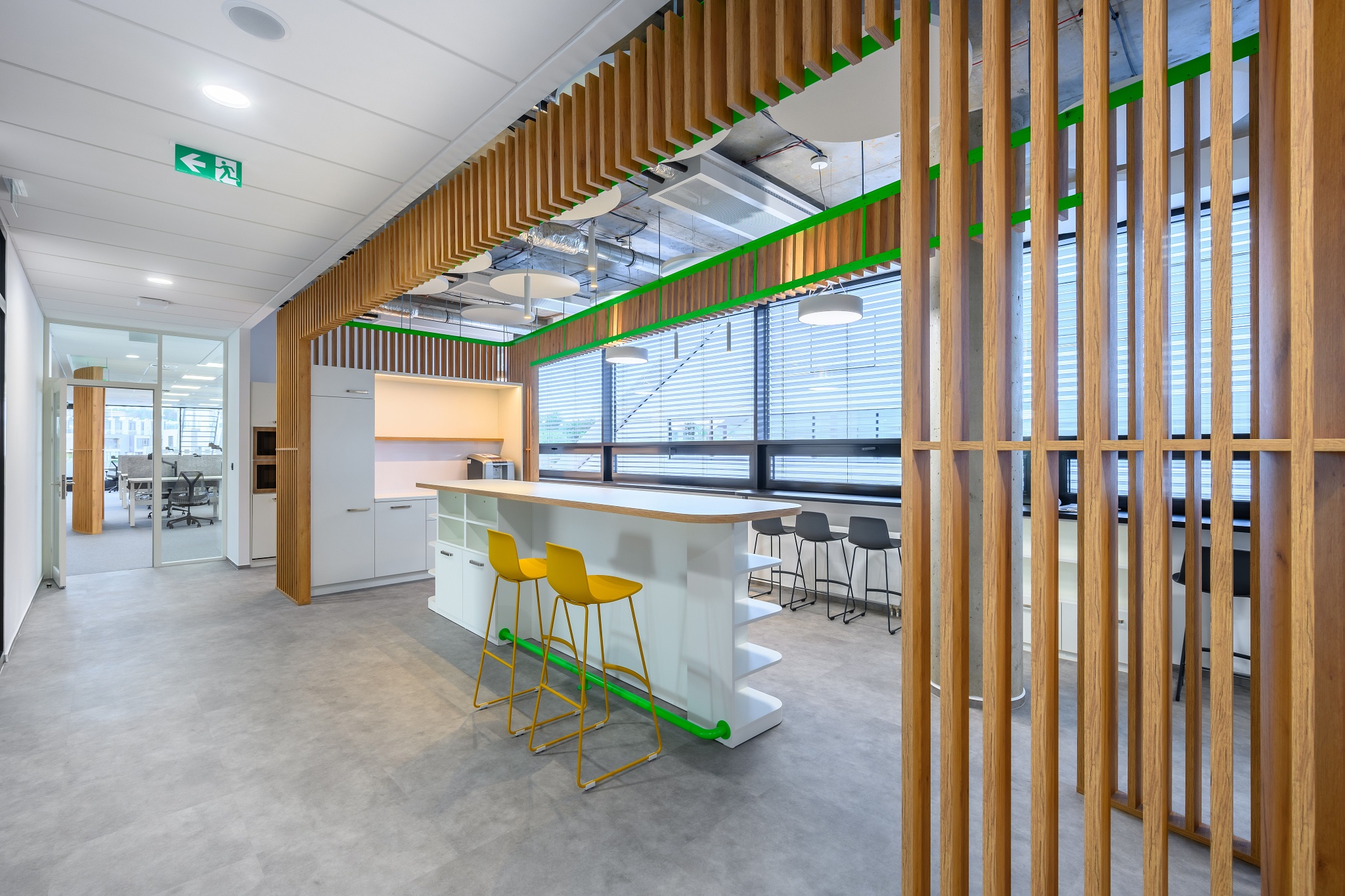 V nových prostorách společnosti Wrike zaznívají příjemné barevné přírodní tóny dřeva v kontrastu s přiznanou průmyslovou šedí pohledového betonu. To vše oživeno paletou jasných barev použitých na podlahových krytinách. Do takto komplexně řešeného projektu jsme přispěli jednak mnoha originálními prvky atypického nábytku, ale také našimi osvědčenými evergreeny od společnosti Herman Miller, Hay a Enea. Pracoviště jsme vybavili ergonomickou novinkou od CBS - rameny Lima a skvělými kancelářskými židlemi Sayl. Naopak zasedací místnosti zdobí naše řada meetingových stolů cre8 Puzzle a aby ladily s pracovišti, i zde jsou použity židle Sayl, ovšem ve své zasedací podobě. Jedním prvkem tak vznikl propojený harmonický celek.