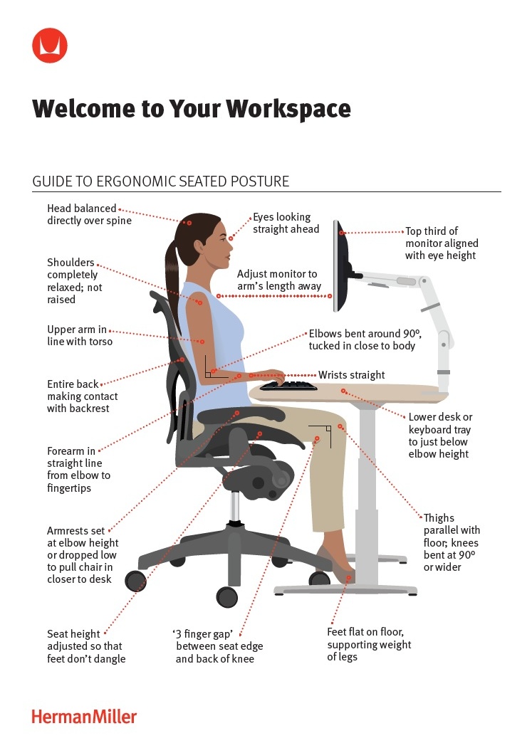 Sitting posture: Make sure you sit upright (but slightly back of 90 degrees) with your back against the chair and shoulders relaxed. Keep your neck straight and avoid hunching forward.
