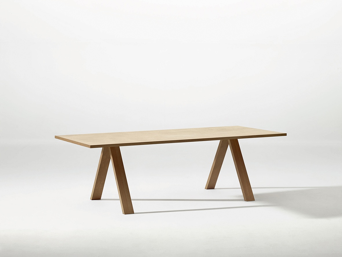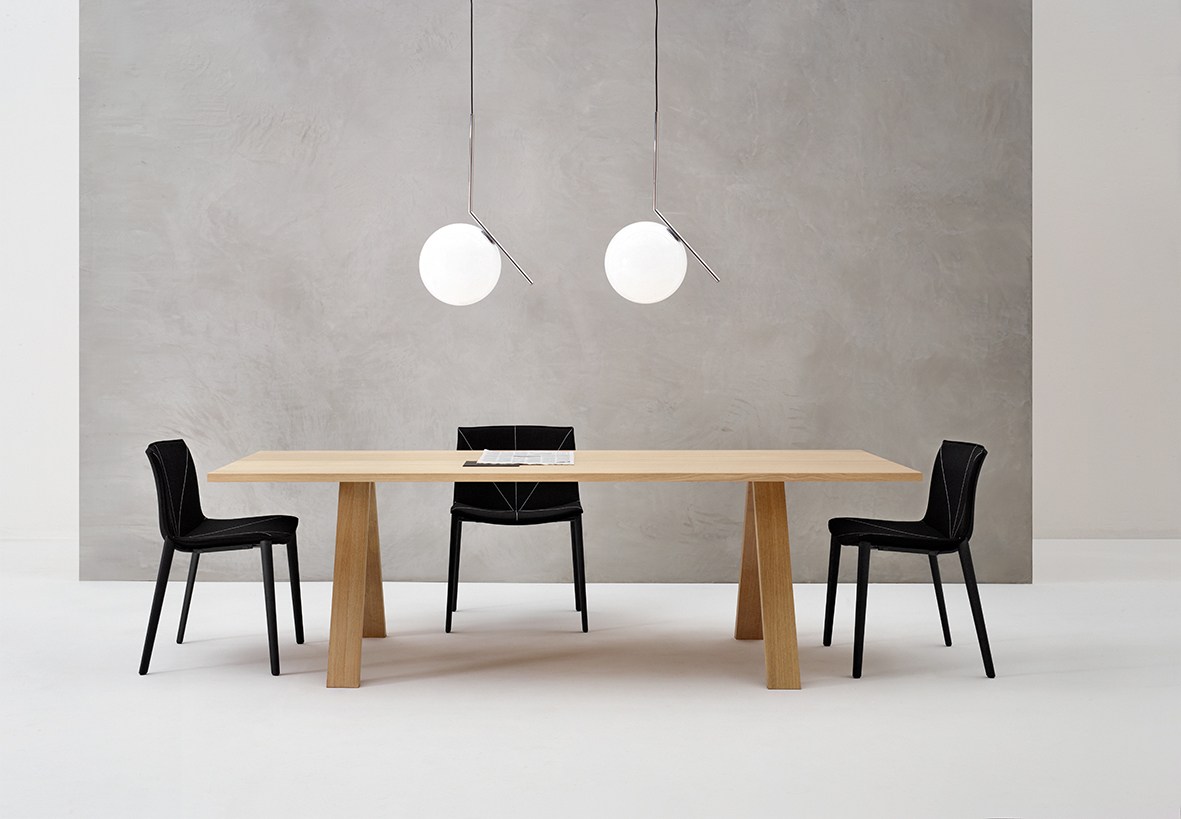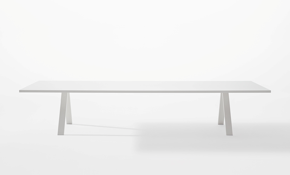 Thanks to optional configuration arrangements it can serve as a temporary meeting ground for group gatherings or a communal work station with room enough to share. The table’s substantial length, both minimal and architectural, features a sturdy structure with ample space to create.