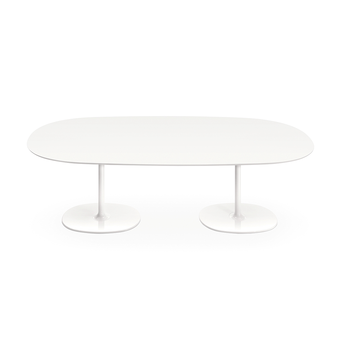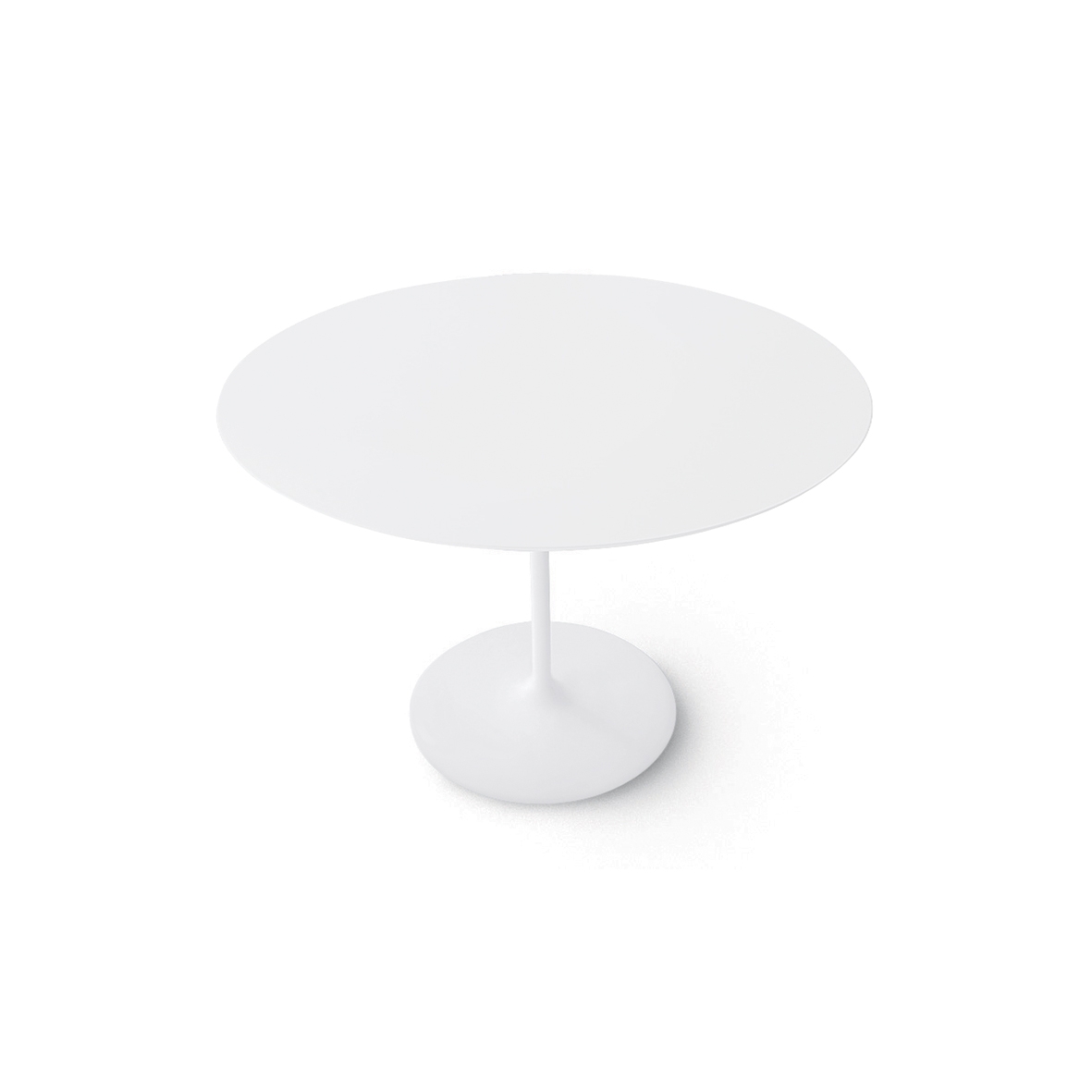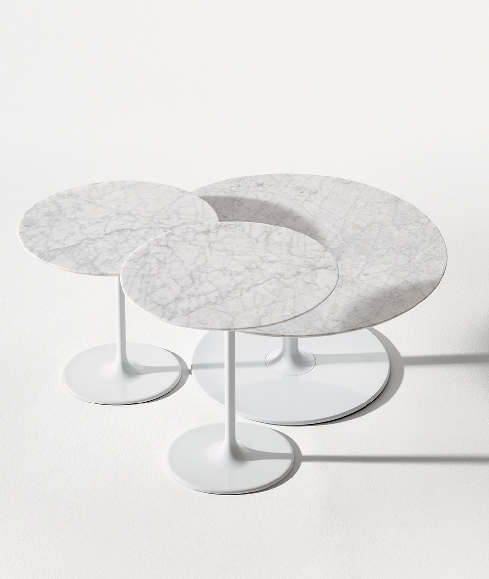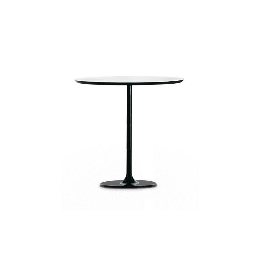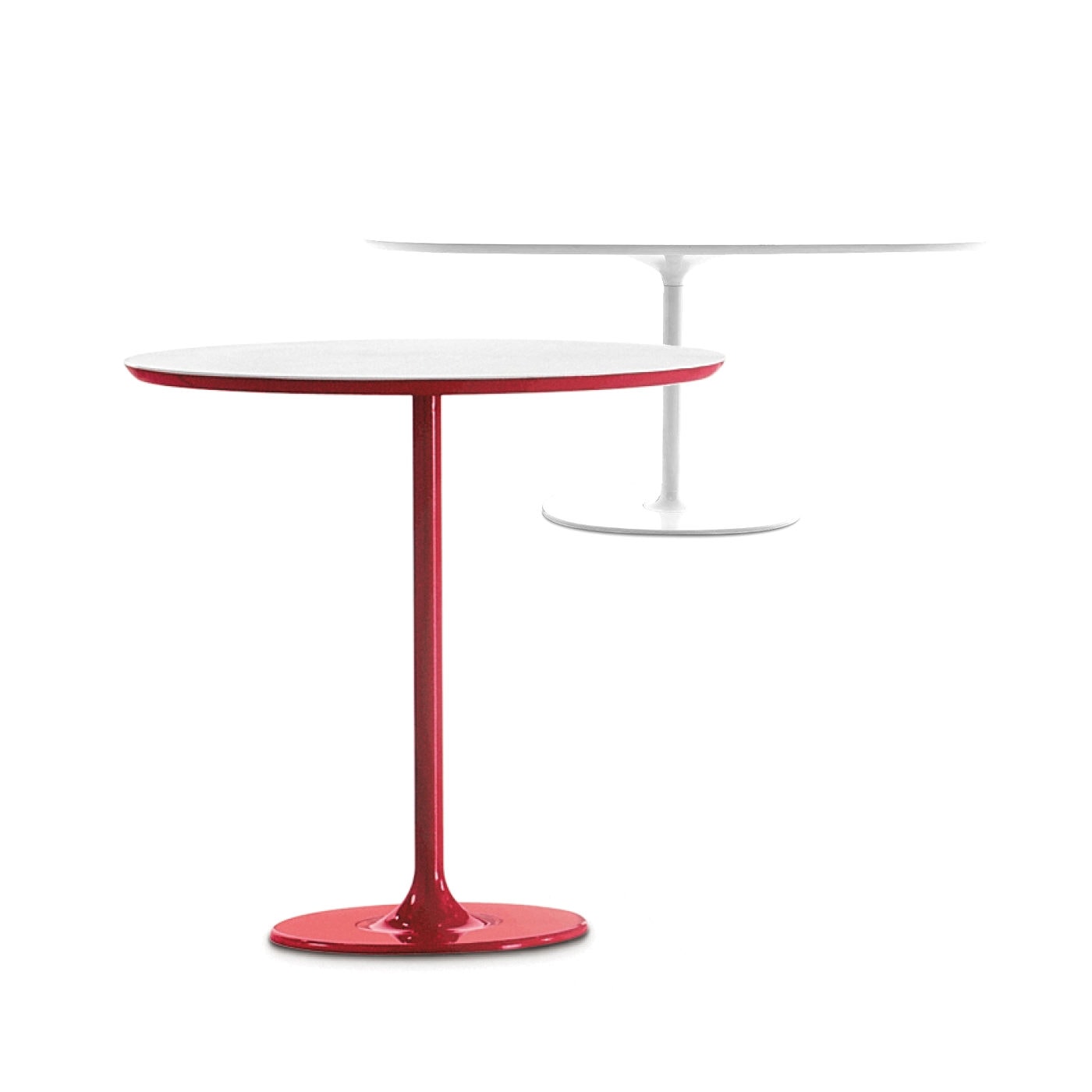 Table bases are available in chrome or white-lacquered steel. White MDF or laminate tops are available in large, small, round or square oval. The h 50 version with oval base is available lacquered in four vibrant colors––moka, red, sand and black––in addition to white.