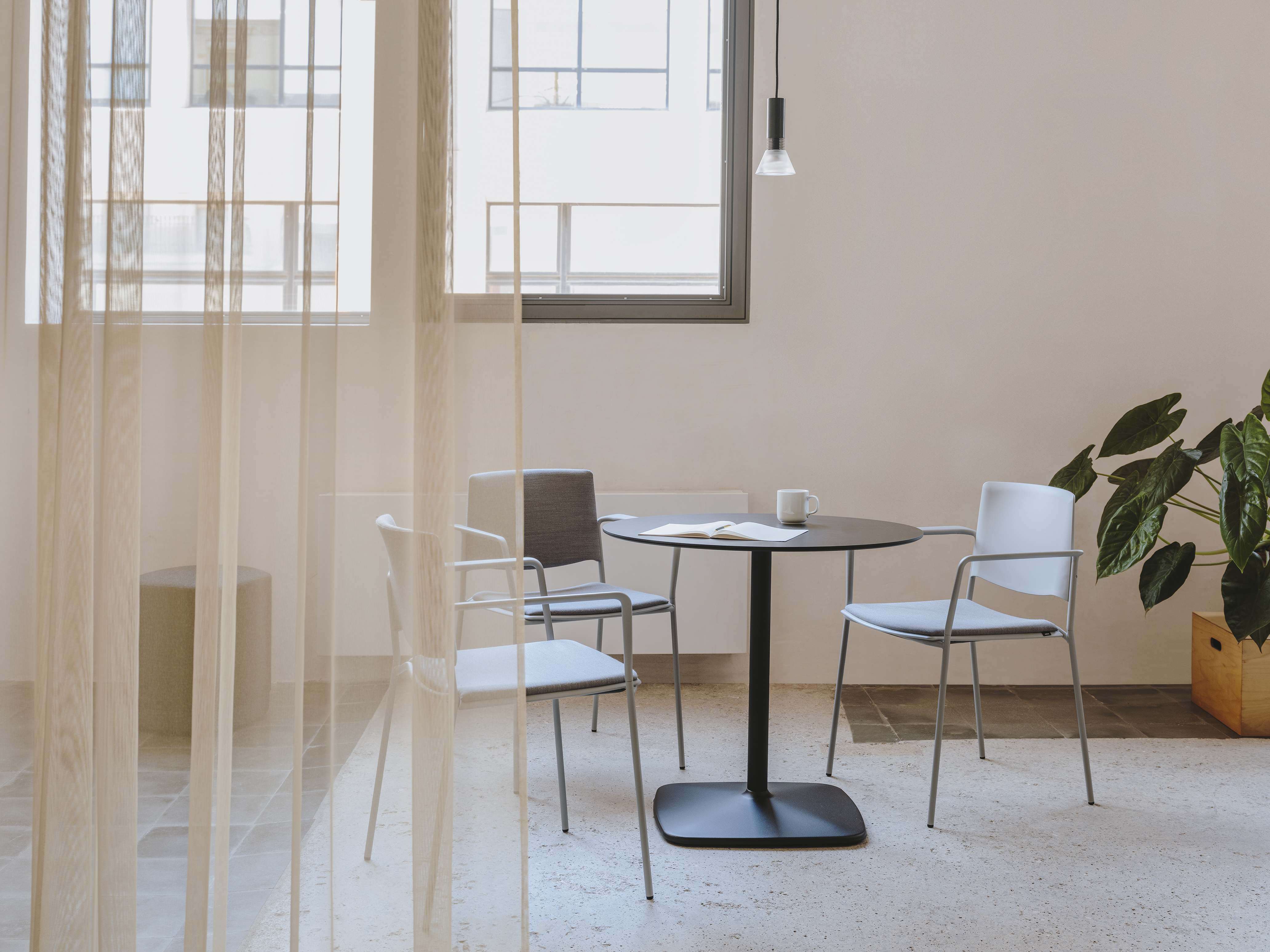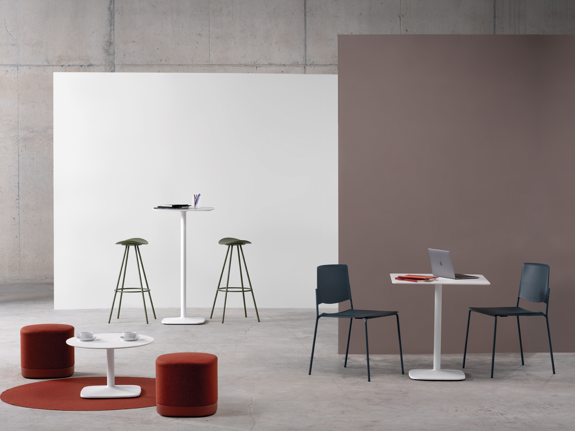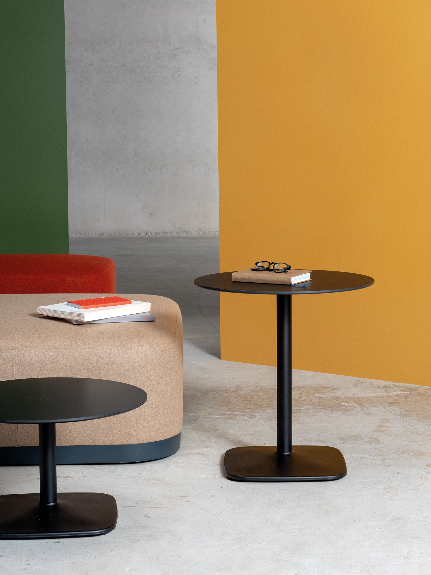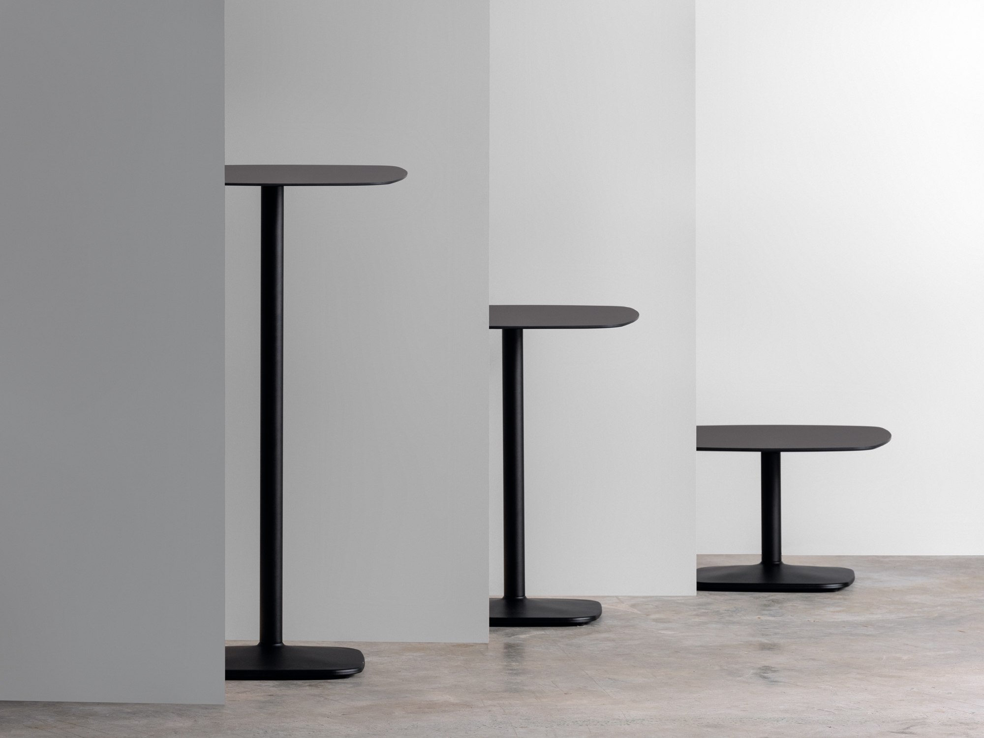 The Iron table range all boast an elegant, architectural steel base. The lacquered steel base provides absolute stability, while different heights and shapes offer variations ideal for any setting.