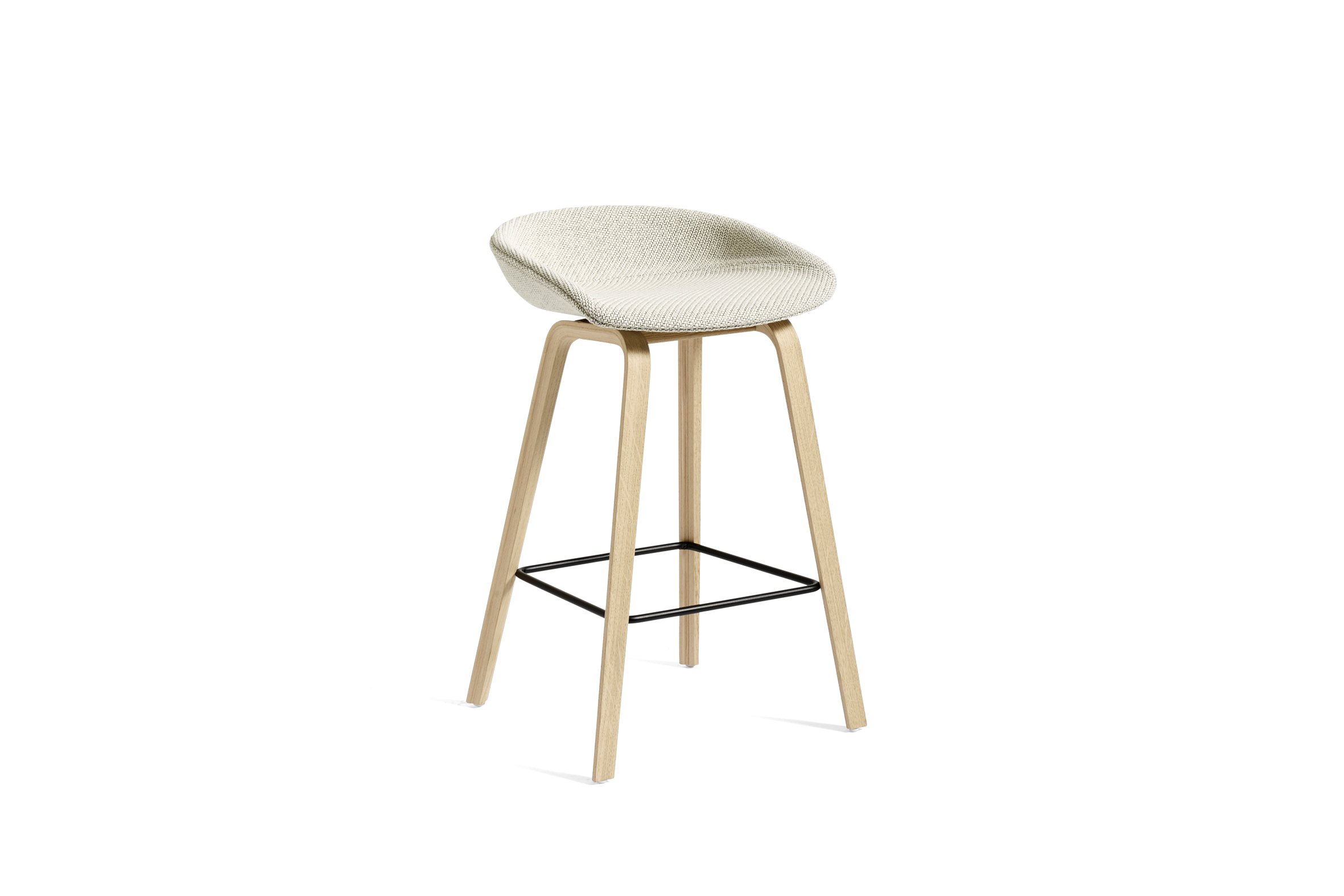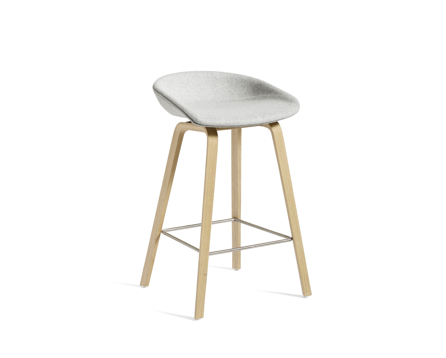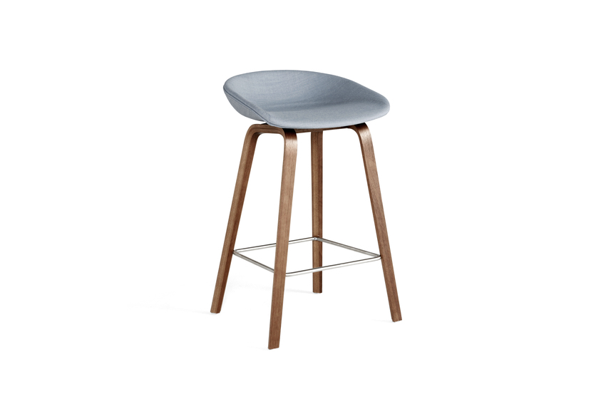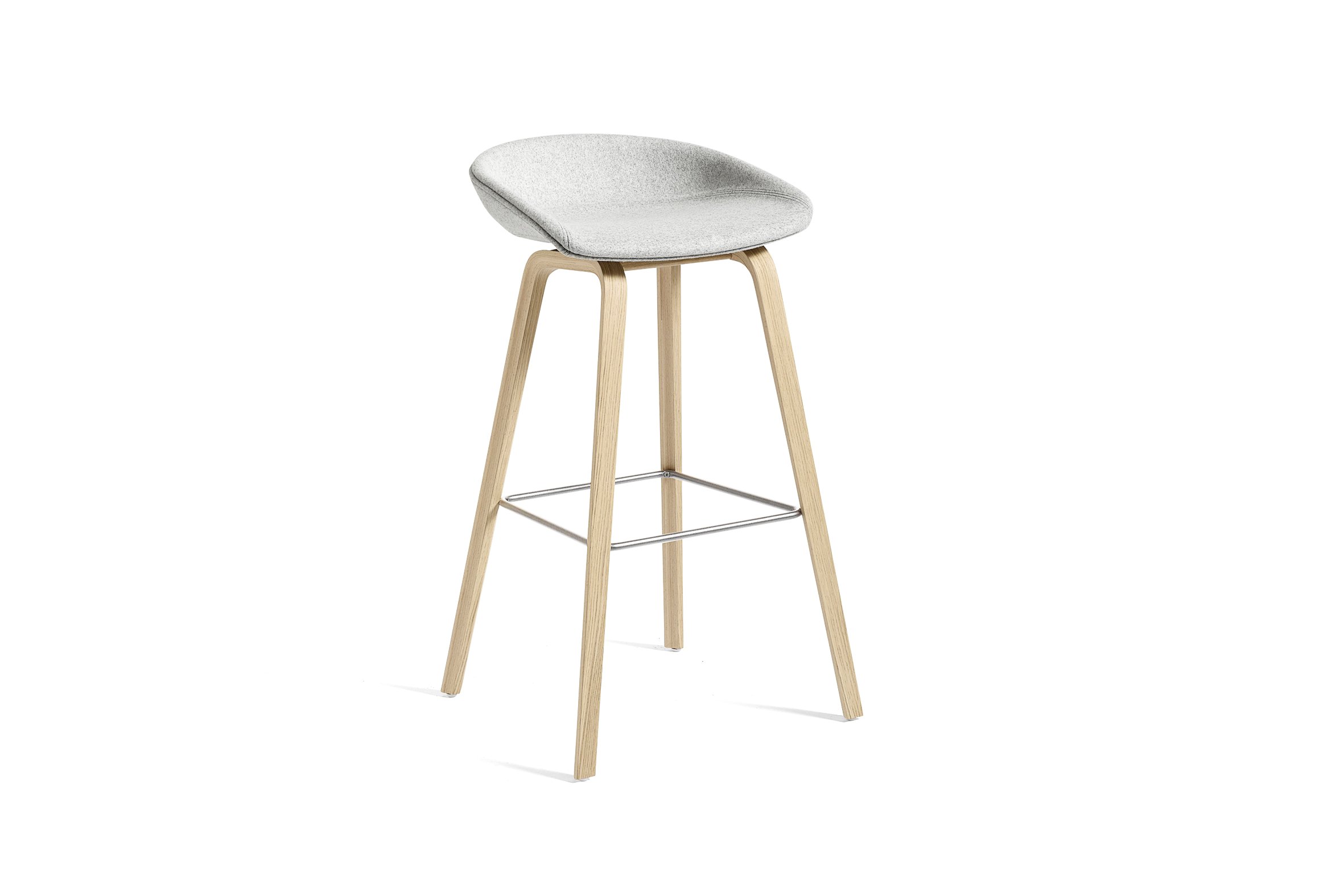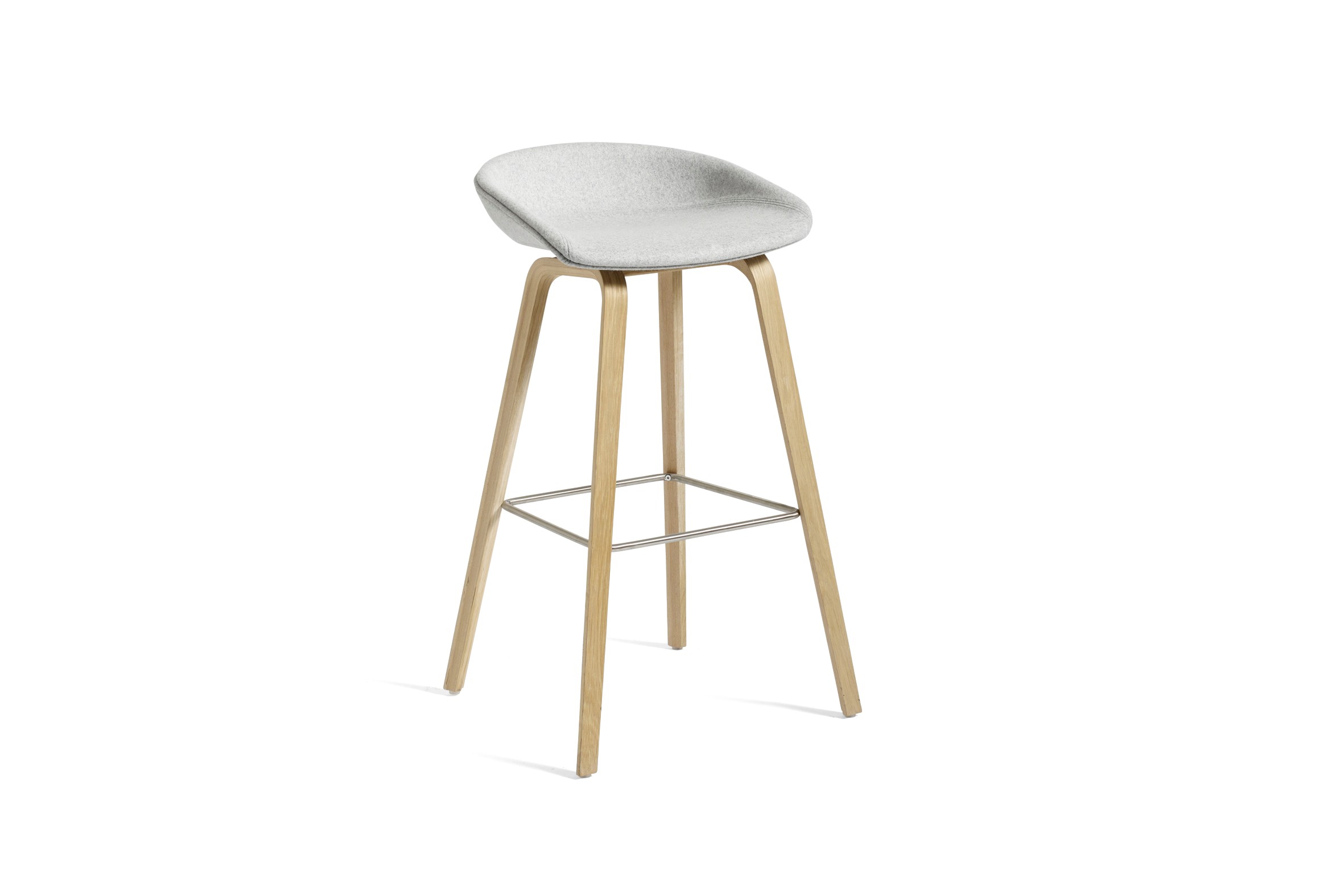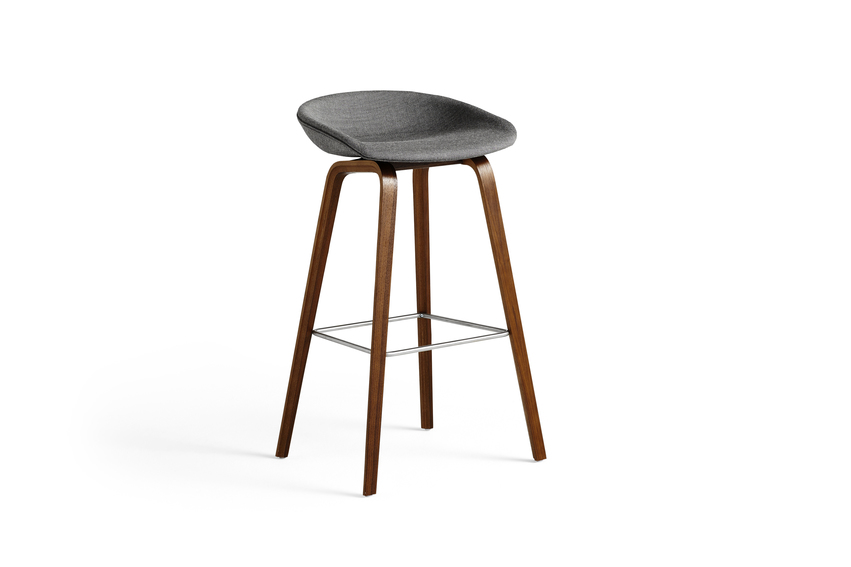 Full-bodied upholstered version. With a curved backrest and long, elegant wooden legs is ideal as a bar stool in a public environment. Available in two heights and in a range of wood finishes and colours.