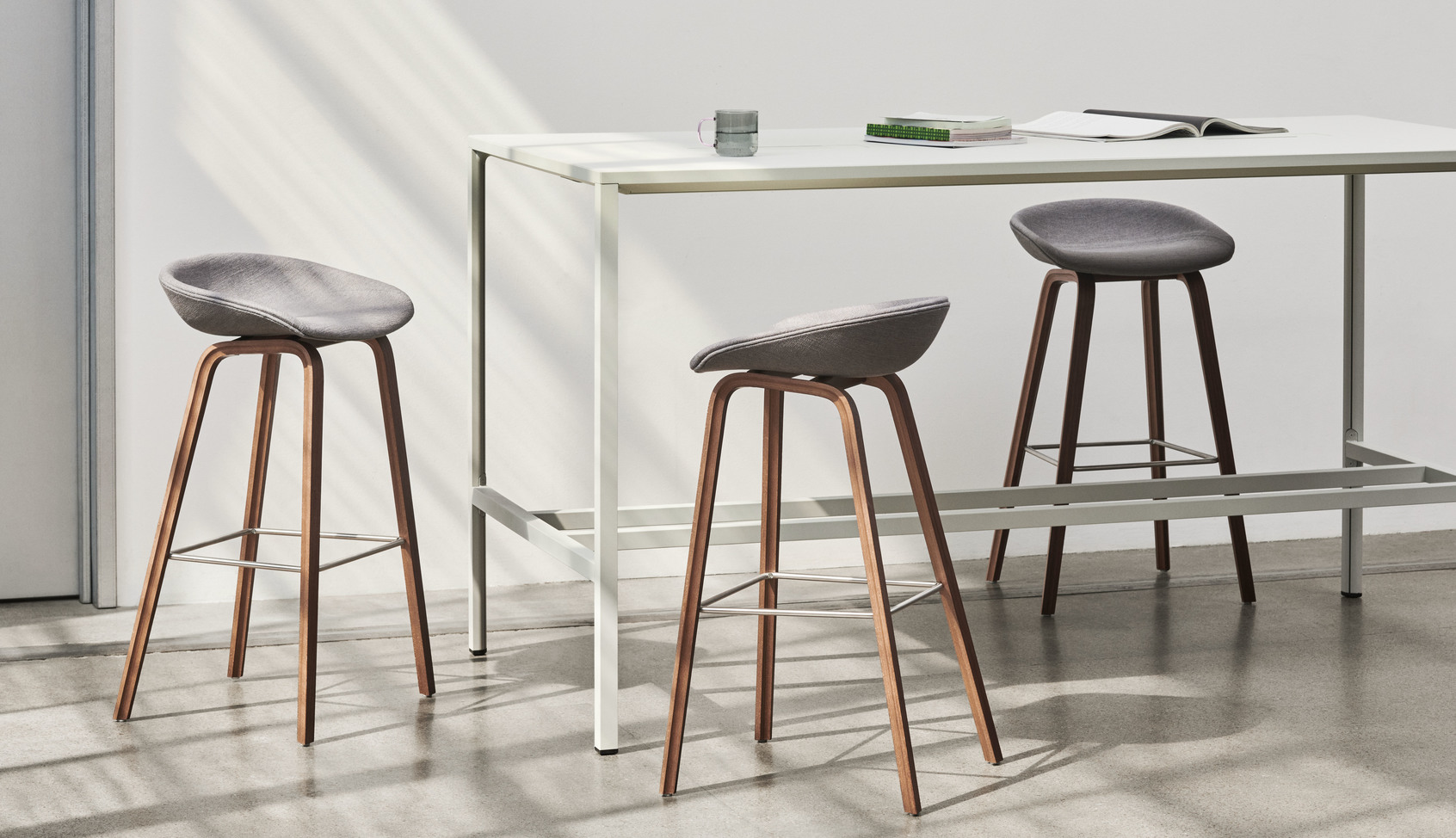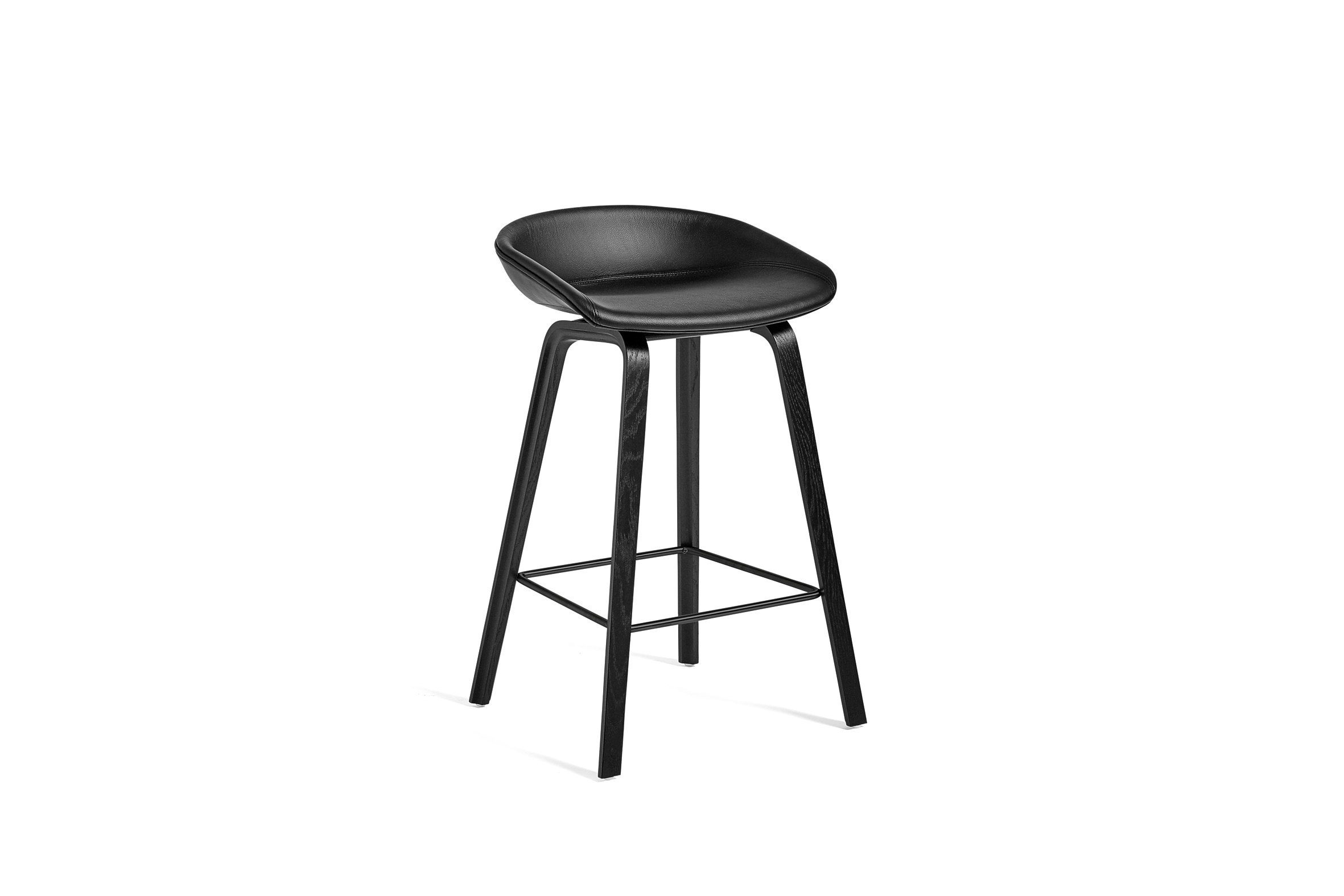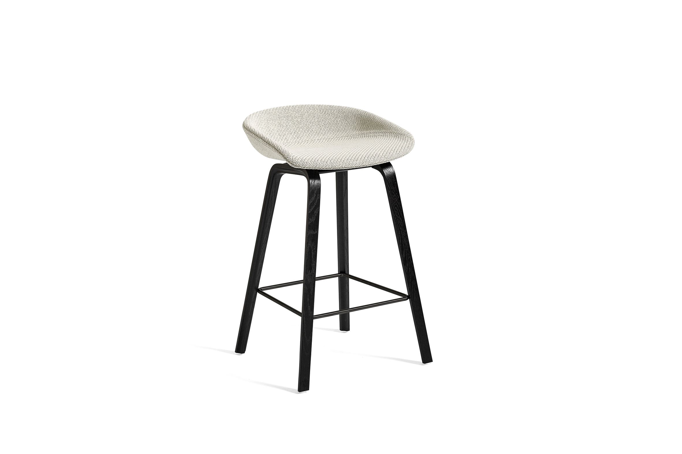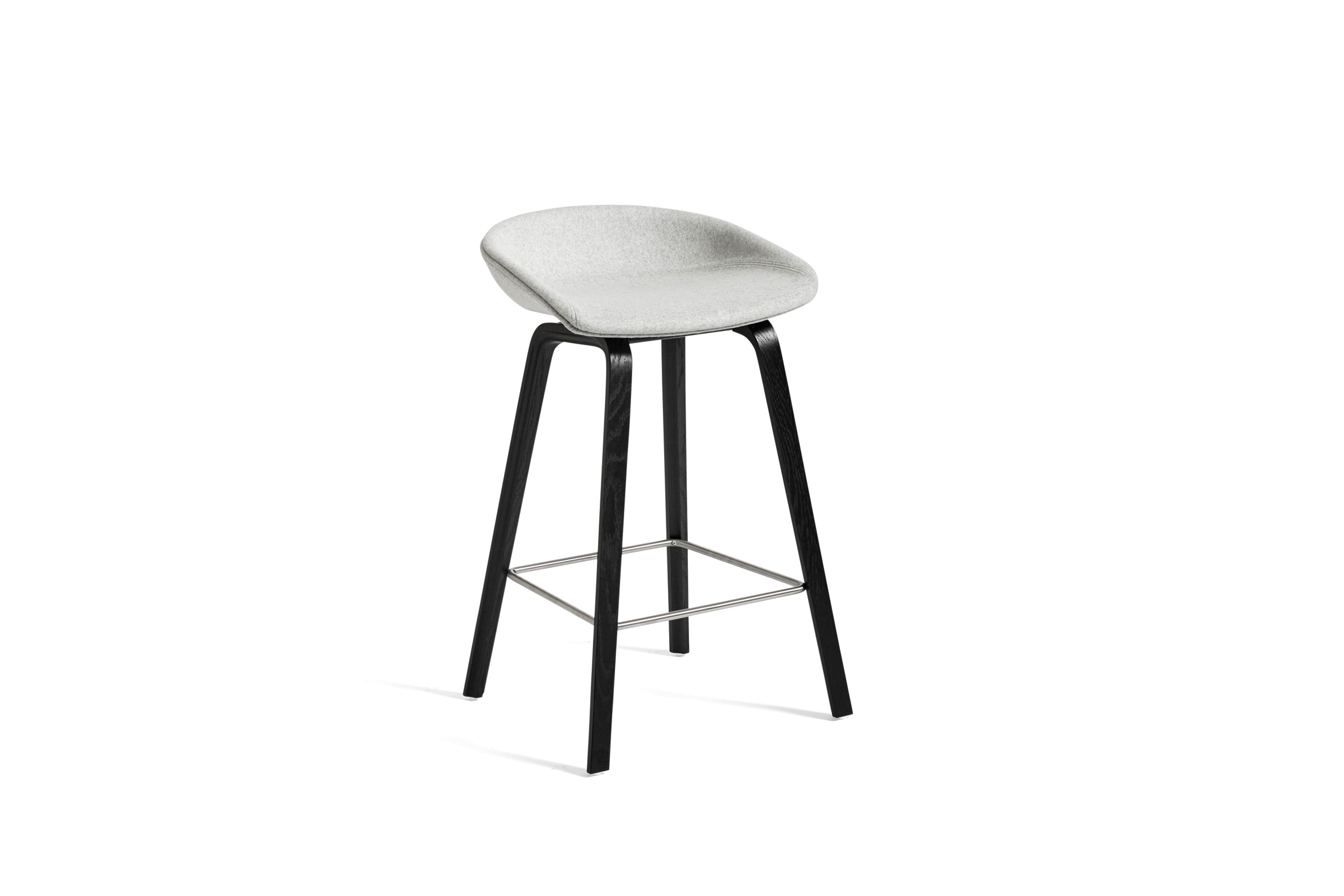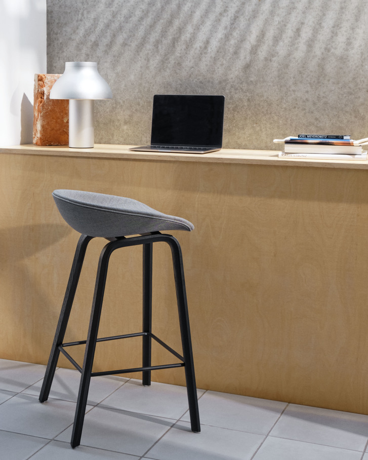 Full-bodied upholstered version. With a curved backrest and long, elegant wooden legs is ideal as a bar stool in a public environment. Available in two heights and in a range of wood finishes and colours.