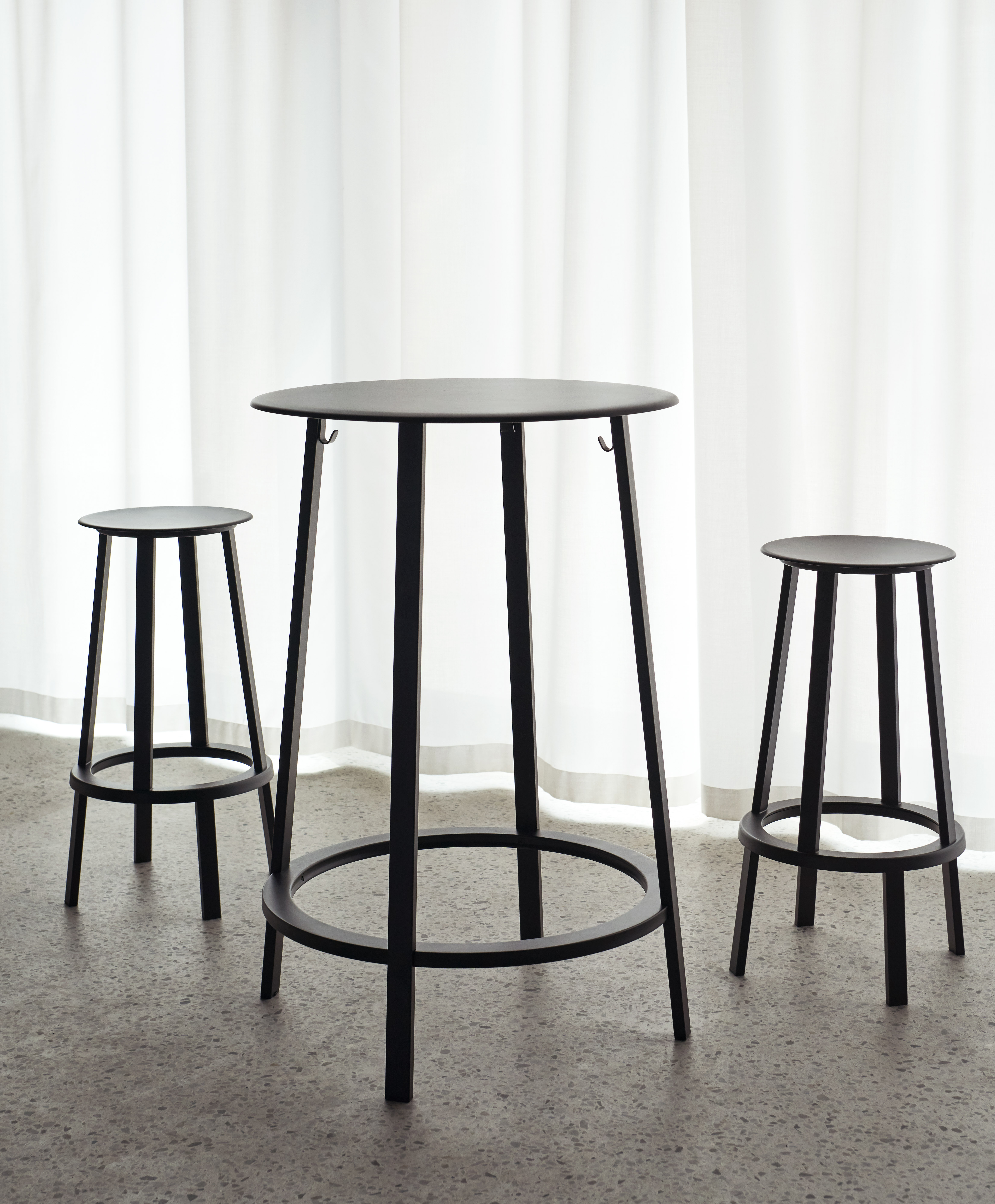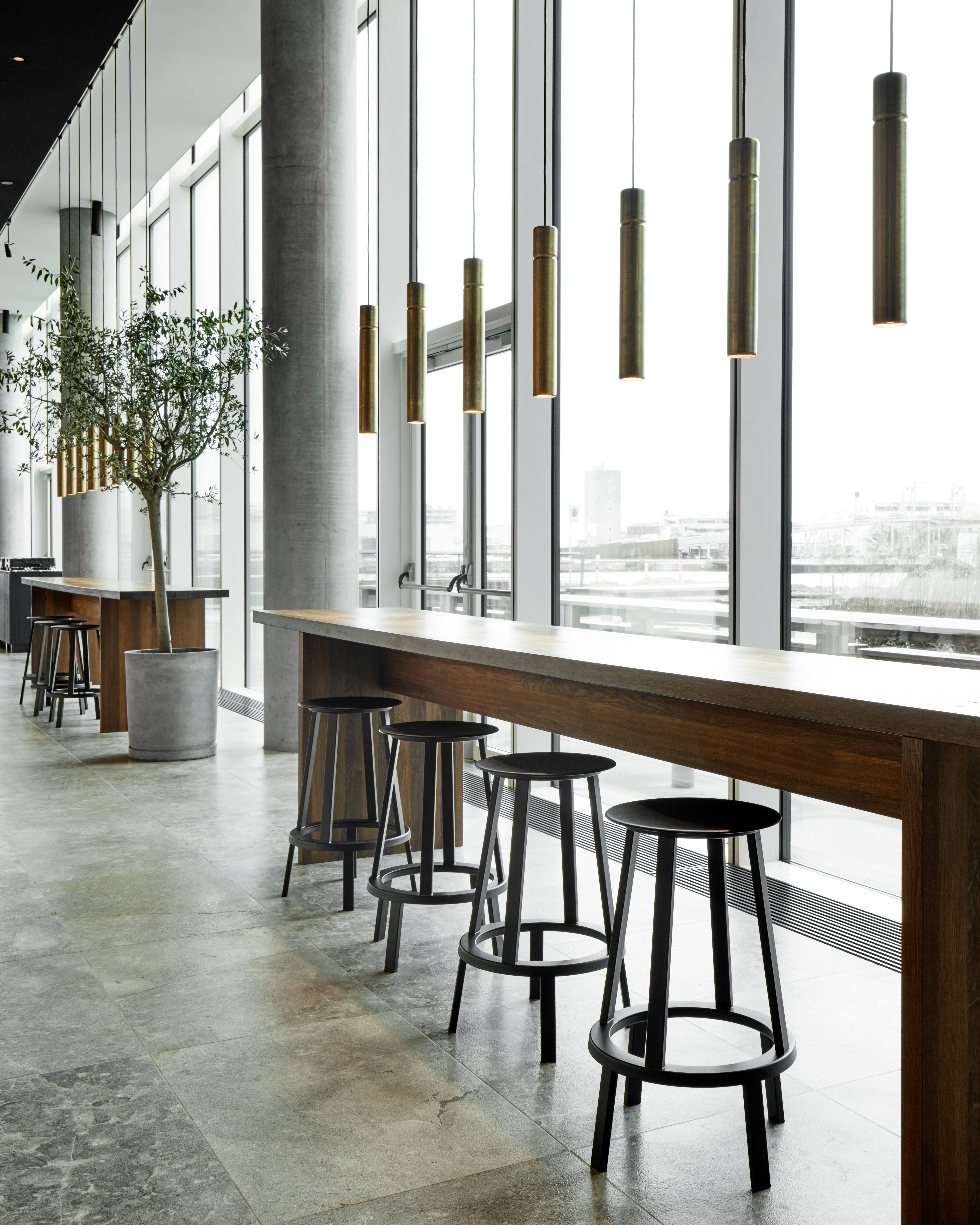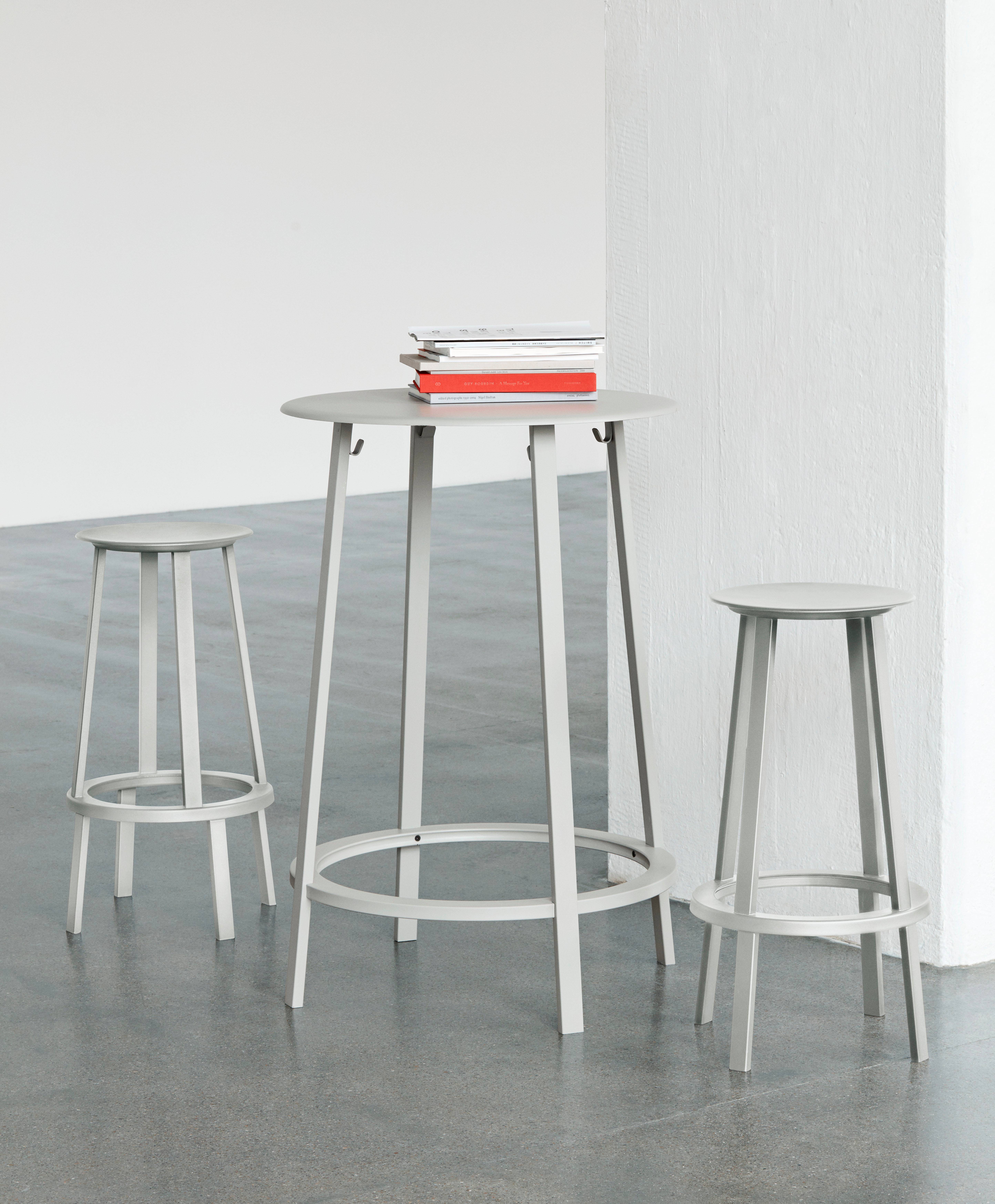 The slim, slightly dished seat features curved edges for additional comfort, while the footrest provides support and the weighty base creates total stability. Available in two heights and a choice of coatings, its versatile presence makes it suitable for a wide range of public and residential environments.