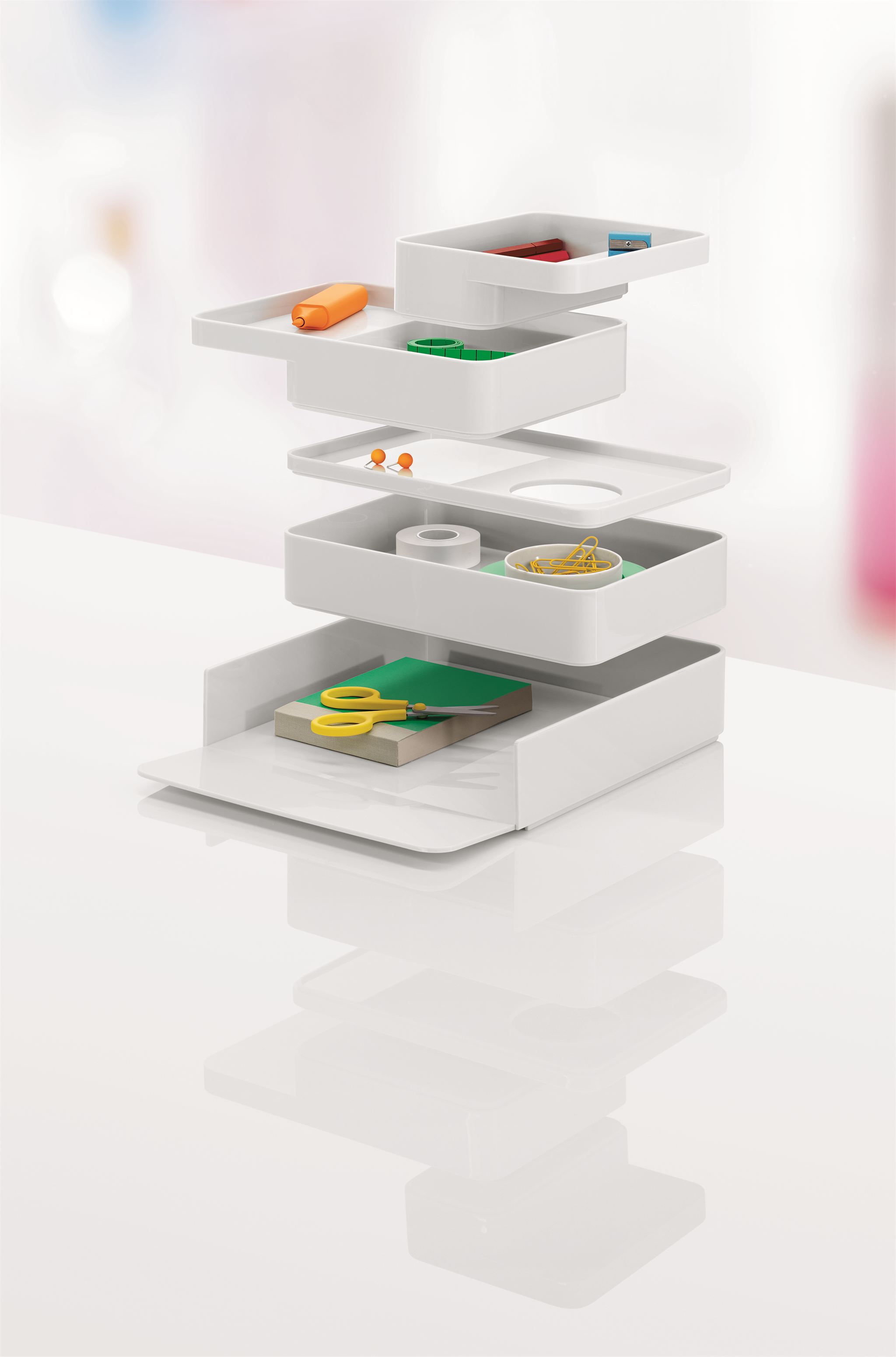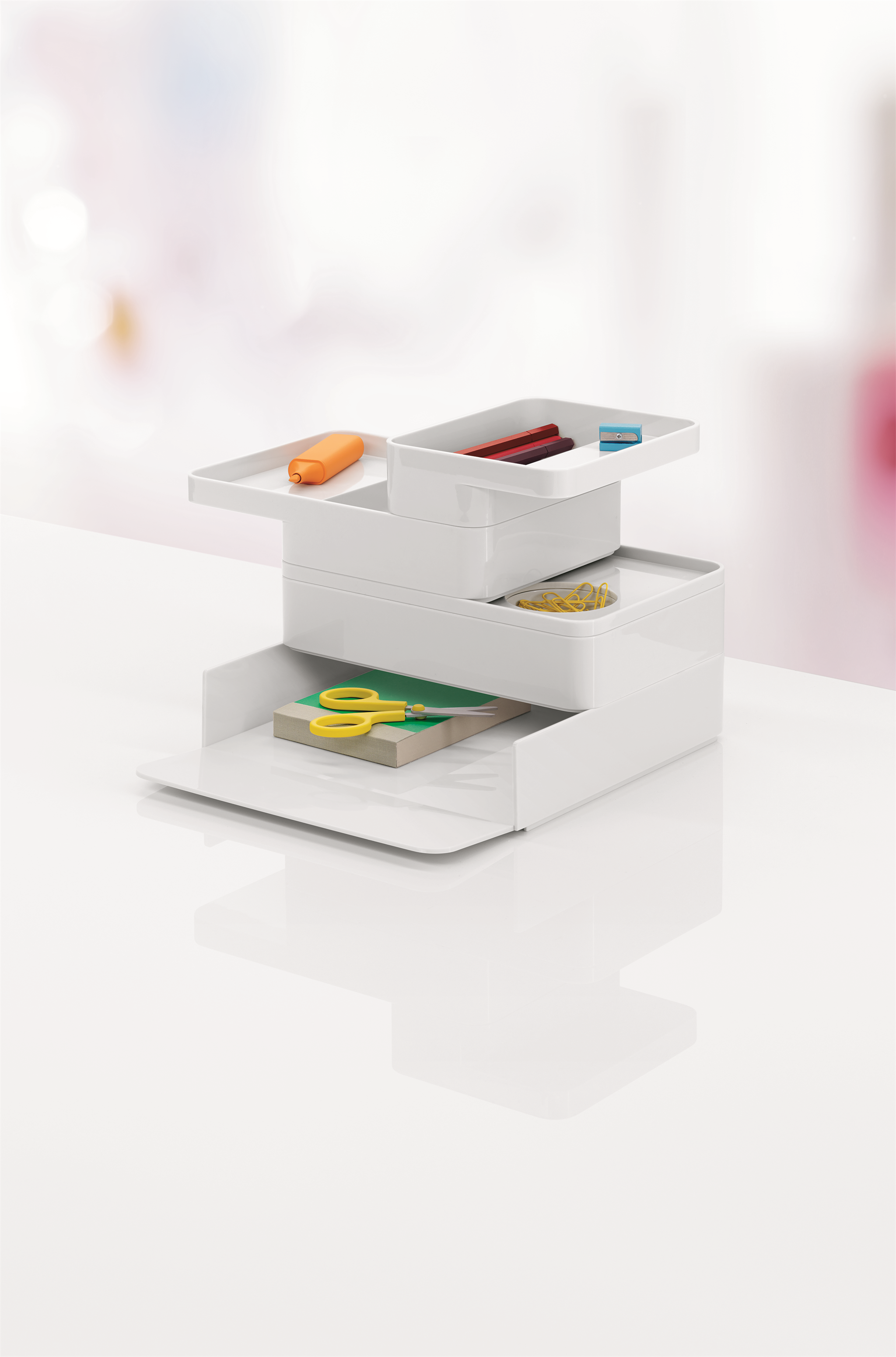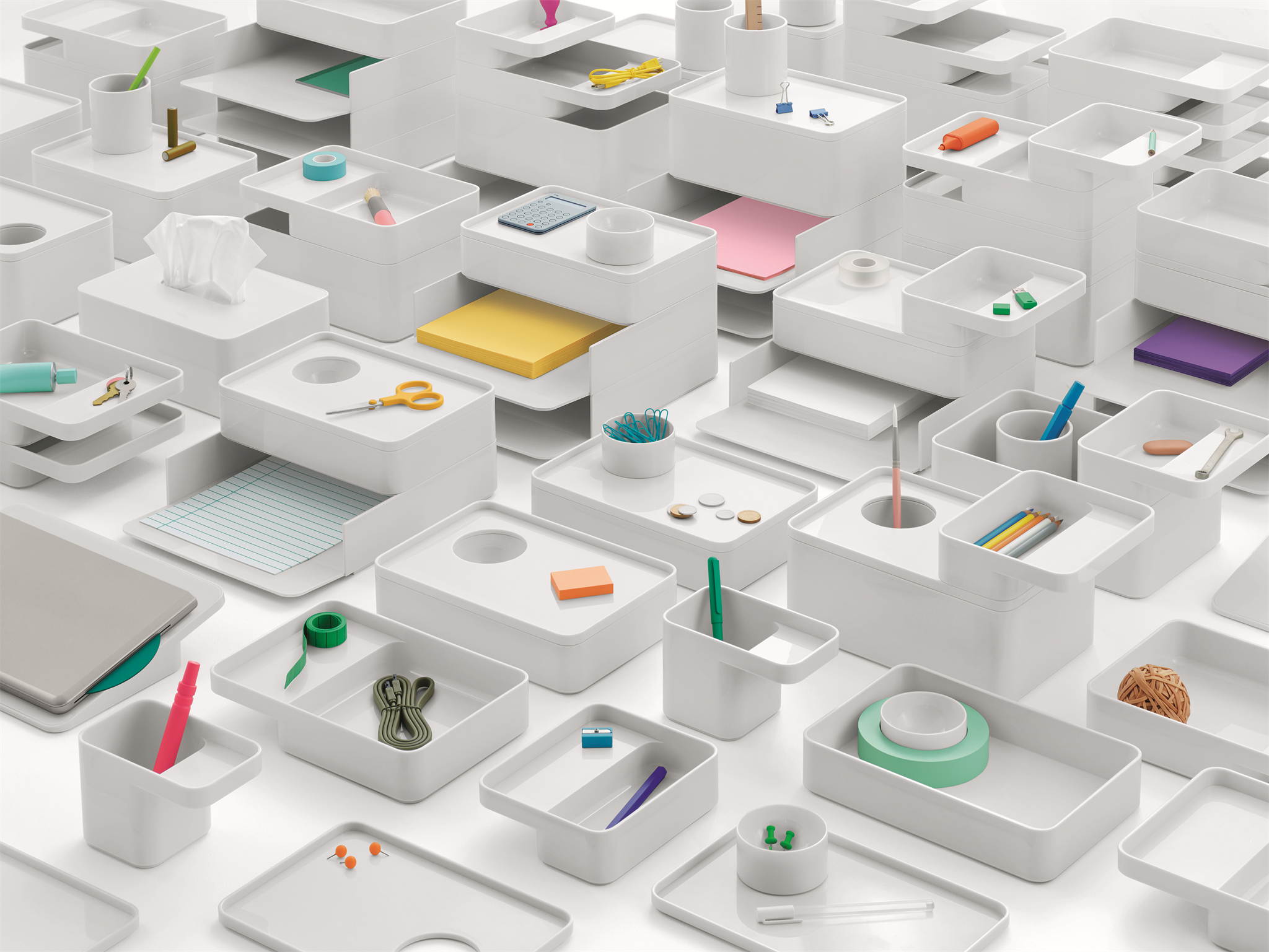 Formwork stackable desktop storage helps you bring order to your papers, tools and artefacts. With shapes and sizes that were rigorously considered to relate an intuitive sense of utility, the accessories may be stacked and combined in any way you see fit. Each form is shaped in ABS plastic. Some pieces also include a non-slip silicone base.