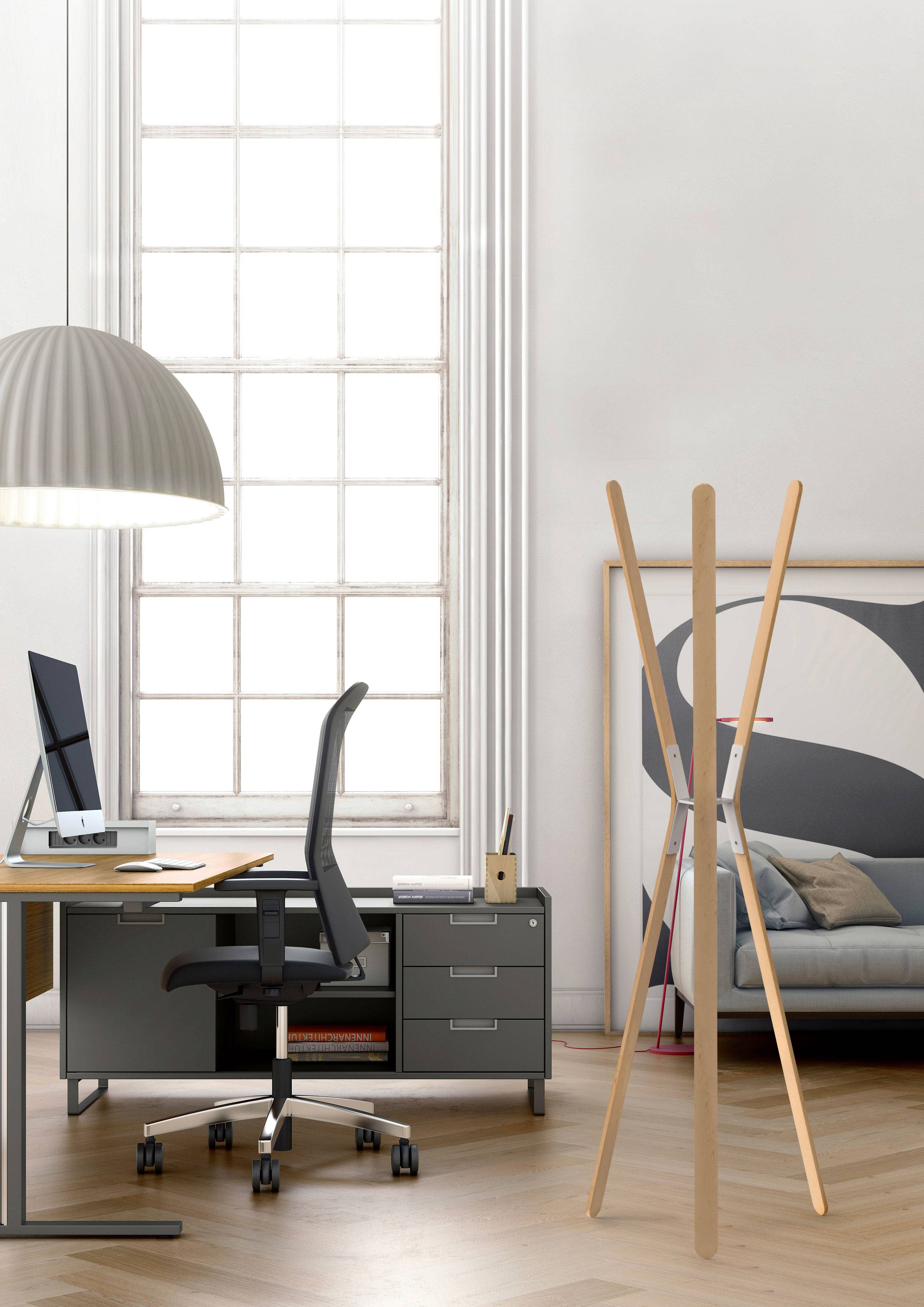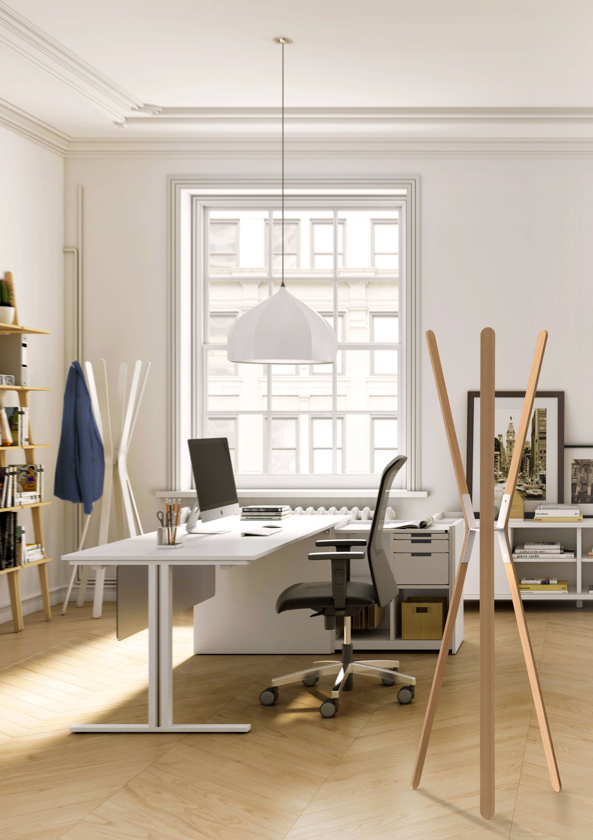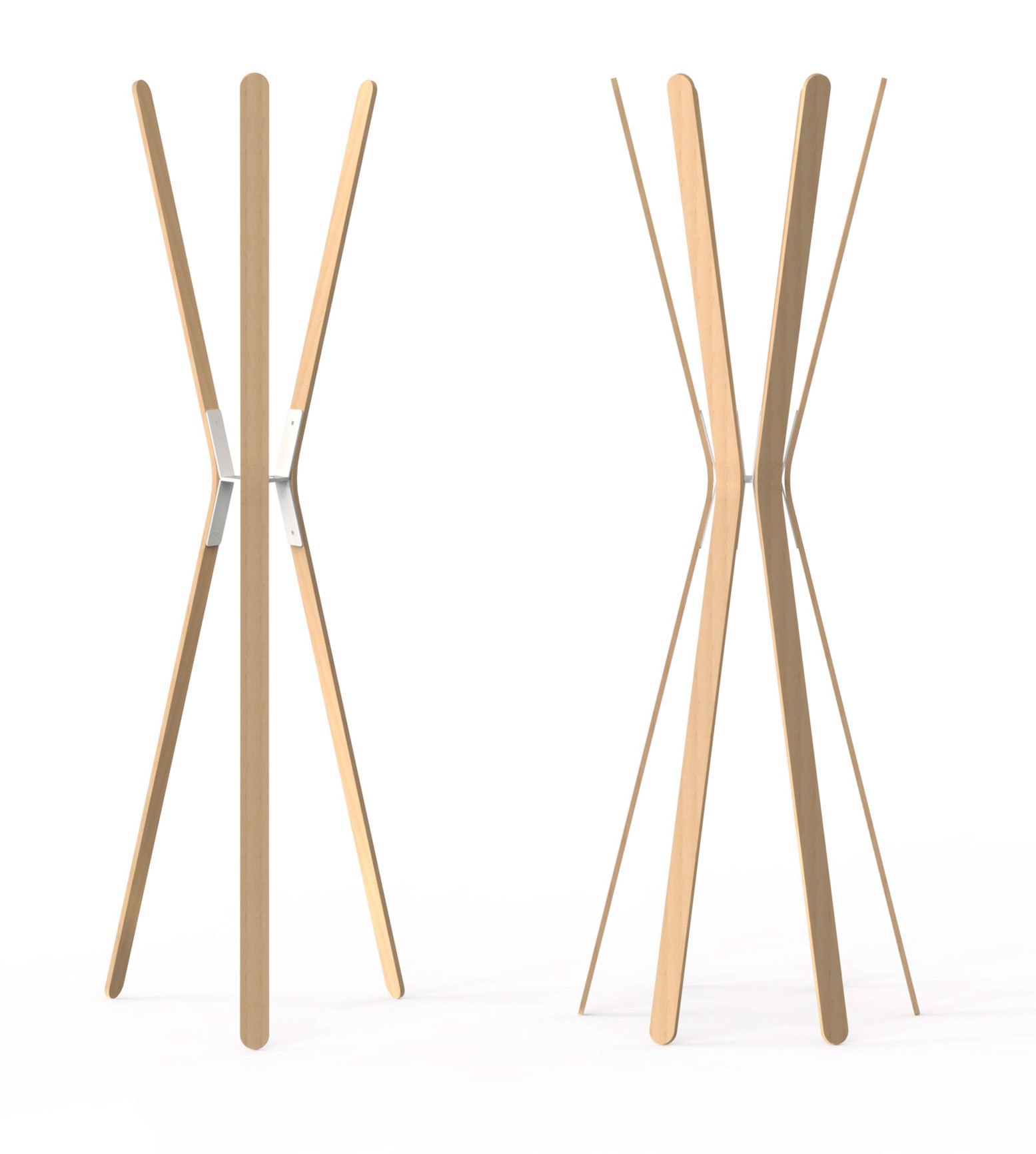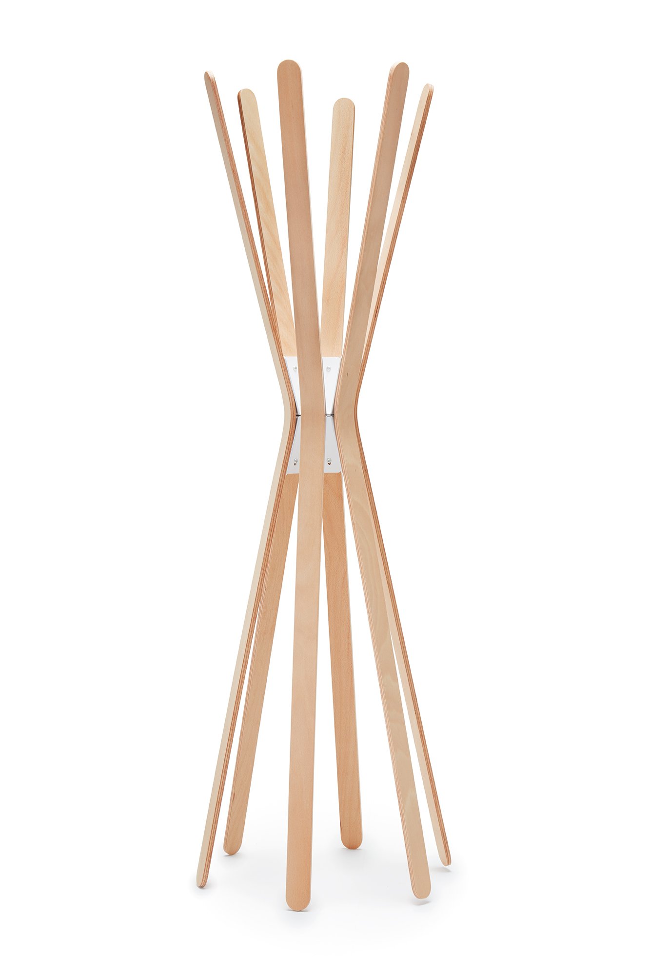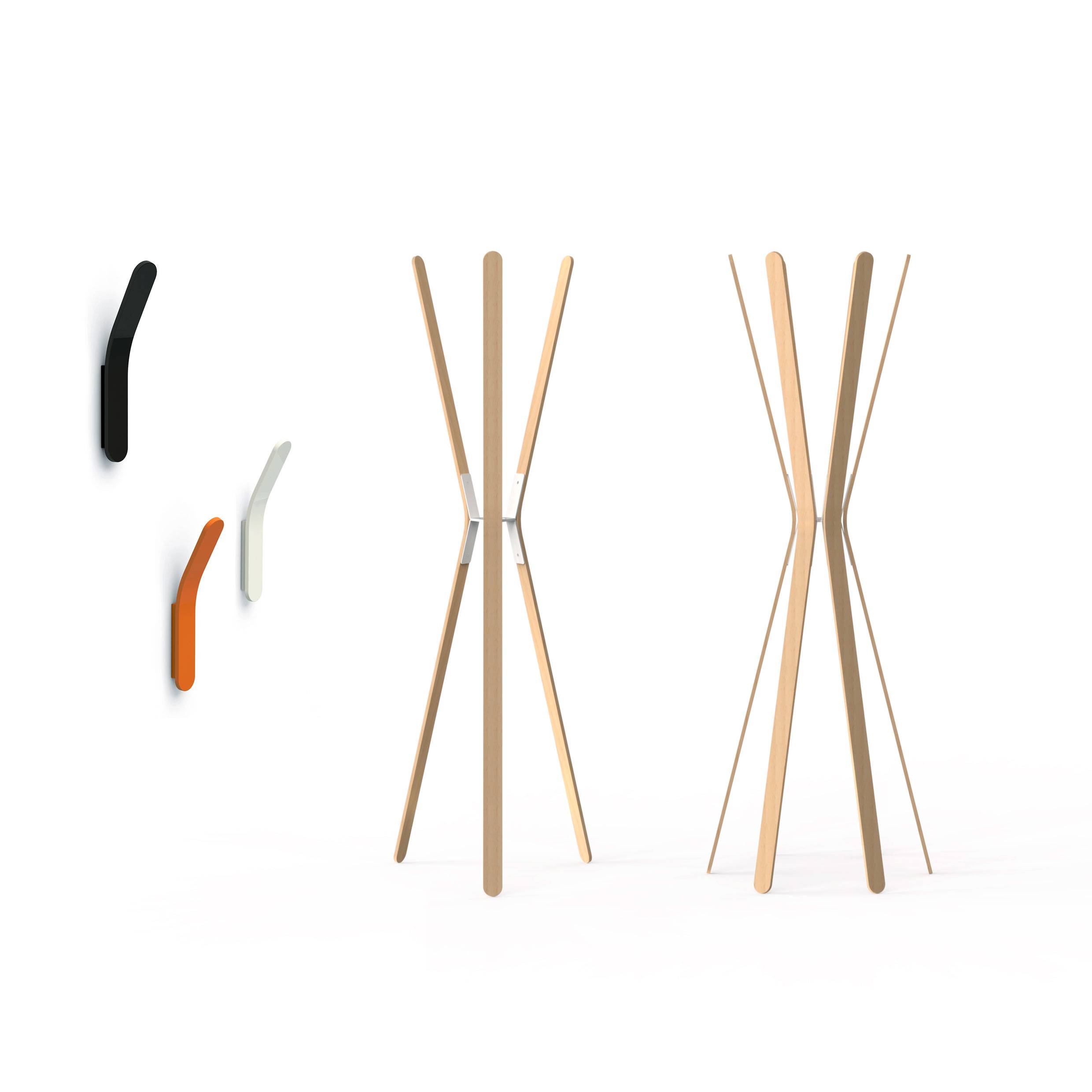 Coat stand made of 3 or 6 curved beechwood slats. Minimalist design to integrate into a variety of environments, homes, offices and retail. Wall version in metal available.