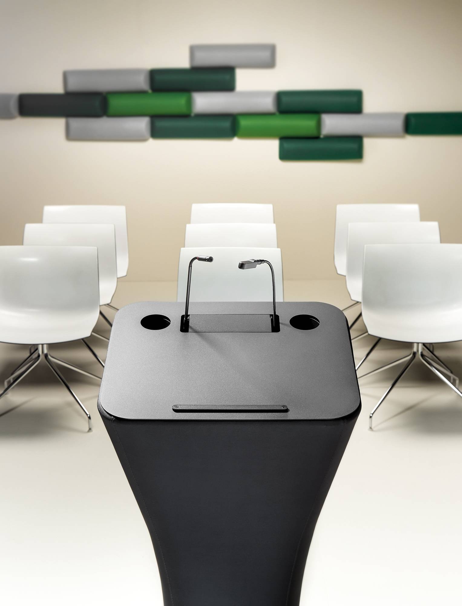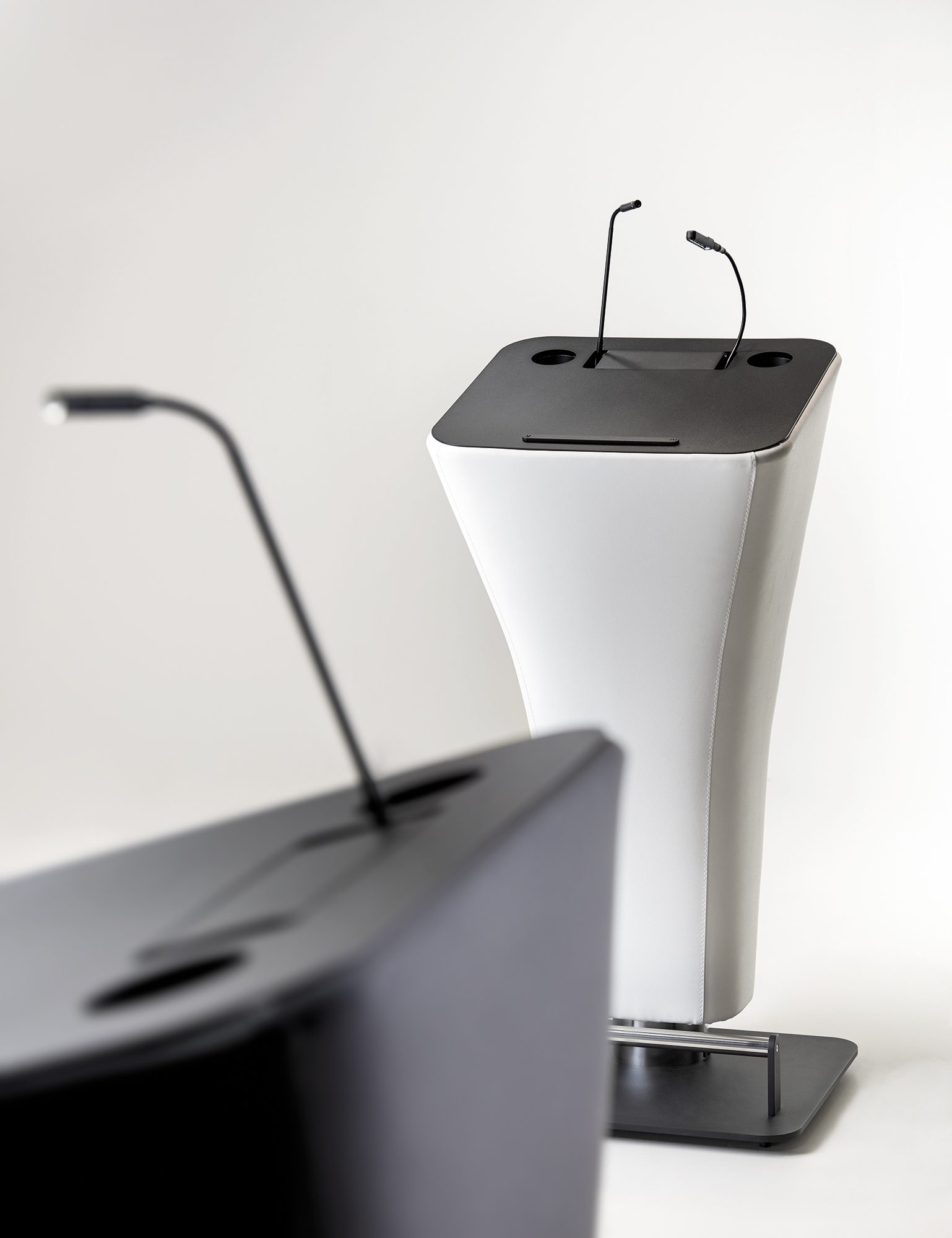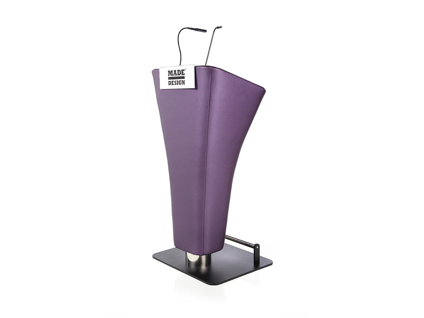 Speak through Nagoya and present your ideas to the world. This design provides the space with style. Upholstered lectern with technological applications and a stand for books, notes, papers or a personal computer. Lift up your voice.