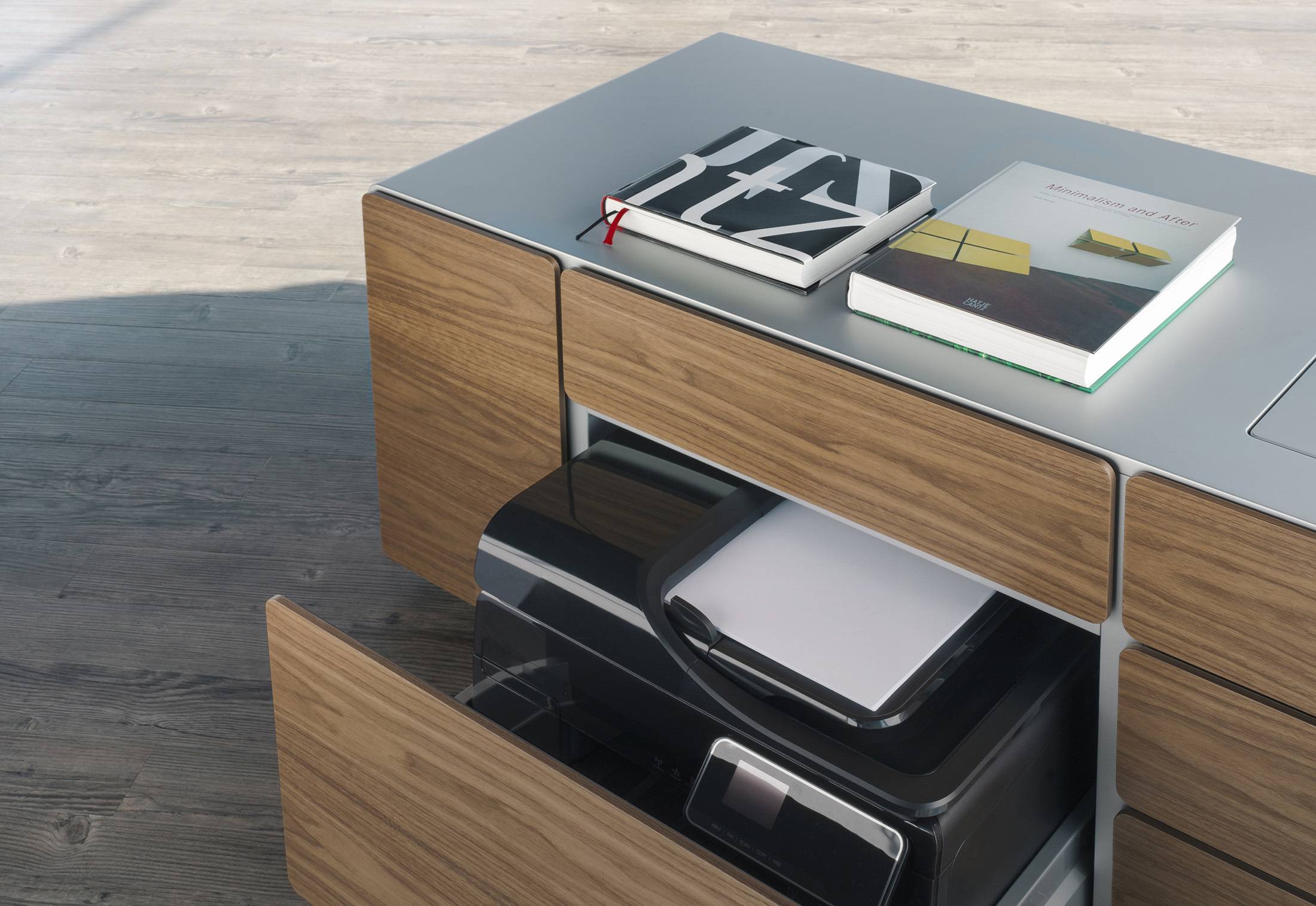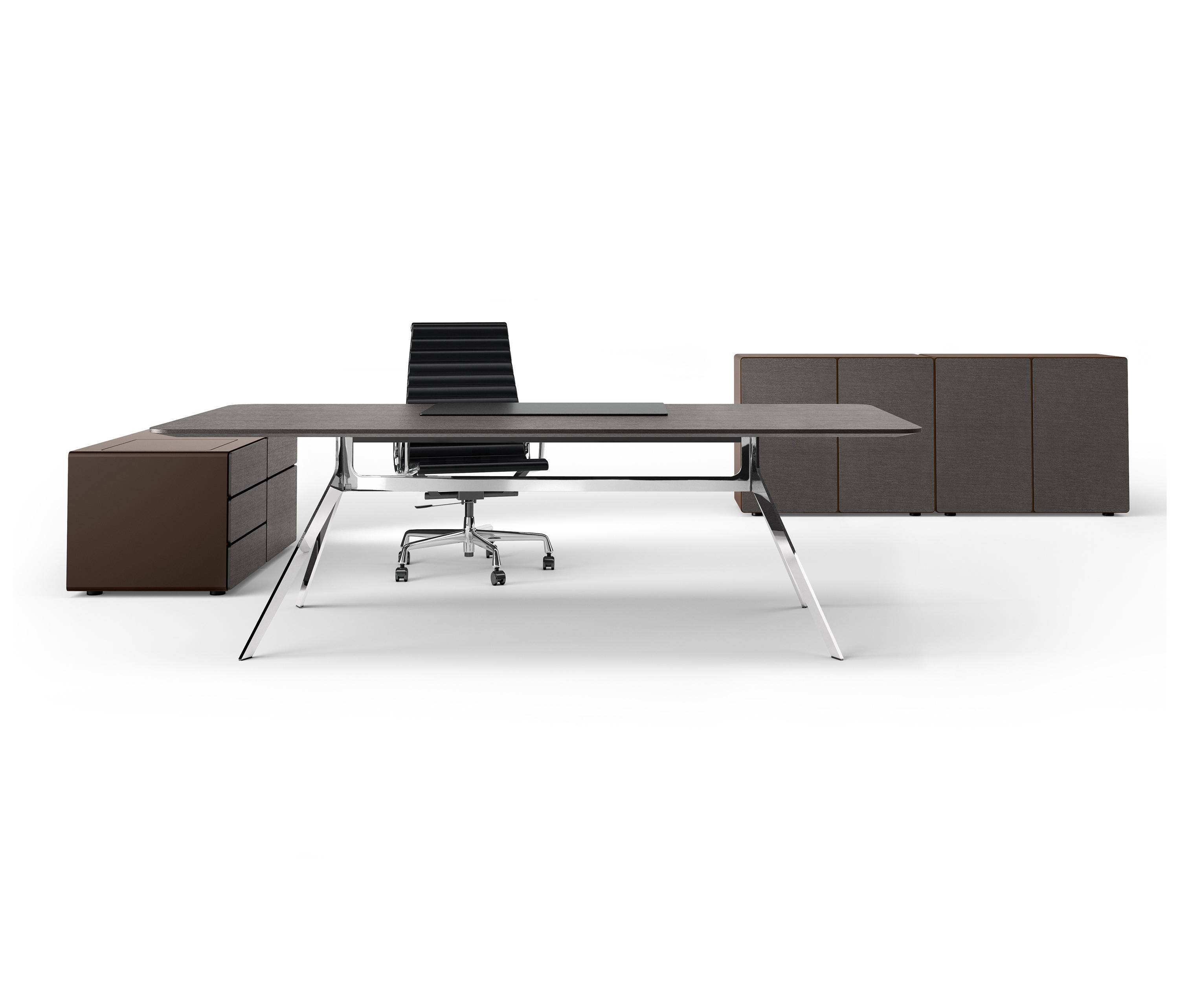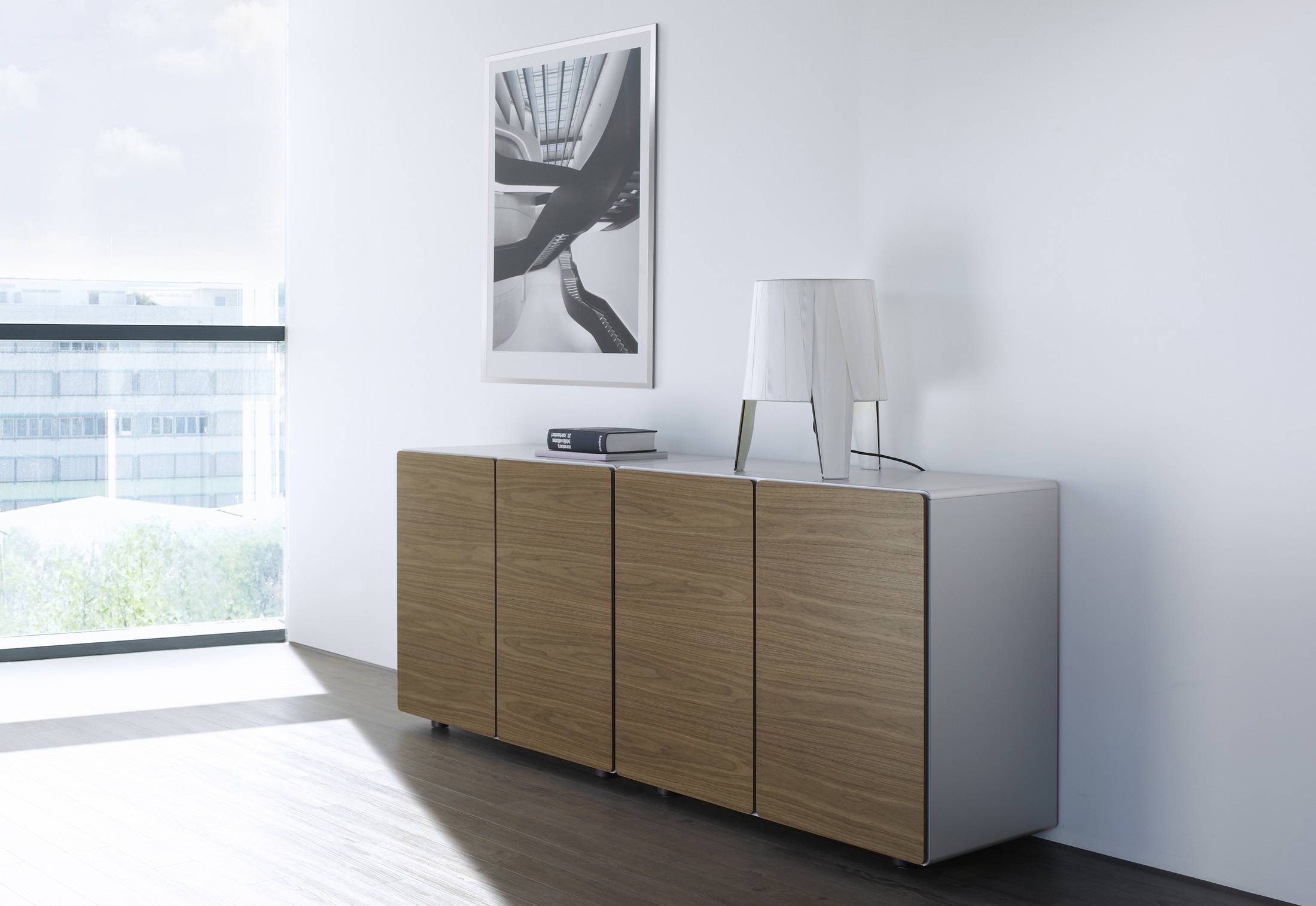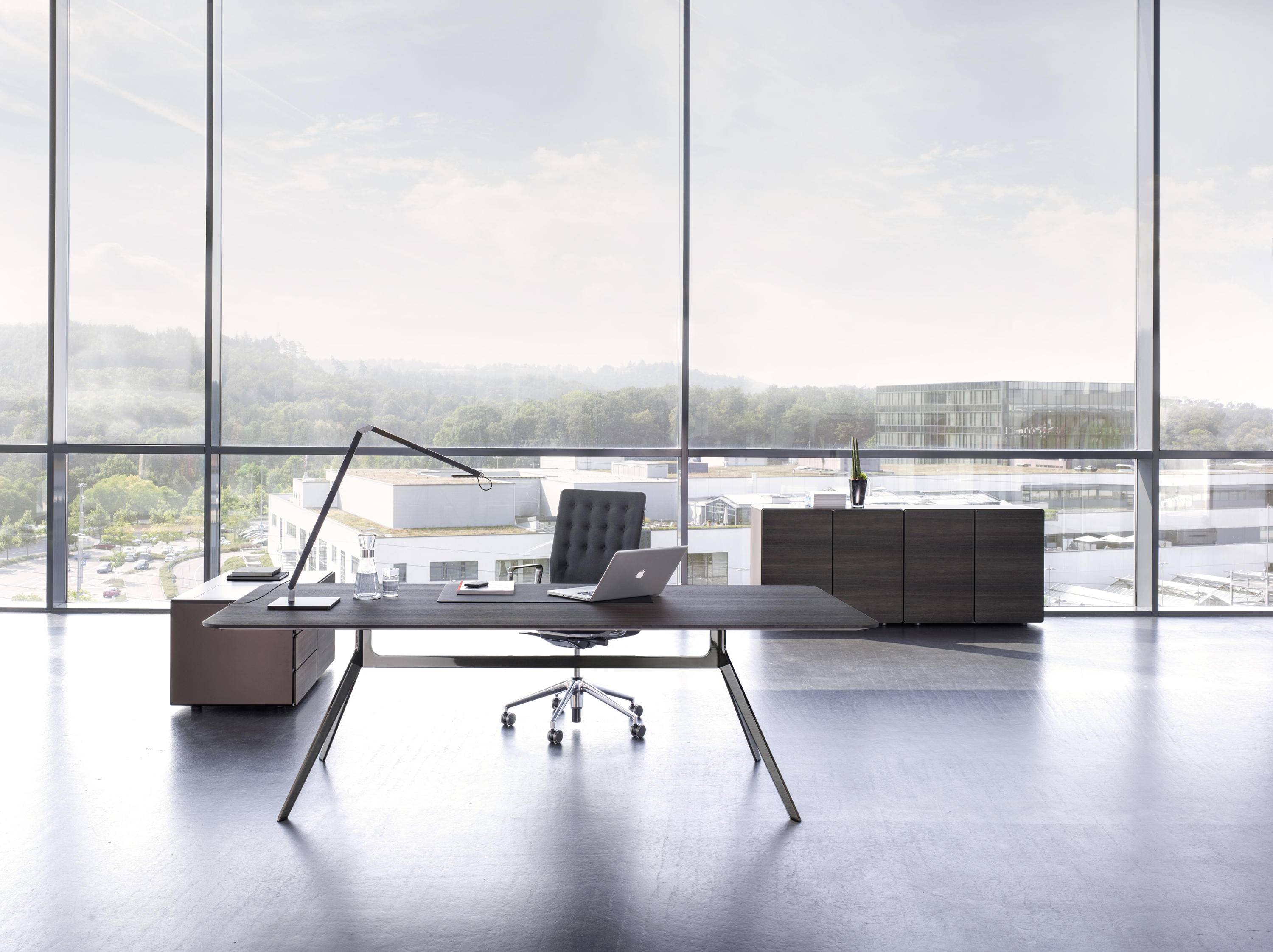 The modular workplace system is made for unique private offices, for team workplaces and for project work. The tabletops in various sizes and shapes are available in selected fine veneers or structured lacquer for finely structured, gleaming matte surfaces.