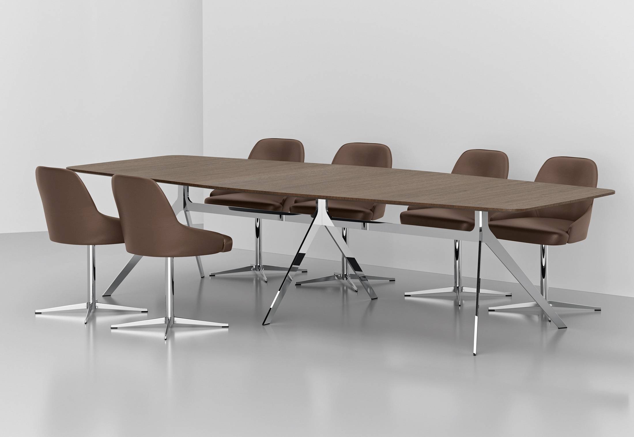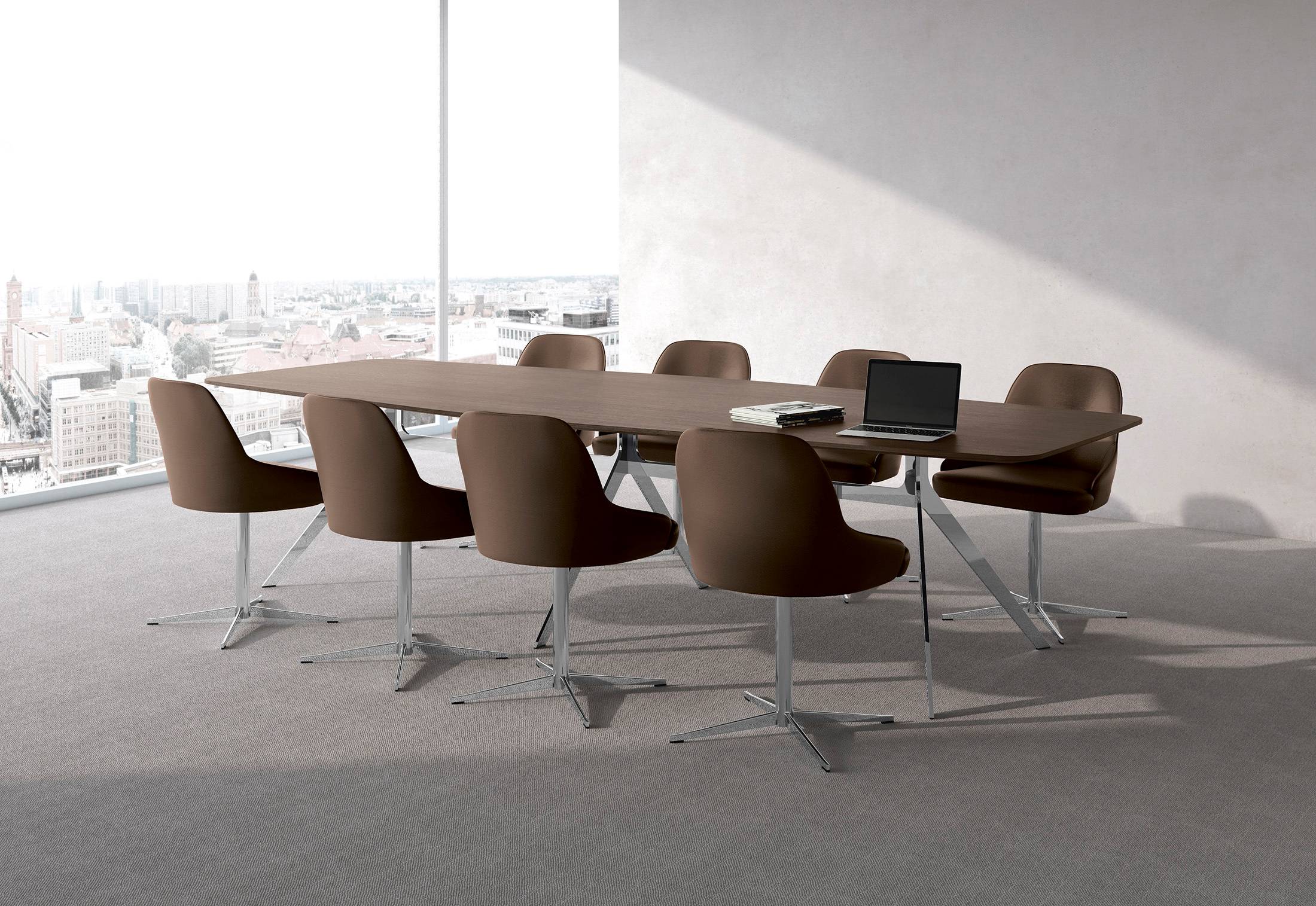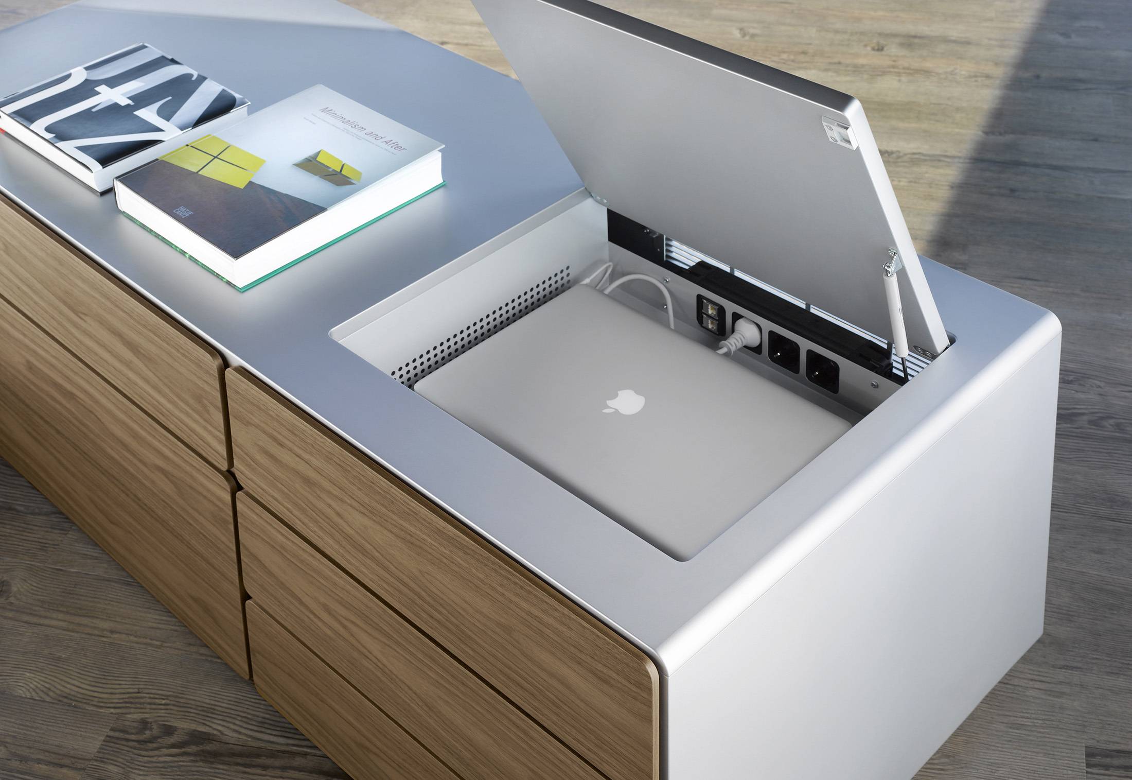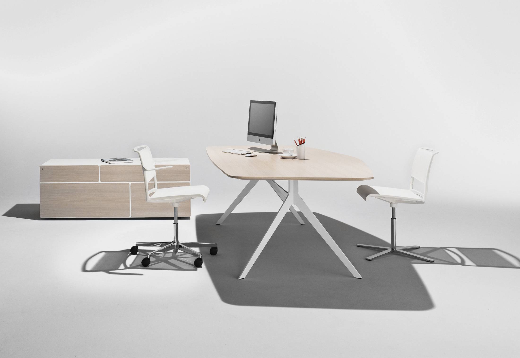 The modular workplace system is made for unique private offices, for team workplaces and for project work. The tabletops in various sizes and shapes are available in selected fine veneers or structured lacquer for finely structured, gleaming matte surfaces.