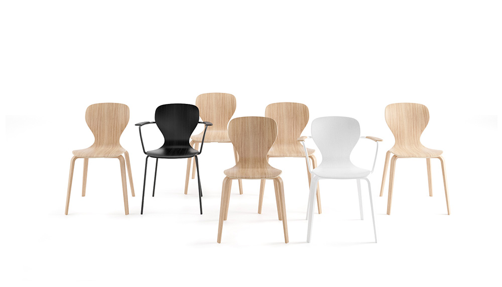 Ears is as light in terms of materials as it is resistant to aging. Its sinuous shapes keep intact a style capable of taking us back in time to the contemporary classics of the 70s.Its balanced arrangement (as reduced as it is comfortable) makes Ears a perfect option for different collective and private areas: meeting points, cafeterias, auditoriums, waiting rooms, educational spaces, work areas in libraries or lounges.It is possible to choose oak wood finishes for the entire product, as well as combining its oak seat and metal structure. Both versions of the chair can be complemented with distinctive armrests, designed to embrace the user.