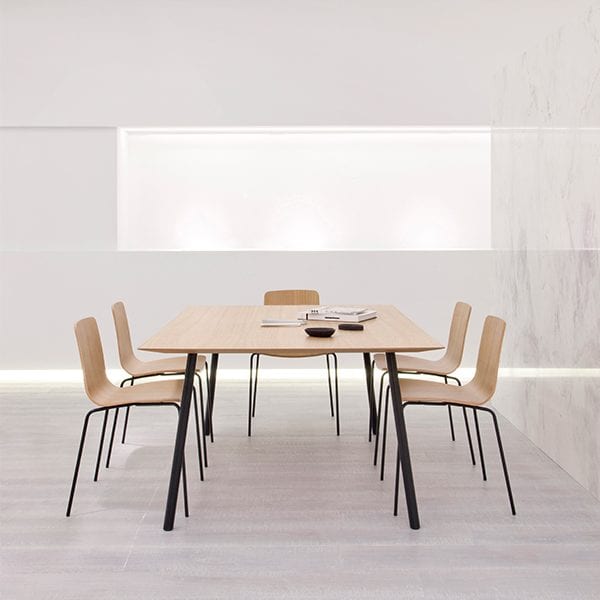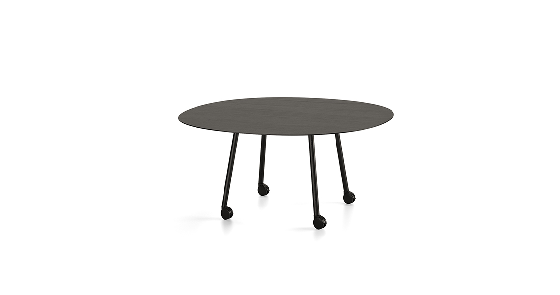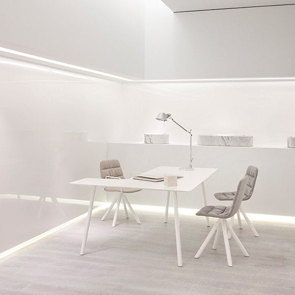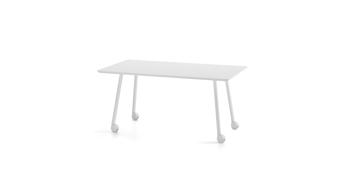 Table system is based on a technical minimalist leg solution that does not need a structure and can be attached directly to the table top. Having no structure and a table top thickness of just 5 mm it acquires great visual lightness. There are endless uses, finishes and formats with this innovative system. The legs can also be fitted with castors.