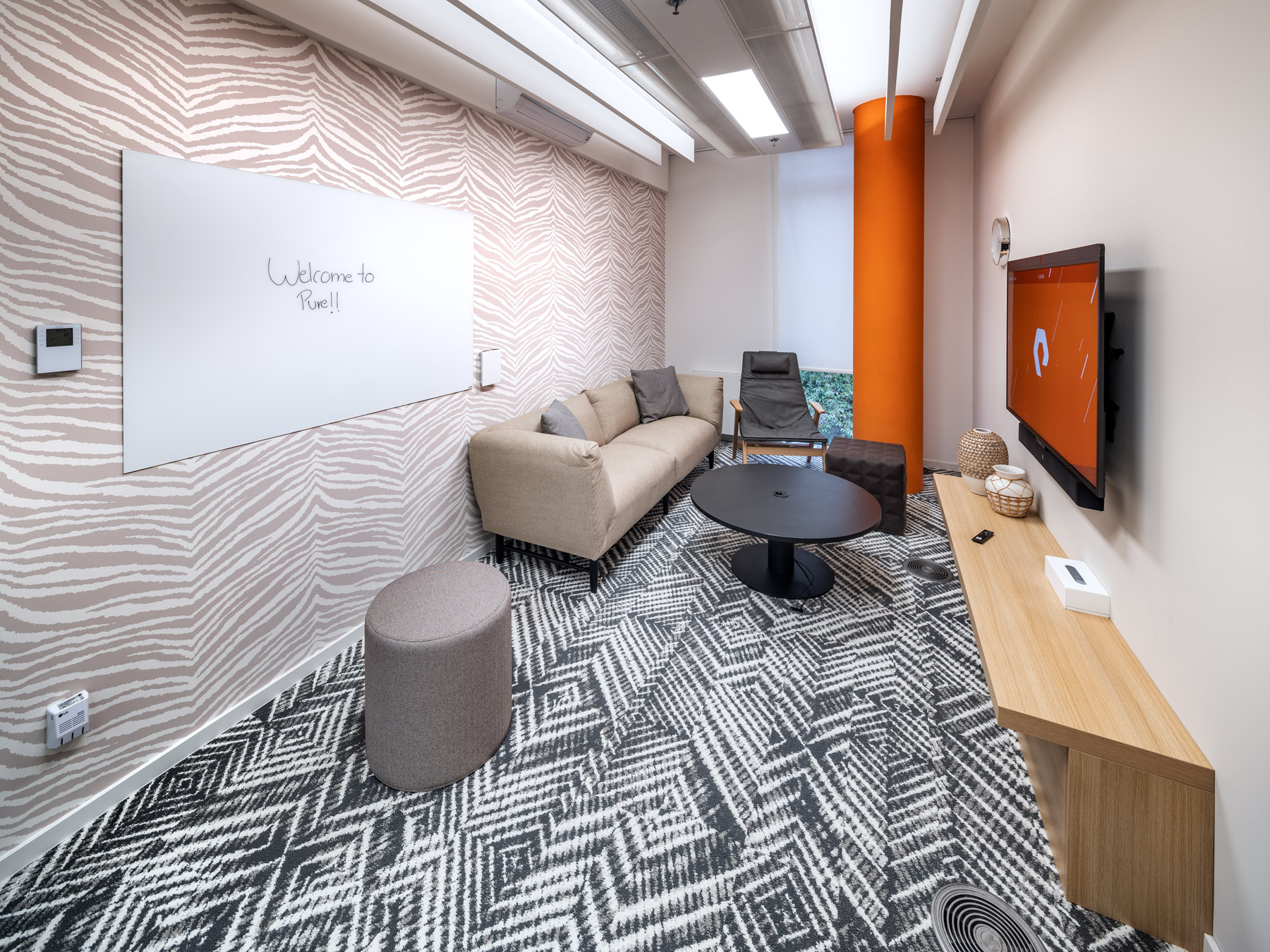 The architectural design was focused in the users, in this case IT engineers, in a way that they can feel connected with the design itself. Straight lines will underscore a technological concept of a circuit board, using them all over the office, for instance, on acoustic surfaces, furniture, lighting, flooring and even as navigation system that will assist employees and visitors. Pure Storage identity will be heightened through the use of orange which can be found in details on textiles, furniture and flooring.