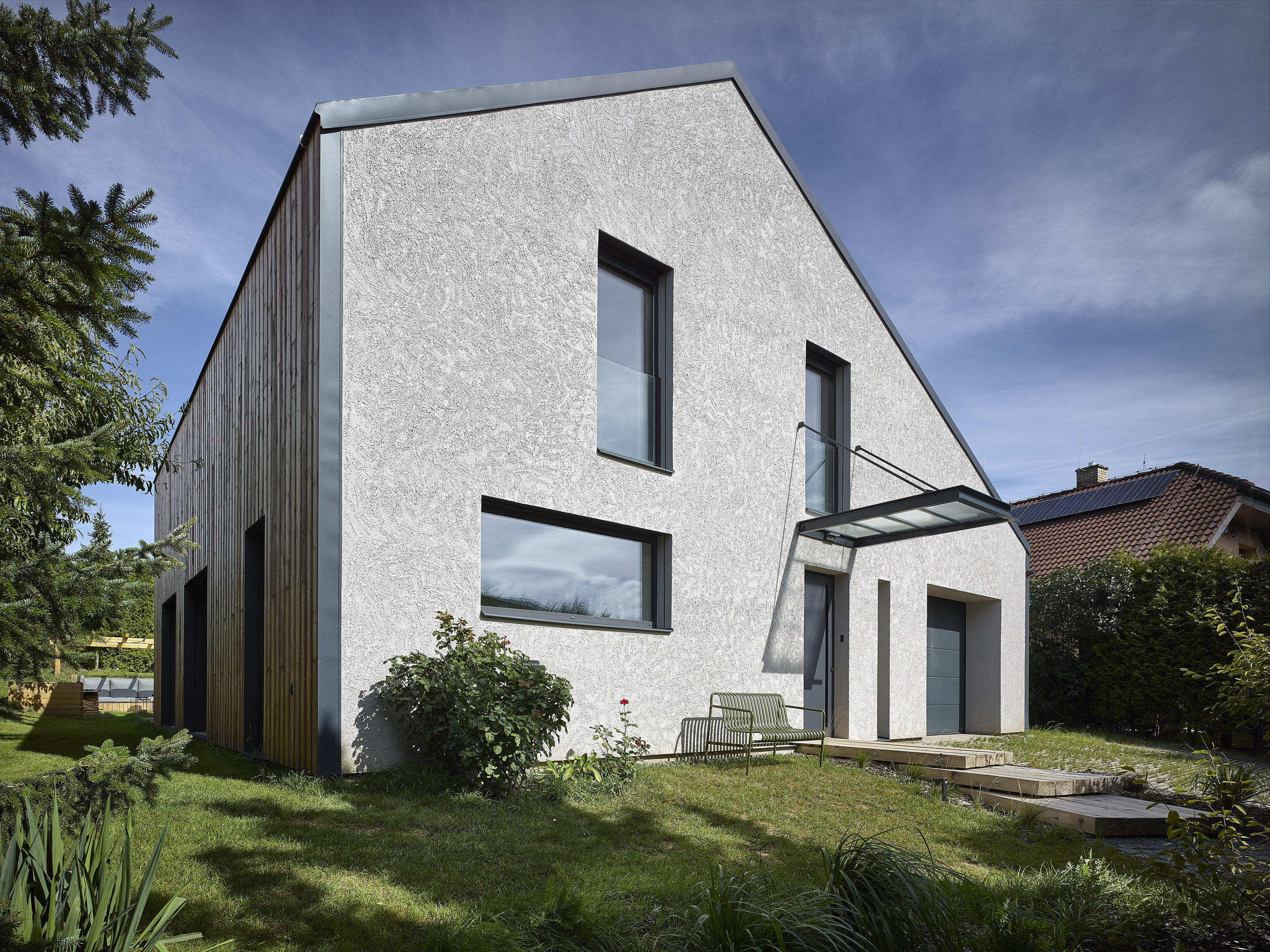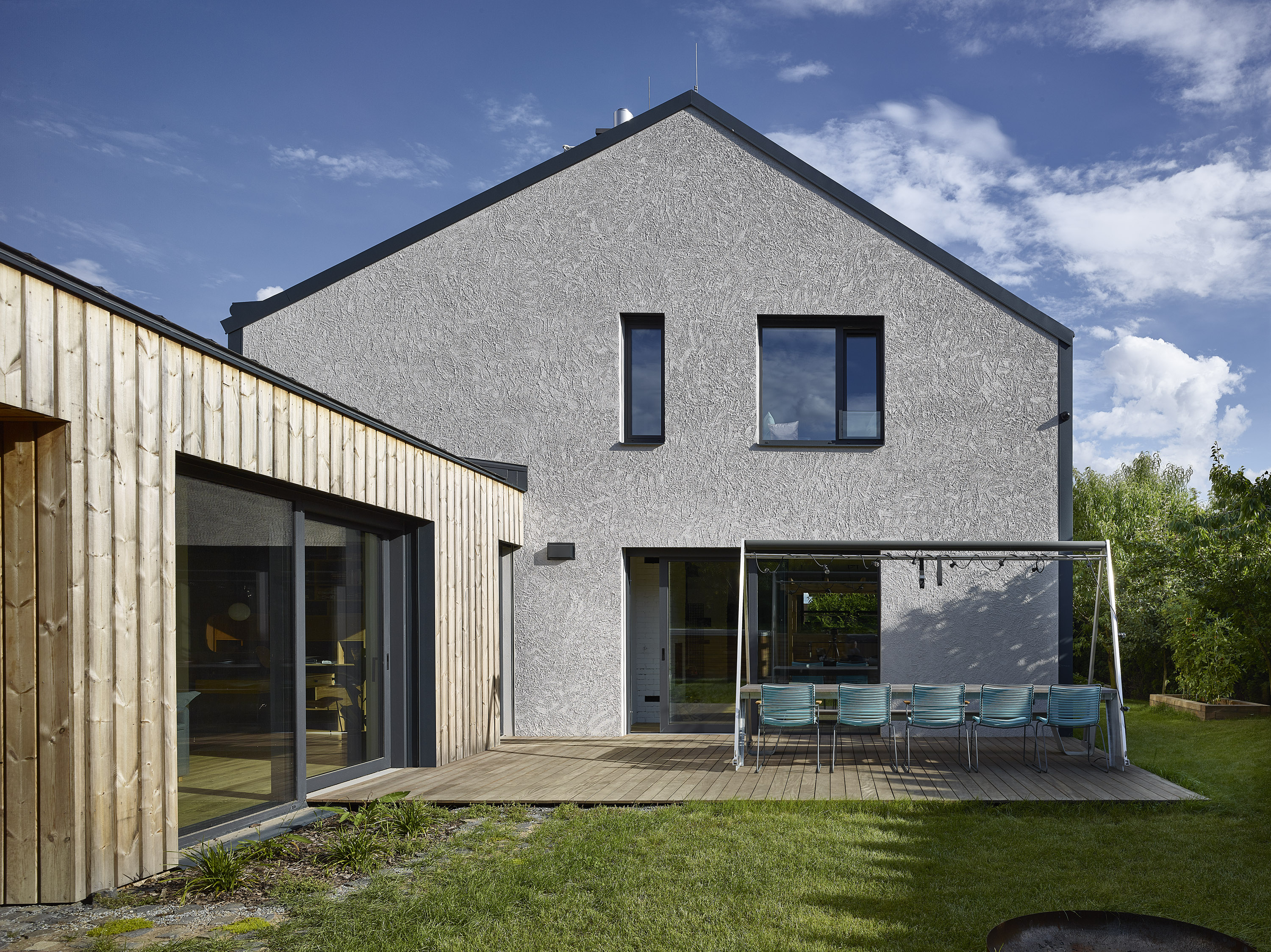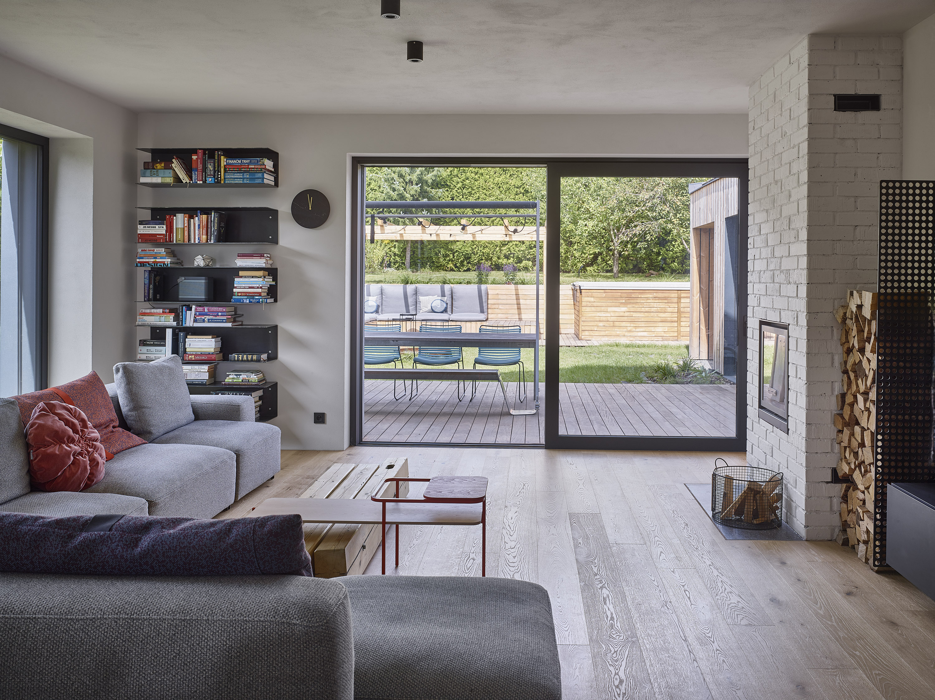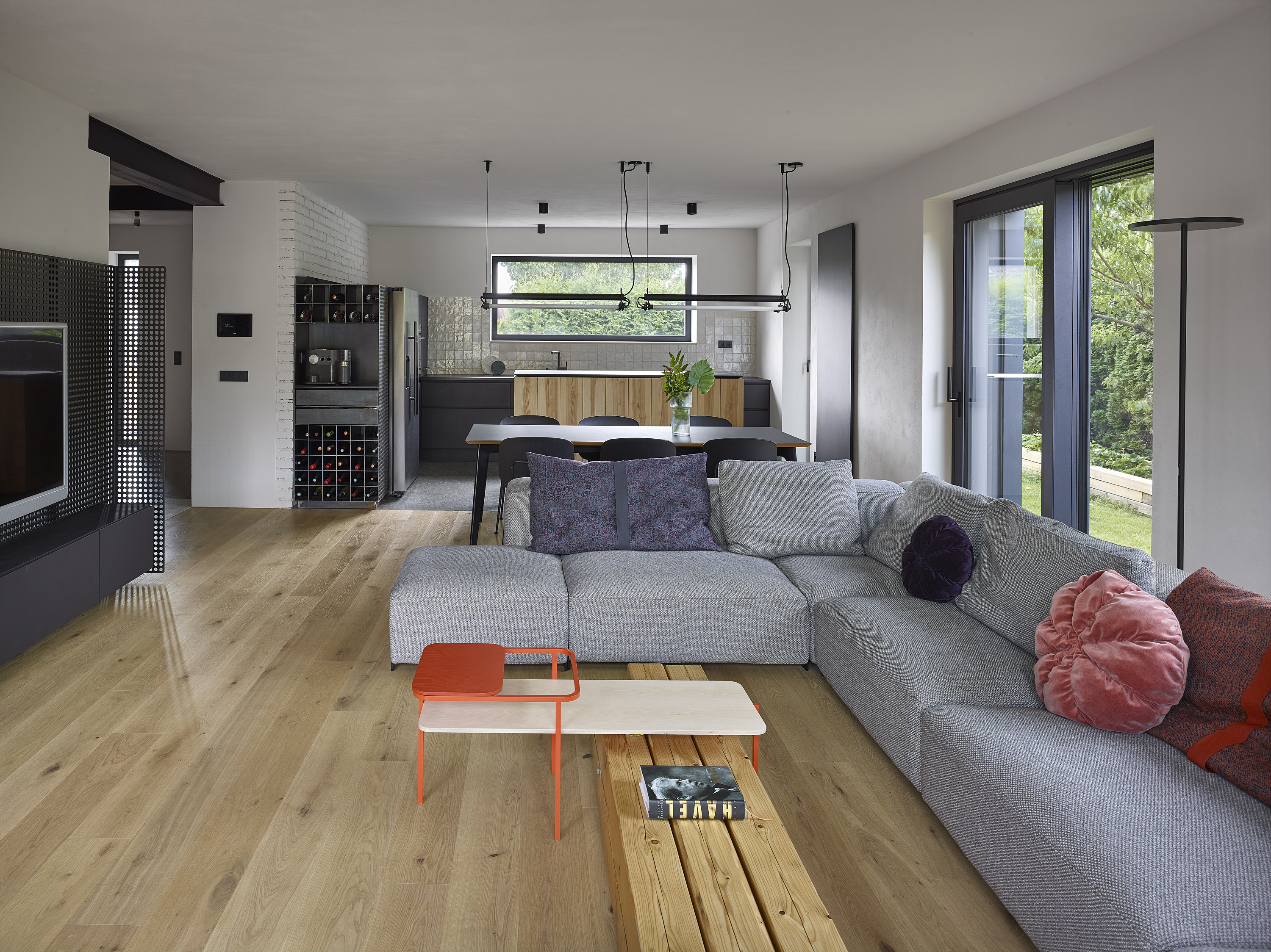 The investor bought a ten-year-old house. Unsightly, but spatially satisfactory, with only a few dispositional ailments. A complete reconstruction managed to achieve a pleasant and very comfortable living, this time in a beautiful house. Beautiful not only from the outside, but also inside. Thanks to completely new furniture and tailor-made and manufactured elements combining cold crude steel, warm wood and natural stone, a harmonious interior with several strong color accents was created.