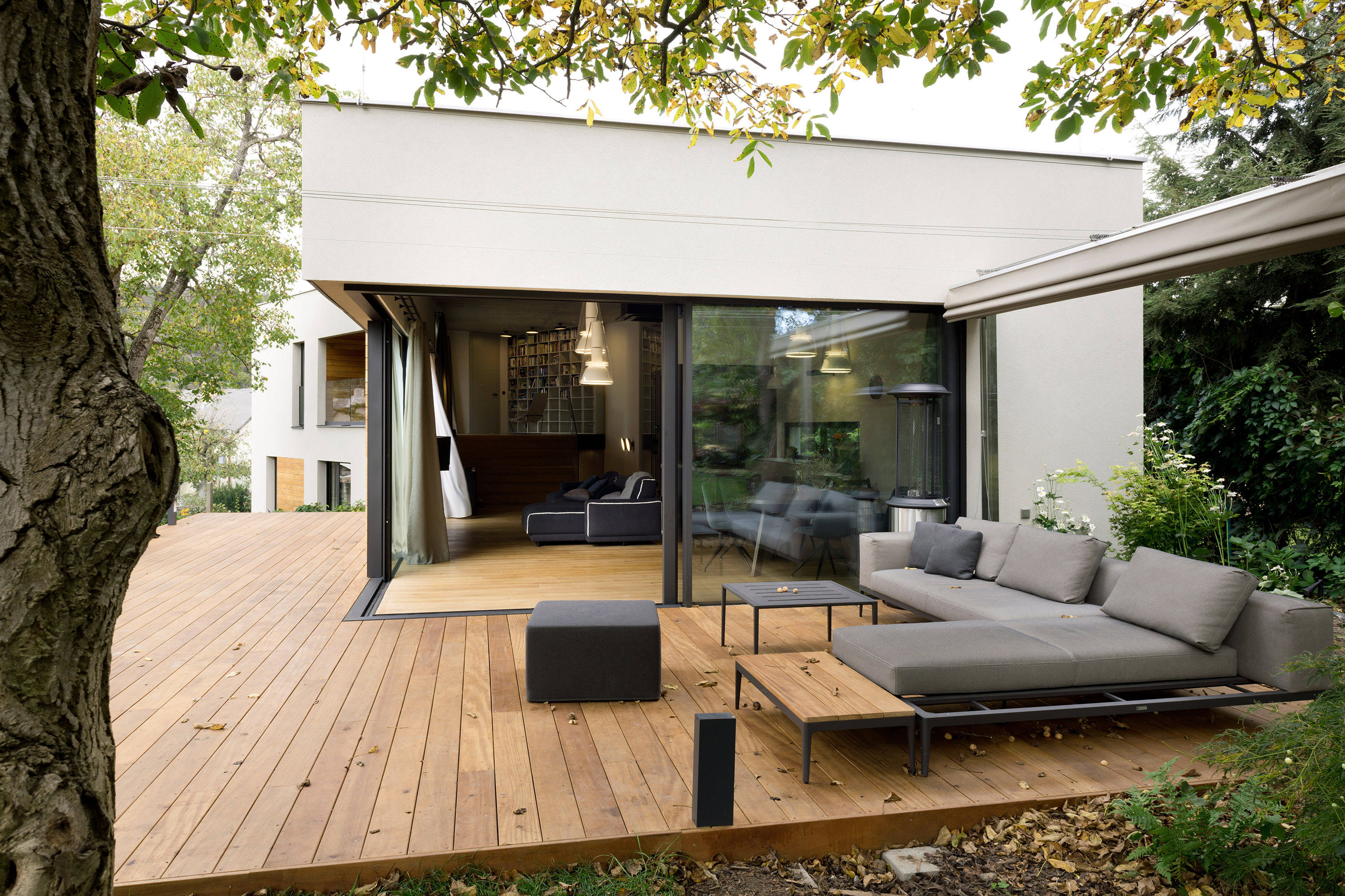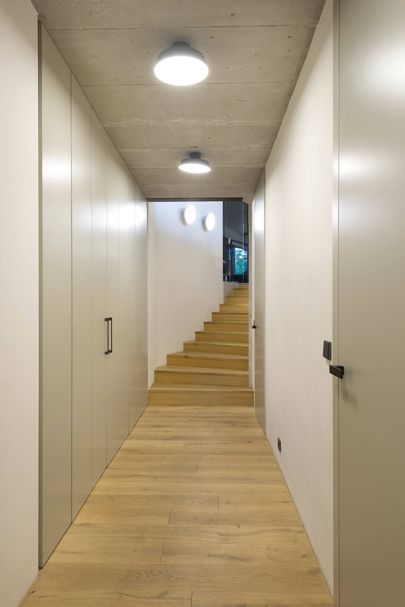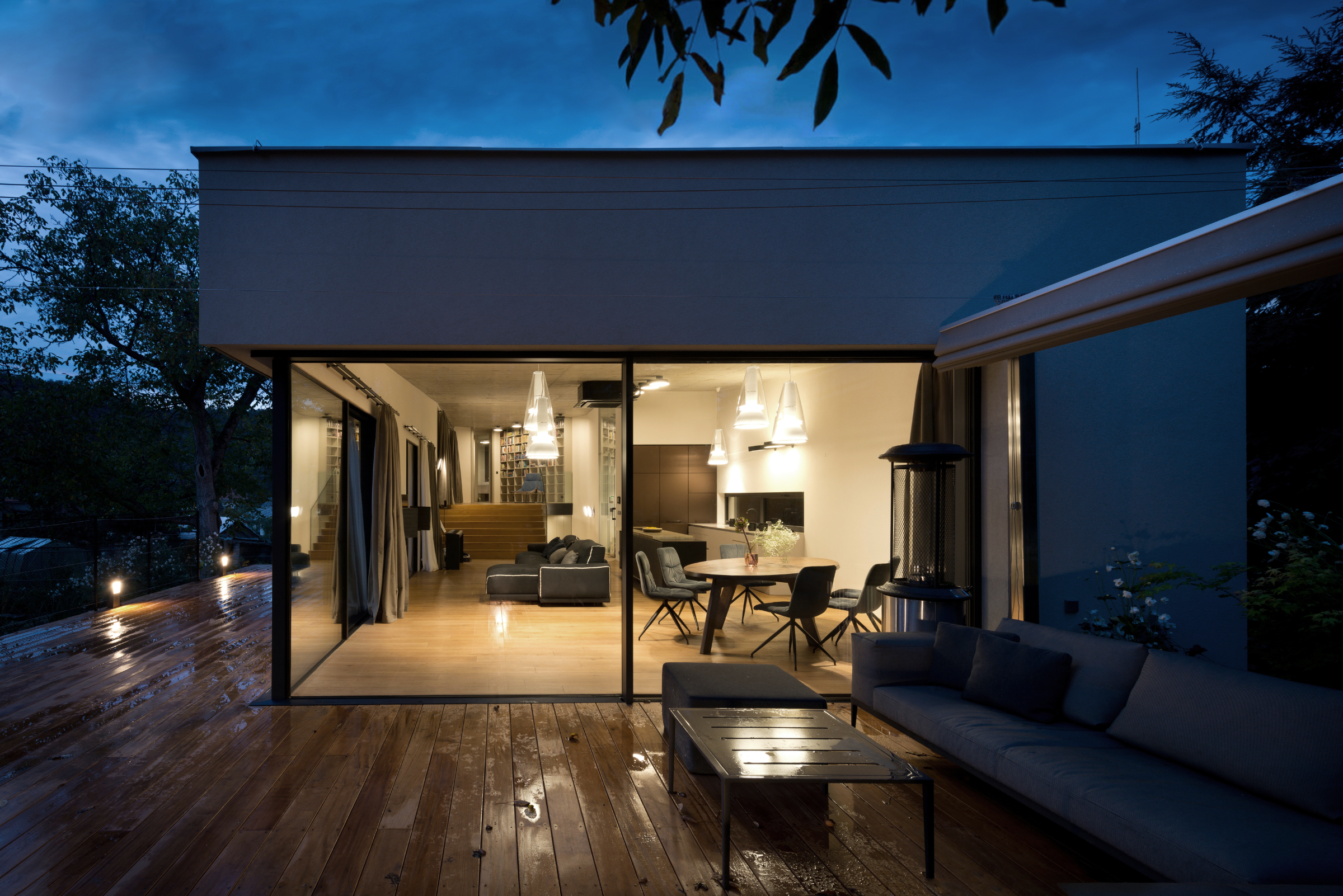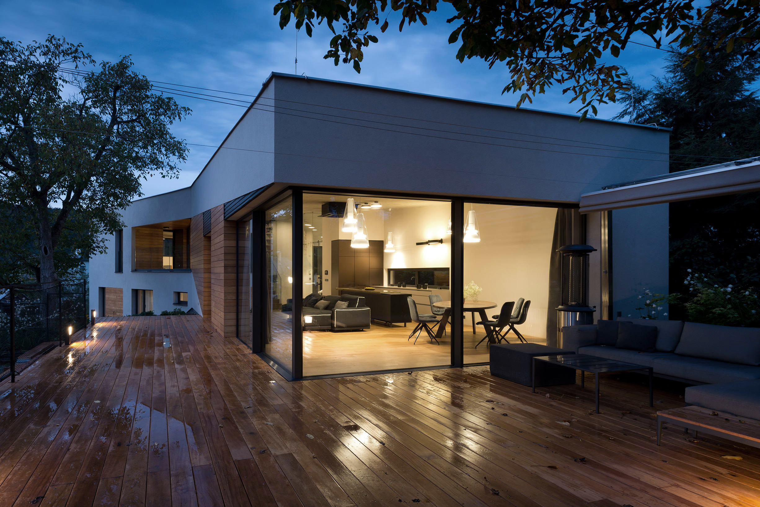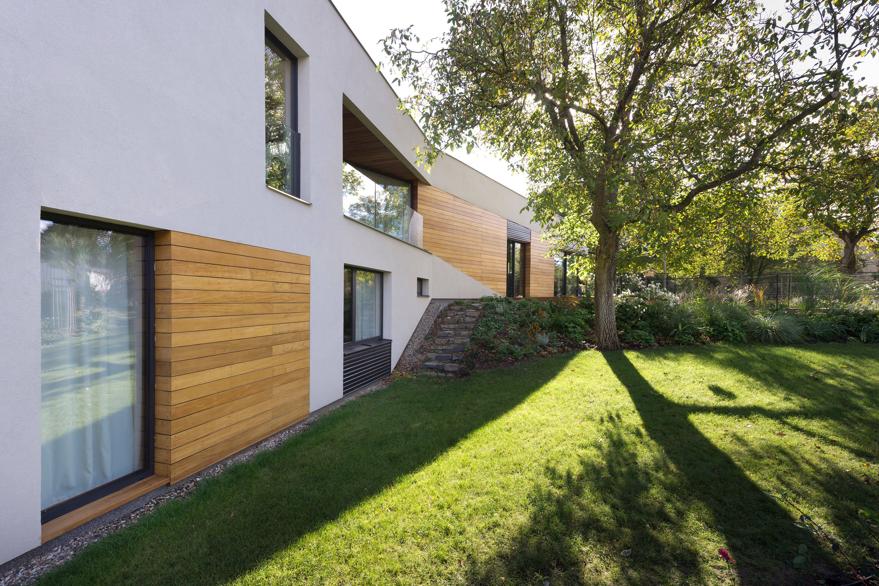 The plot in a sloping terrain on the right bank of the Vltava is relatively complicated due to its trapezoidal shape and significant north-facing slope. At the same time beautiful and intimate thanks to a large number of tall nuts and cherries, the grip of the surrounding gardens and beautiful views of the forests opposite the river bank. The outside of the house is defined by light gray plaster and garap colour of tropical wood garapa. Inside, there is a distinctive combination of exposed concrete on ceilings, wooden floors and large-format lacquered doors. Most of the furniture is atypical, built-in. Free furniture is just a few of the most important pieces.
