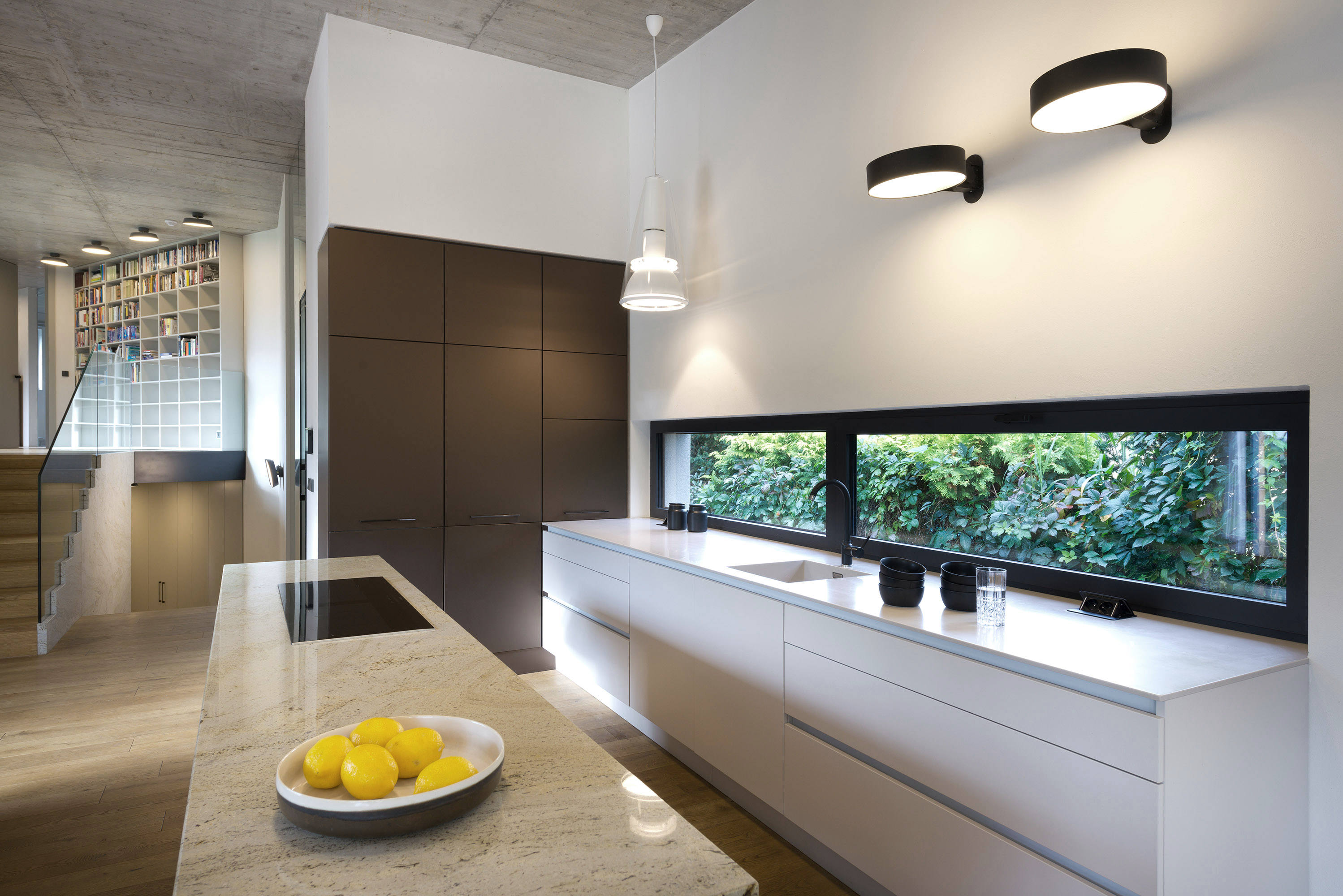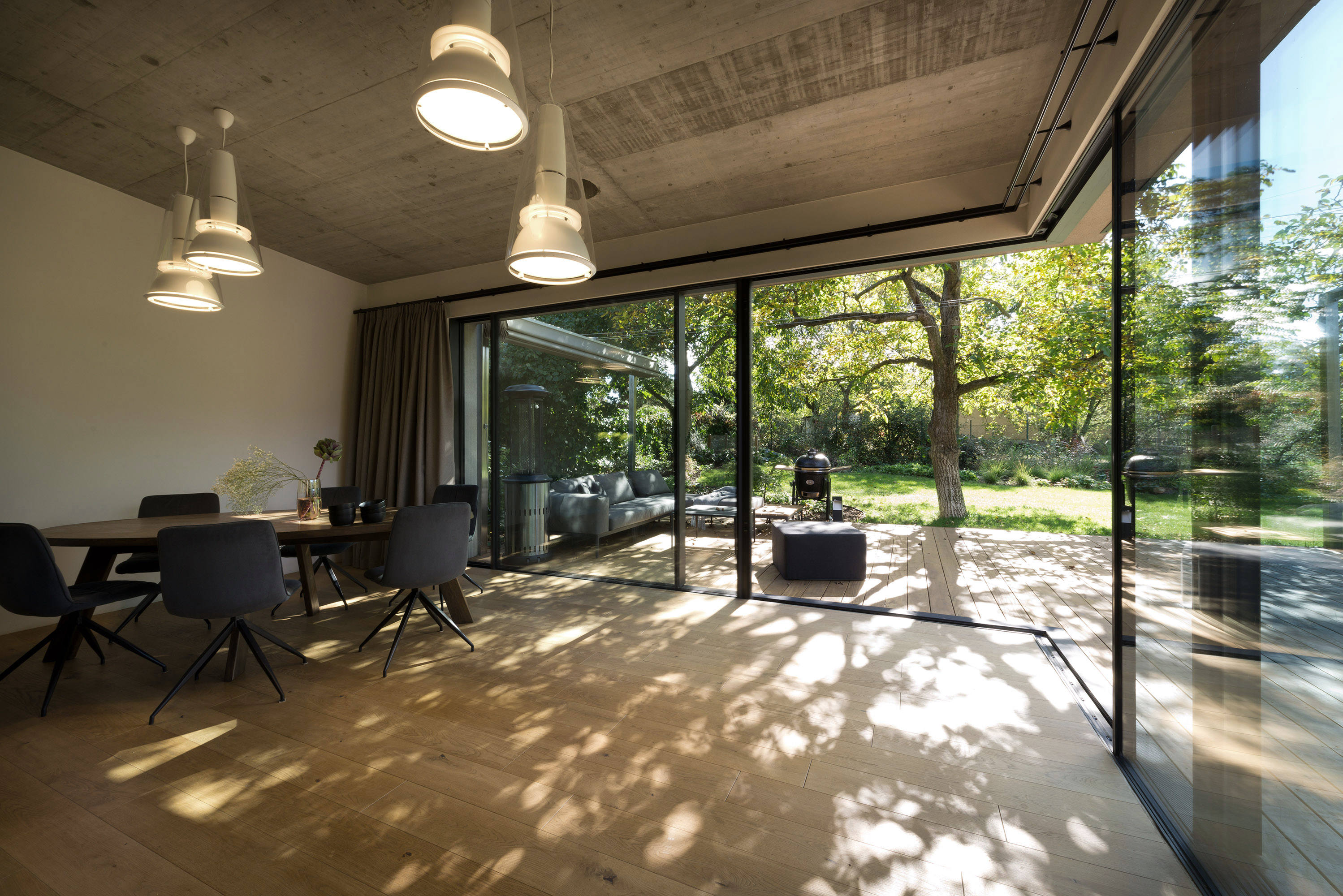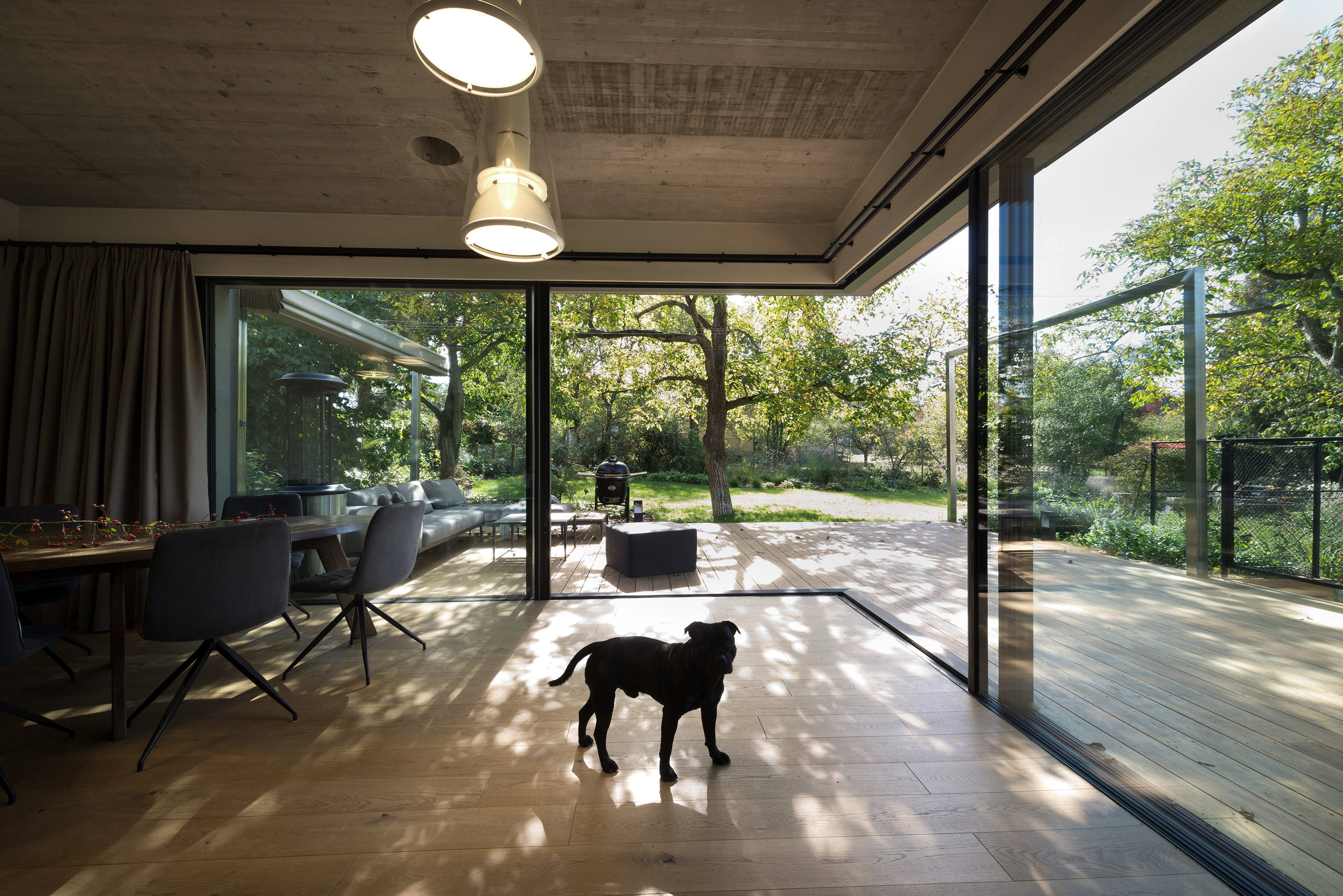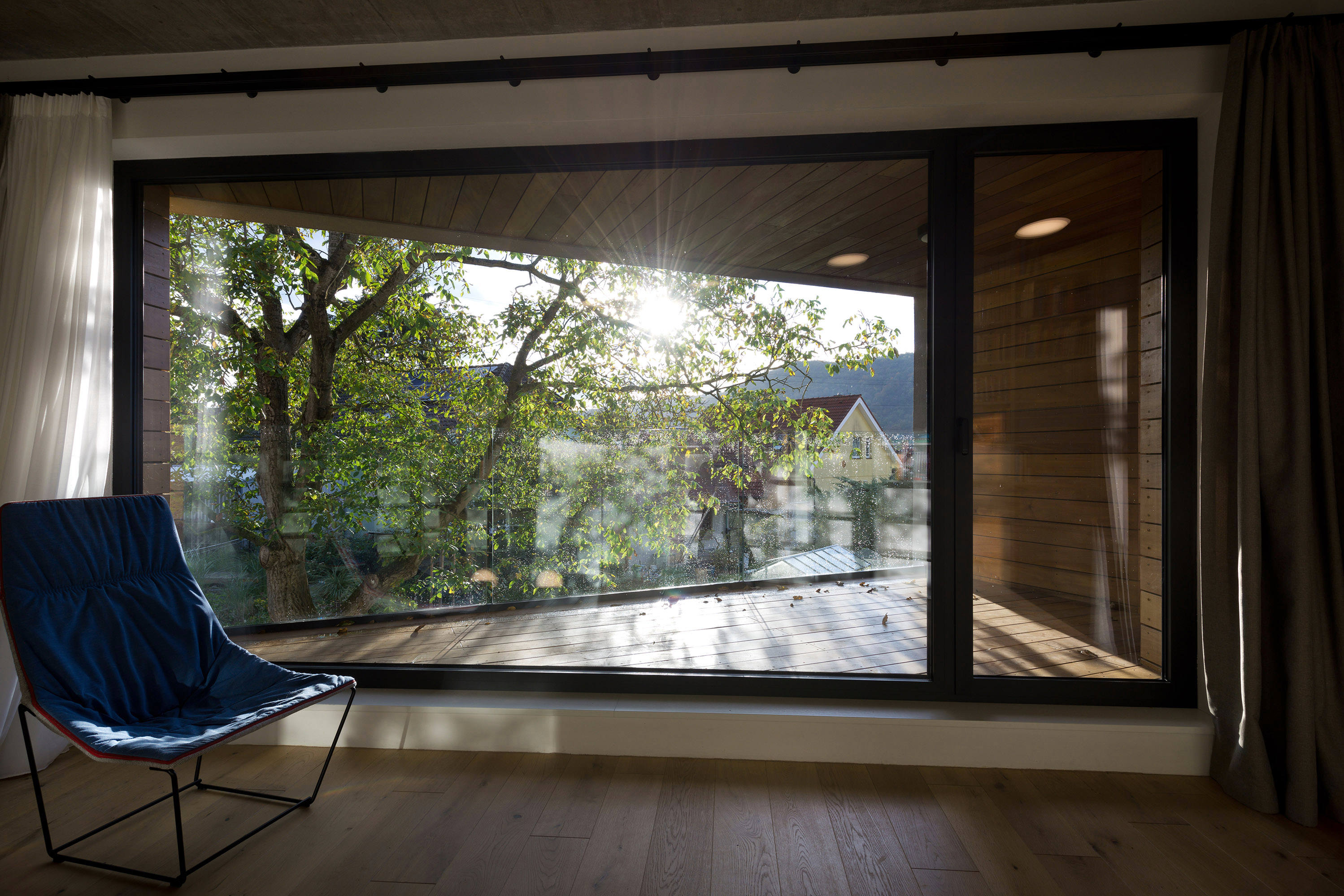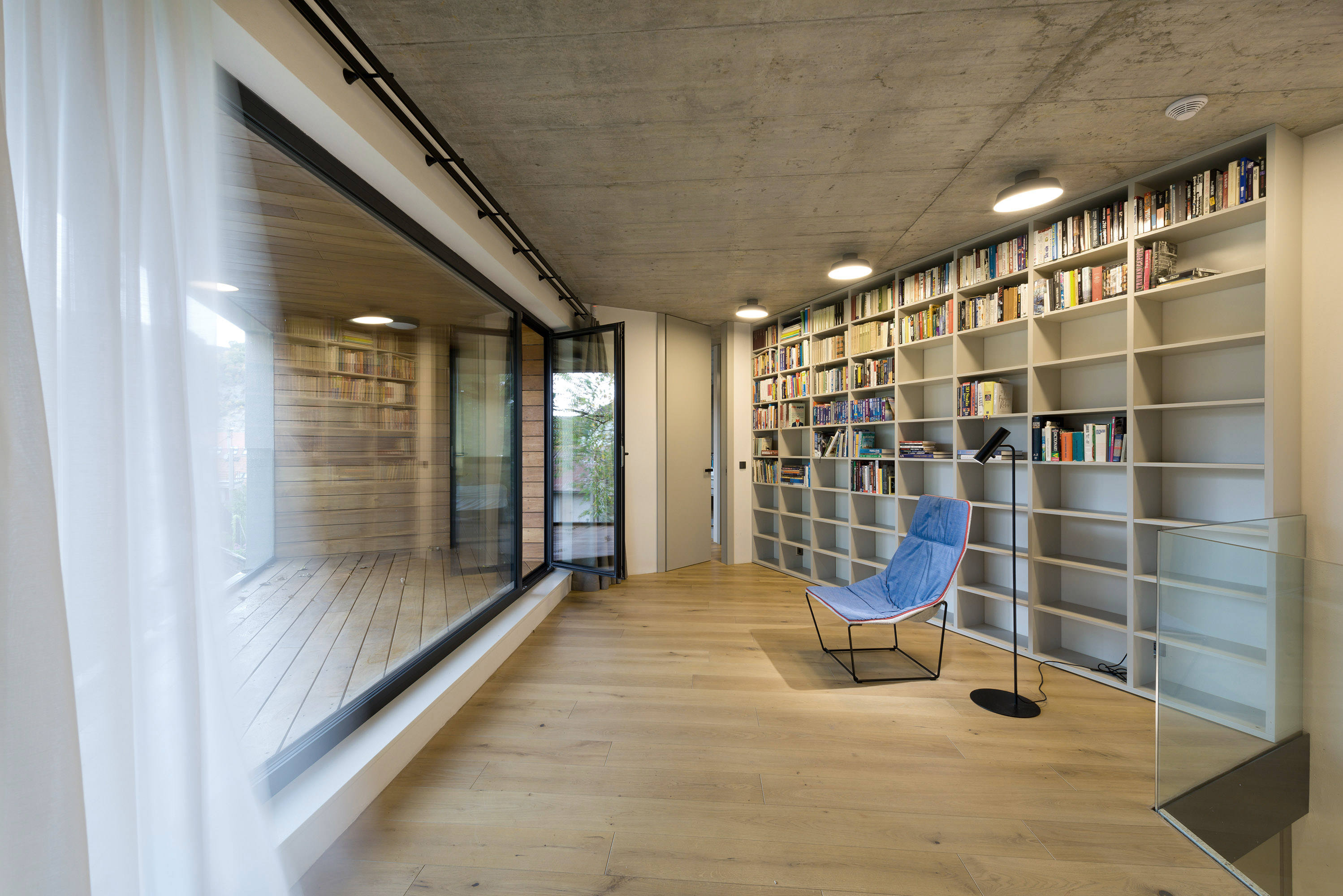 The plot in a sloping terrain on the right bank of the Vltava is relatively complicated due to its trapezoidal shape and significant north-facing slope. At the same time beautiful and intimate thanks to a large number of tall nuts and cherries, the grip of the surrounding gardens and beautiful views of the forests opposite the river bank. The outside of the house is defined by light gray plaster and garap colour of tropical wood garapa. Inside, there is a distinctive combination of exposed concrete on ceilings, wooden floors and large-format lacquered doors. Most of the furniture is atypical, built-in. Free furniture is just a few of the most important pieces.