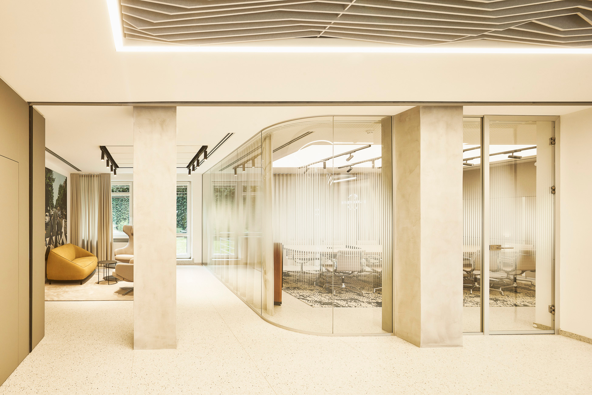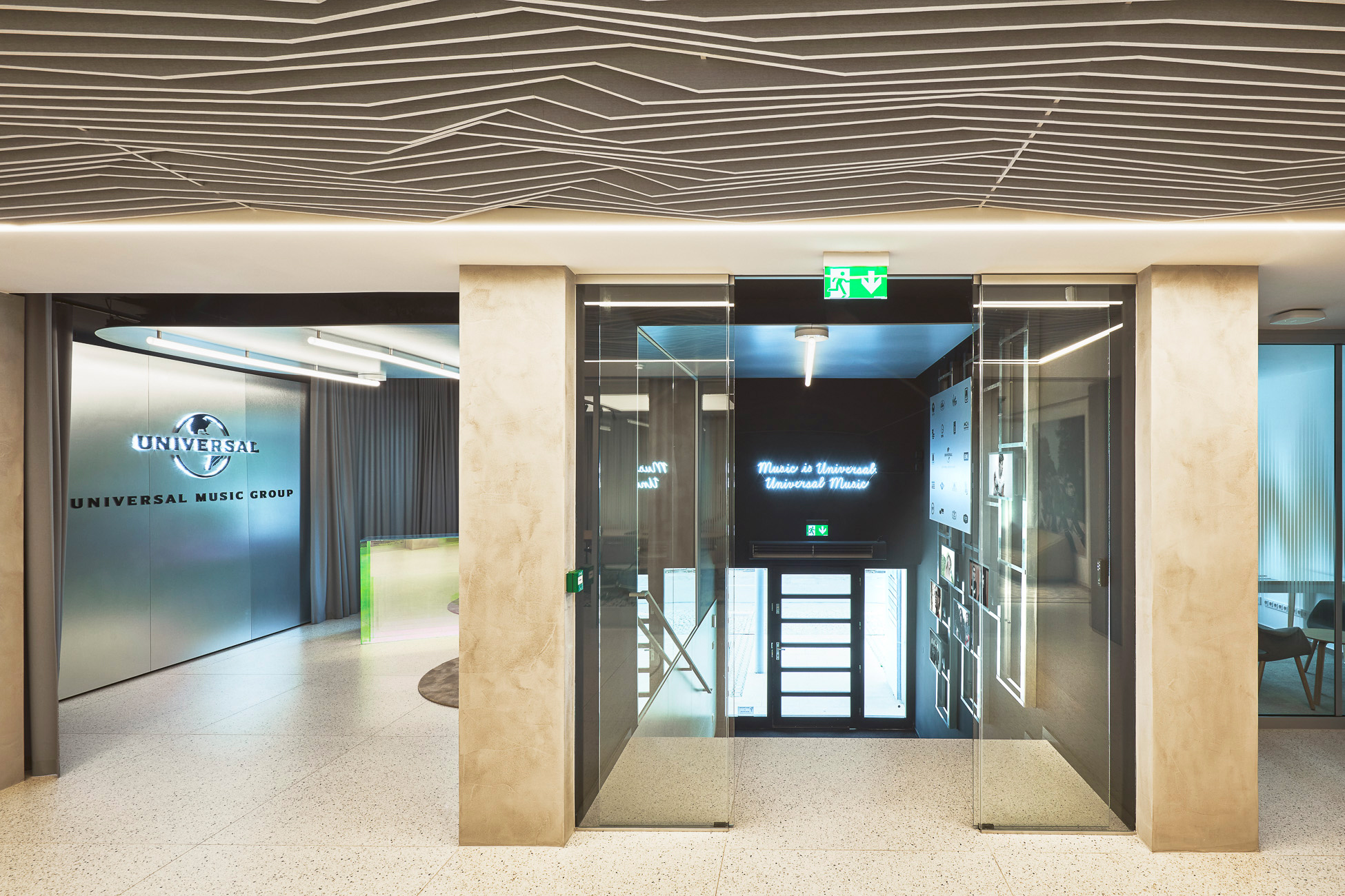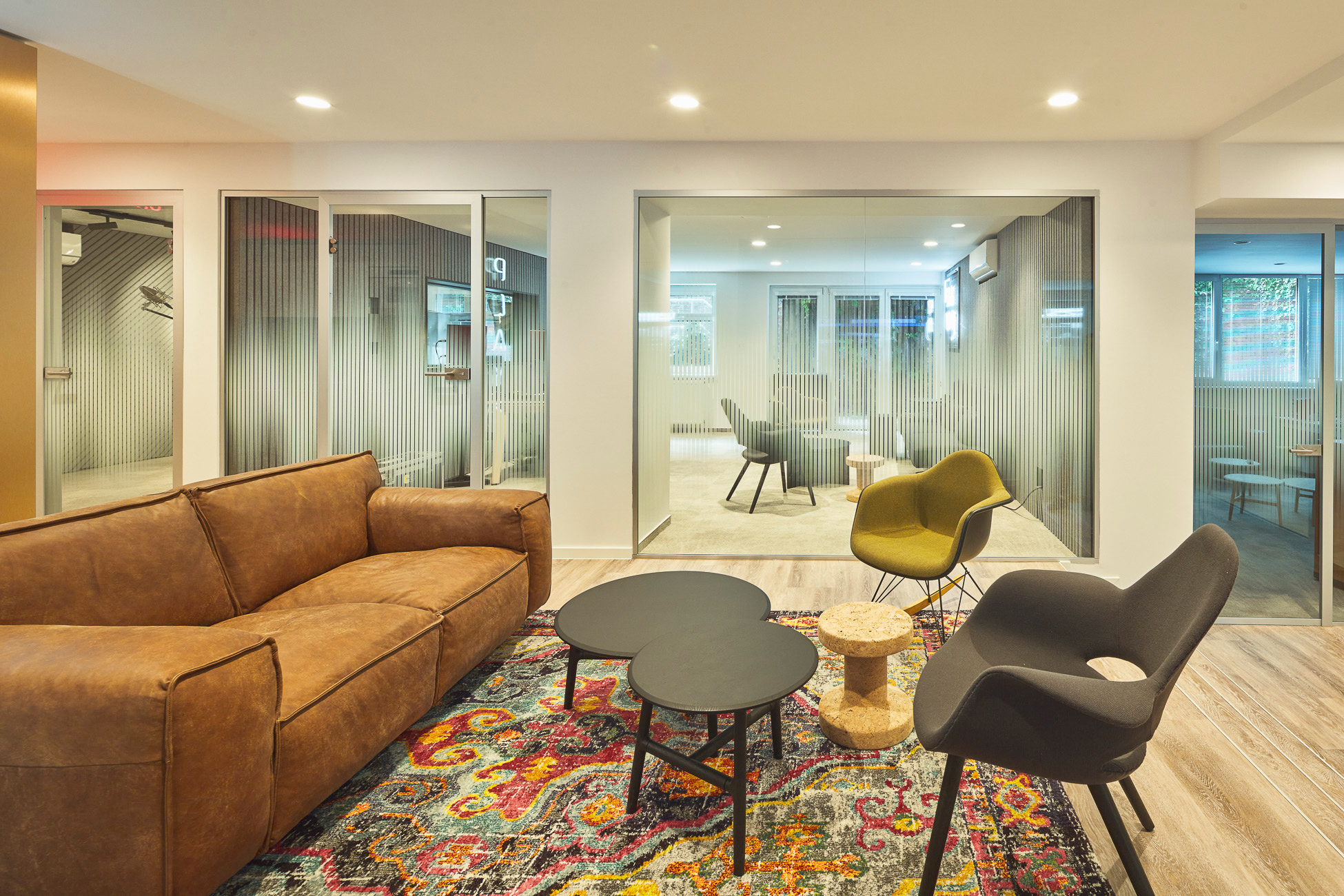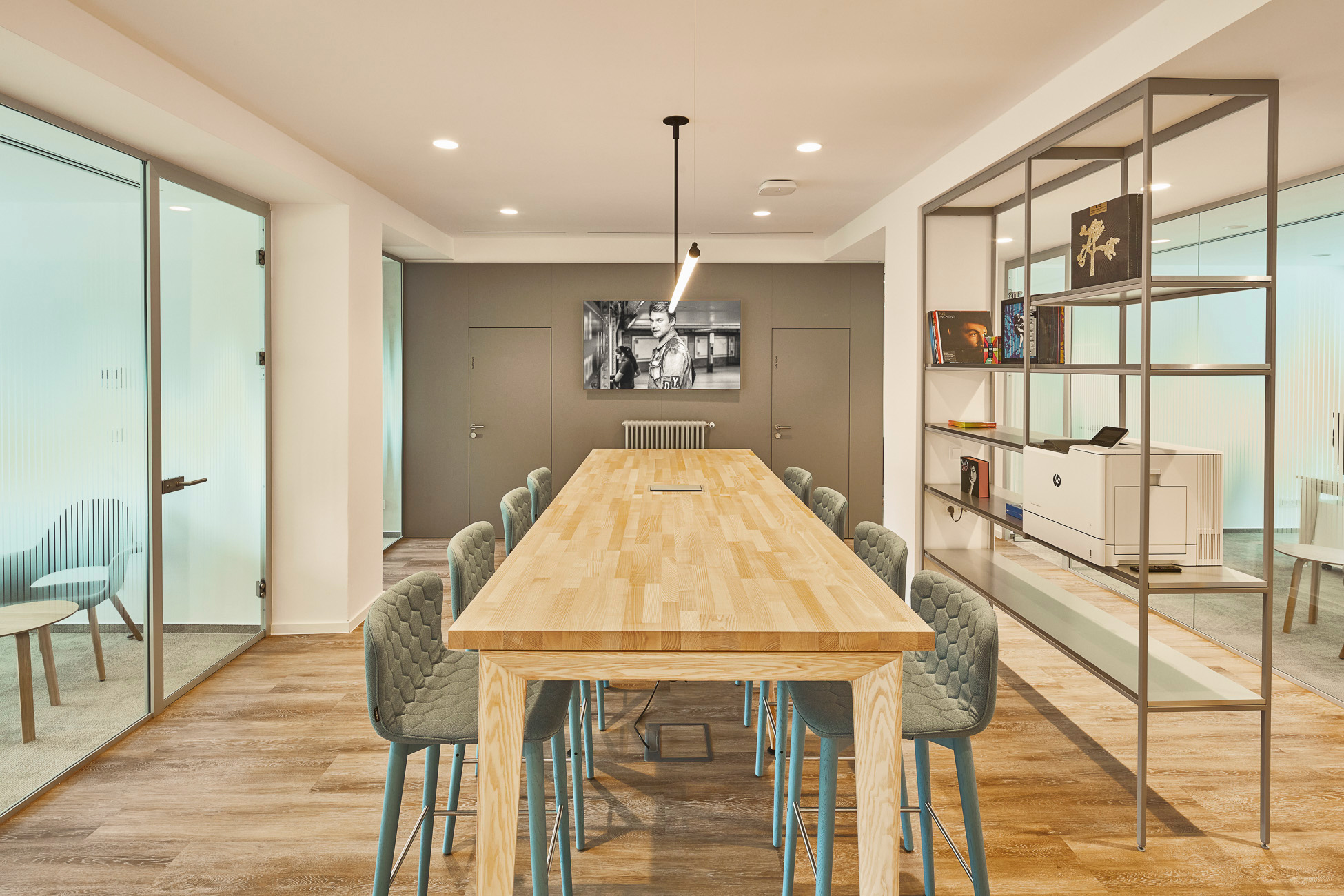 We helped equip the new interiors of Universal Music with acoustic solutions from EchoJazz in the ceiling application and acoustic lights from BuzziSpace. Solid bar tables cre8 ELY Wood complement comfortable Sancal TEA barstools, and the space is also enhanced with coffee tables SLIT and BELLA from HAY, as well as NUDO from Sancal. Two compact SUMO sofas, also from Sancal, stand out as focal points. Essential accessories include the SHADE waste bins from HAY.