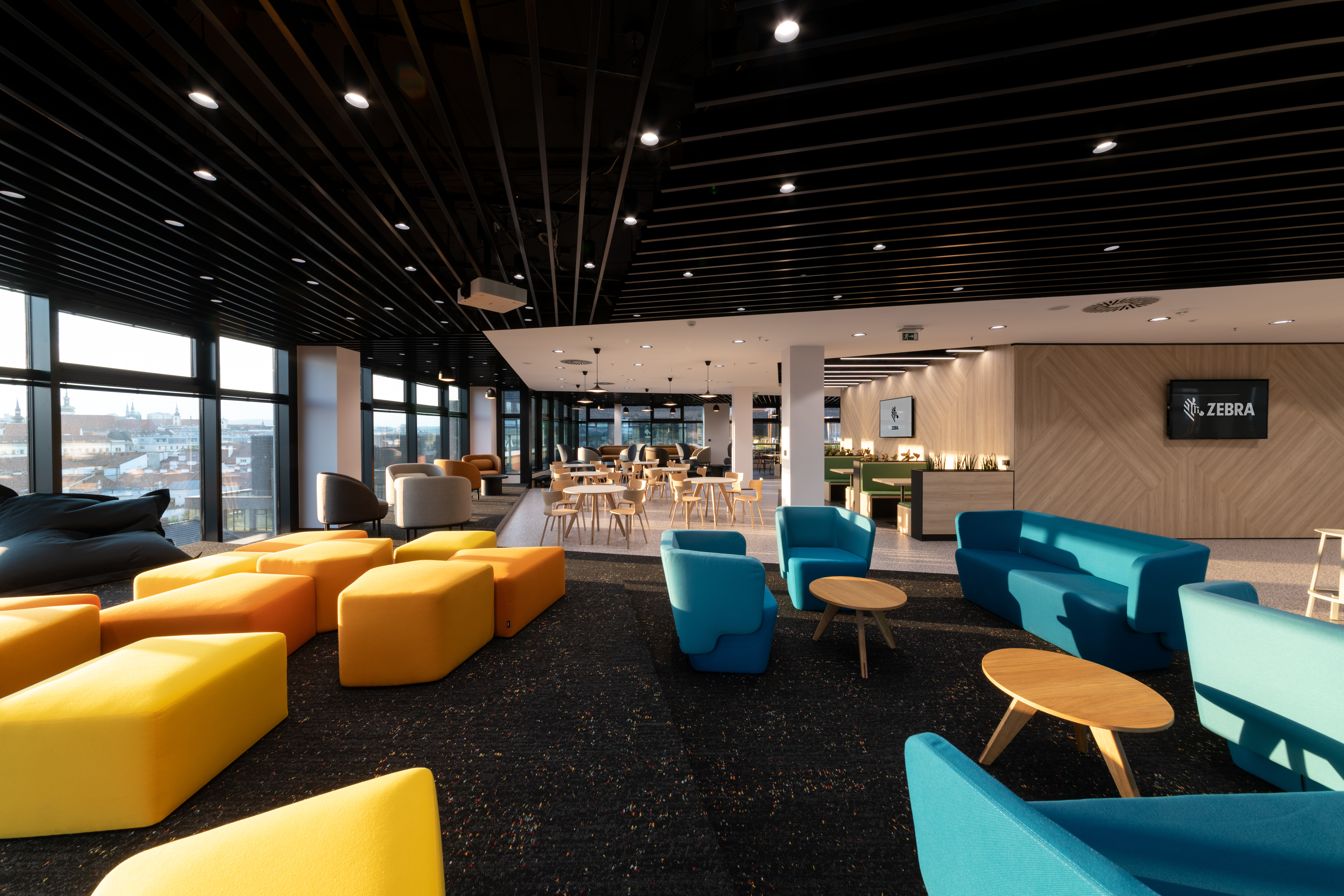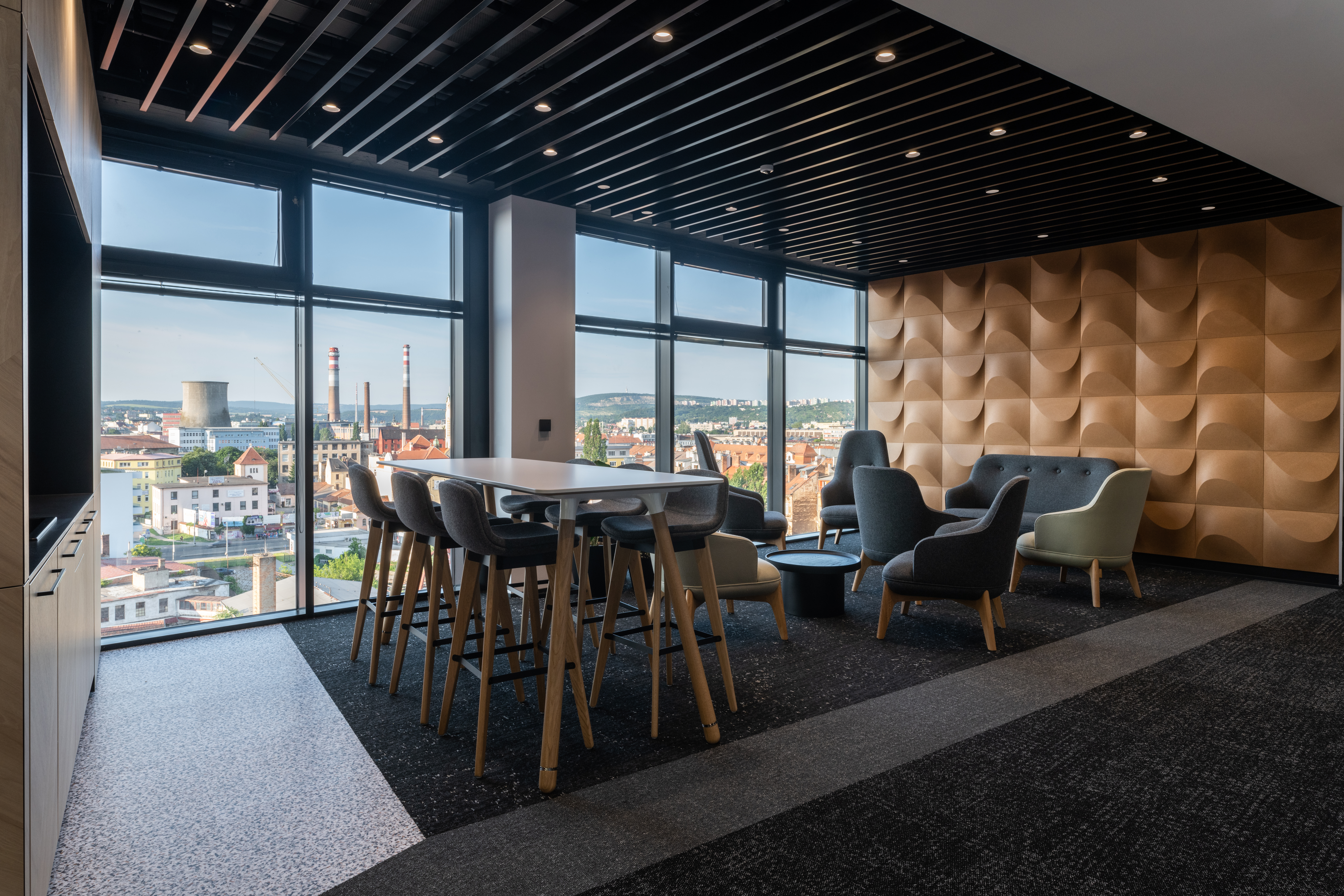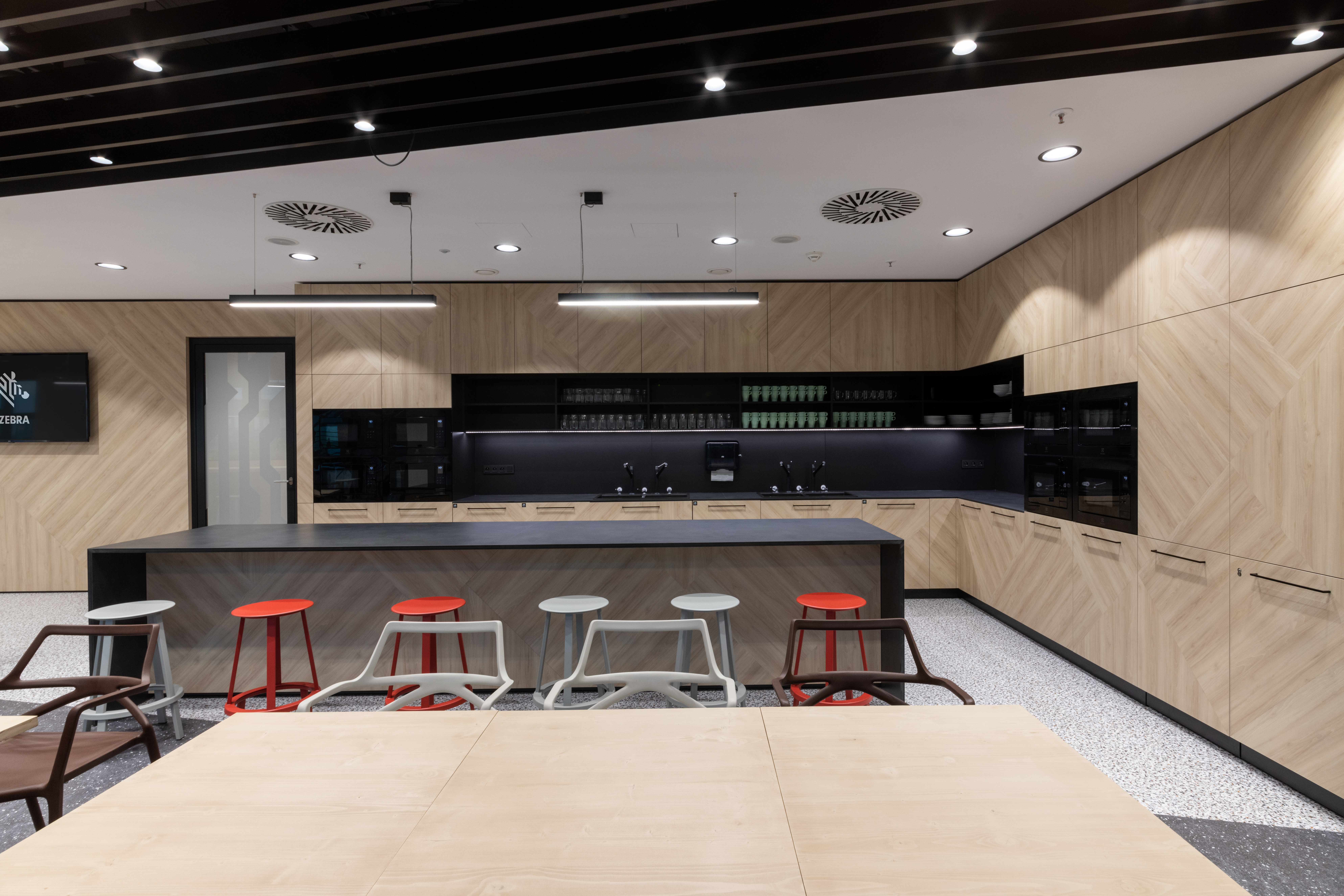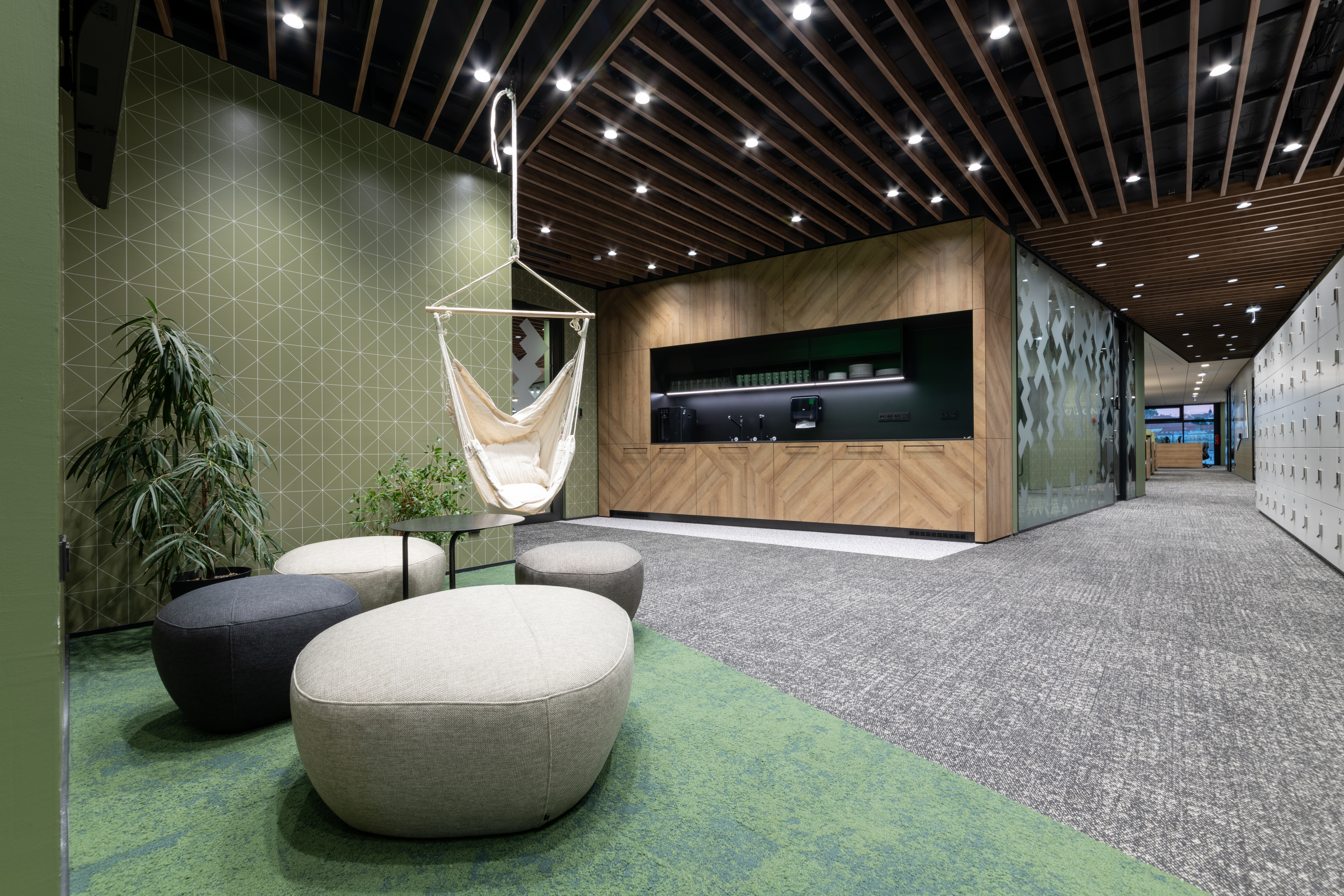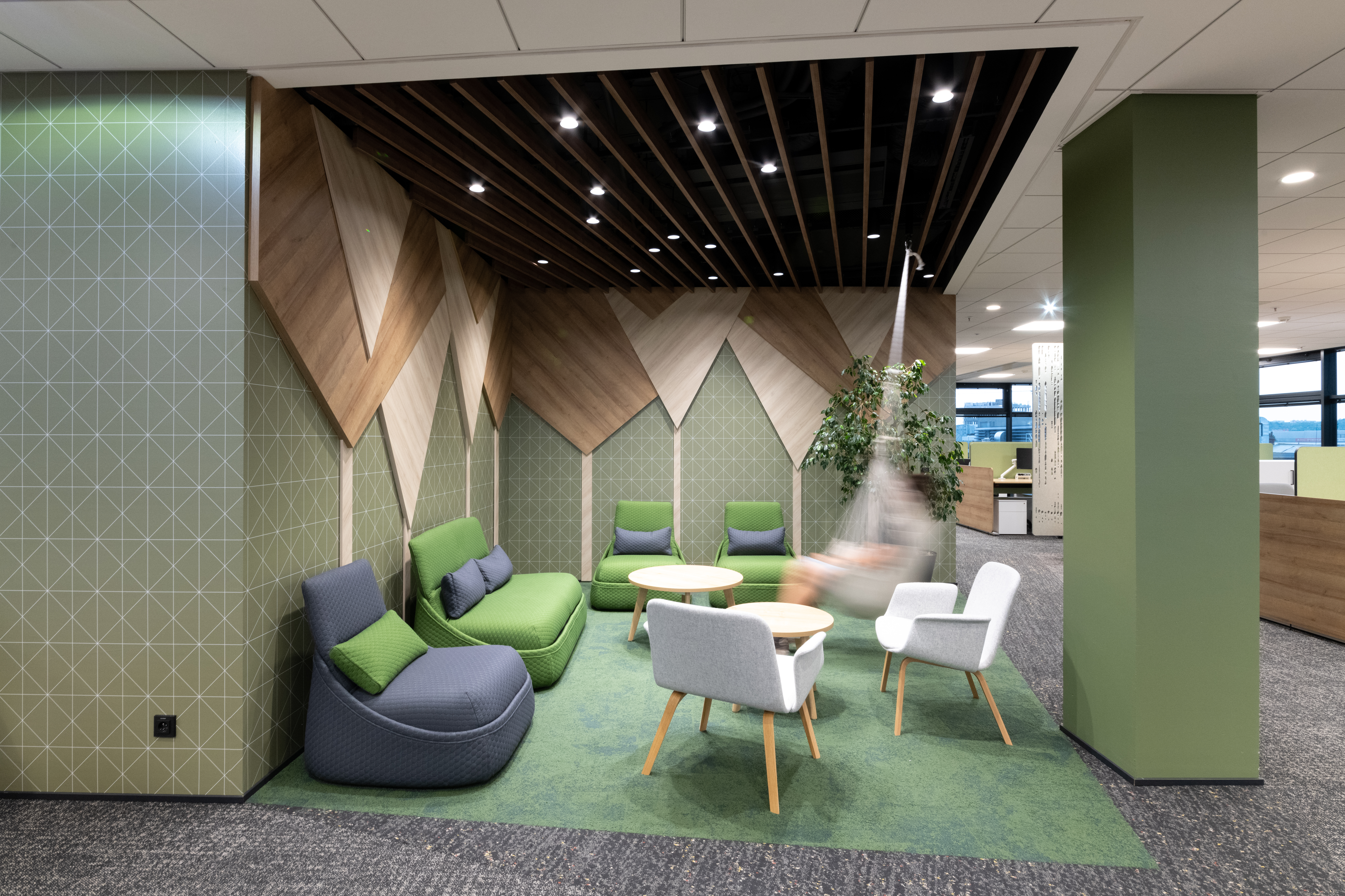 The main botanical and zoological theme is intertwined with all architectural applications - from the first "testfits" and floor plans configurations, through choices of furniture, decors, surfaces, greenery to details at the level of graphic navigation or nomenclature of individual departments. The floor coverings of the sea floor reflect the curves and lines of the sea currents, the jungle floor evokes the atmosphere of natural wilderness thanks to swings and greenery, the savannah level is dominated by typically dark trees and light tones of arid landscape. The whole concept is dominated by the element of Zebra carefully hidden and paraphrased in the form of graphics, a selection of interior plants, textures, iconic seating elements or the choice of folded wood patterns. An integral part of the design is work with post-covid office layouts and all current trends. In addition to standard free-standing furniture, we also supplied the project with all atypical furniture (kitchens, built-in cabinets, wall tiles, outdoor flower beds ...), wallpaper, graphic stickers, curtains, acoustic wall tiles.