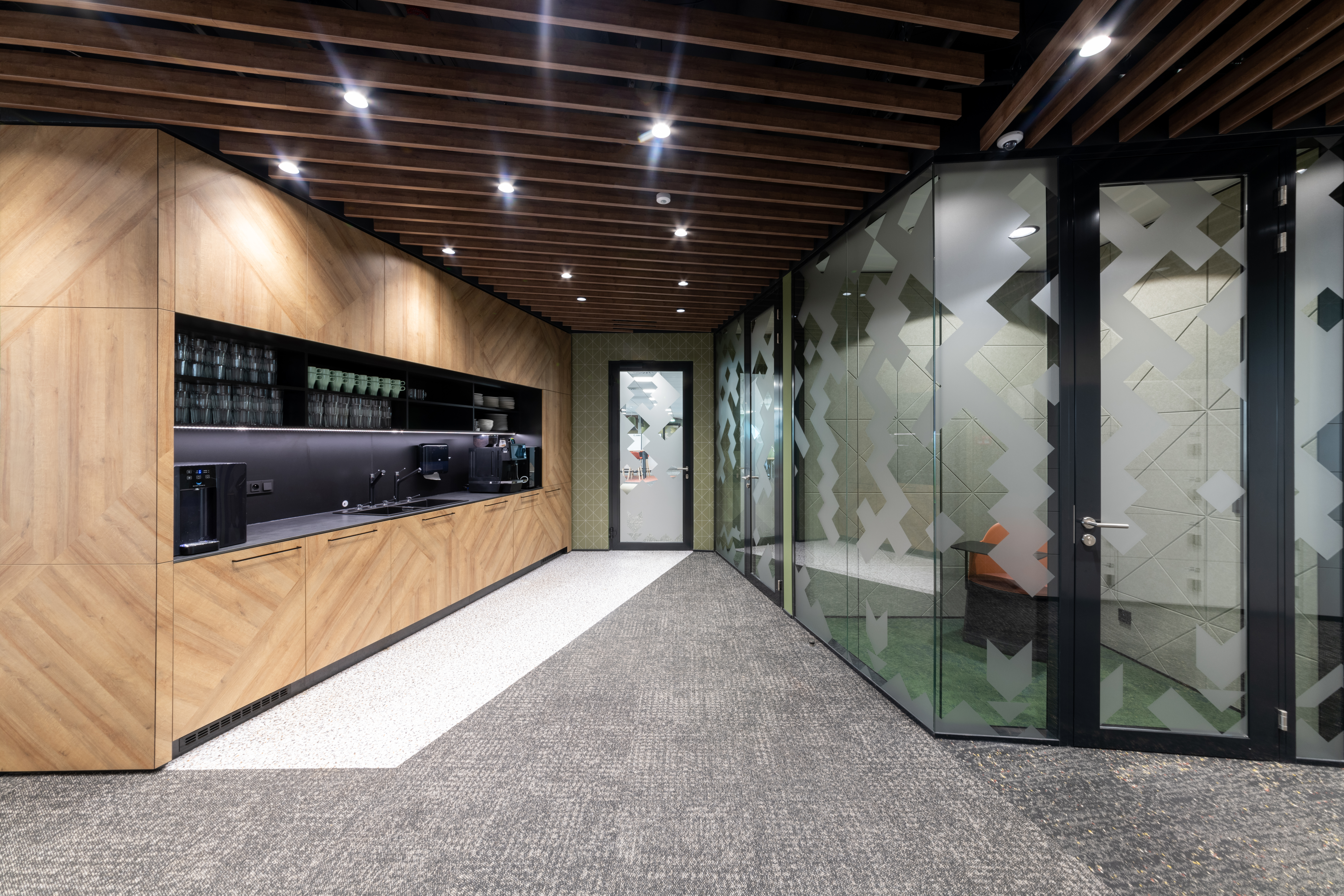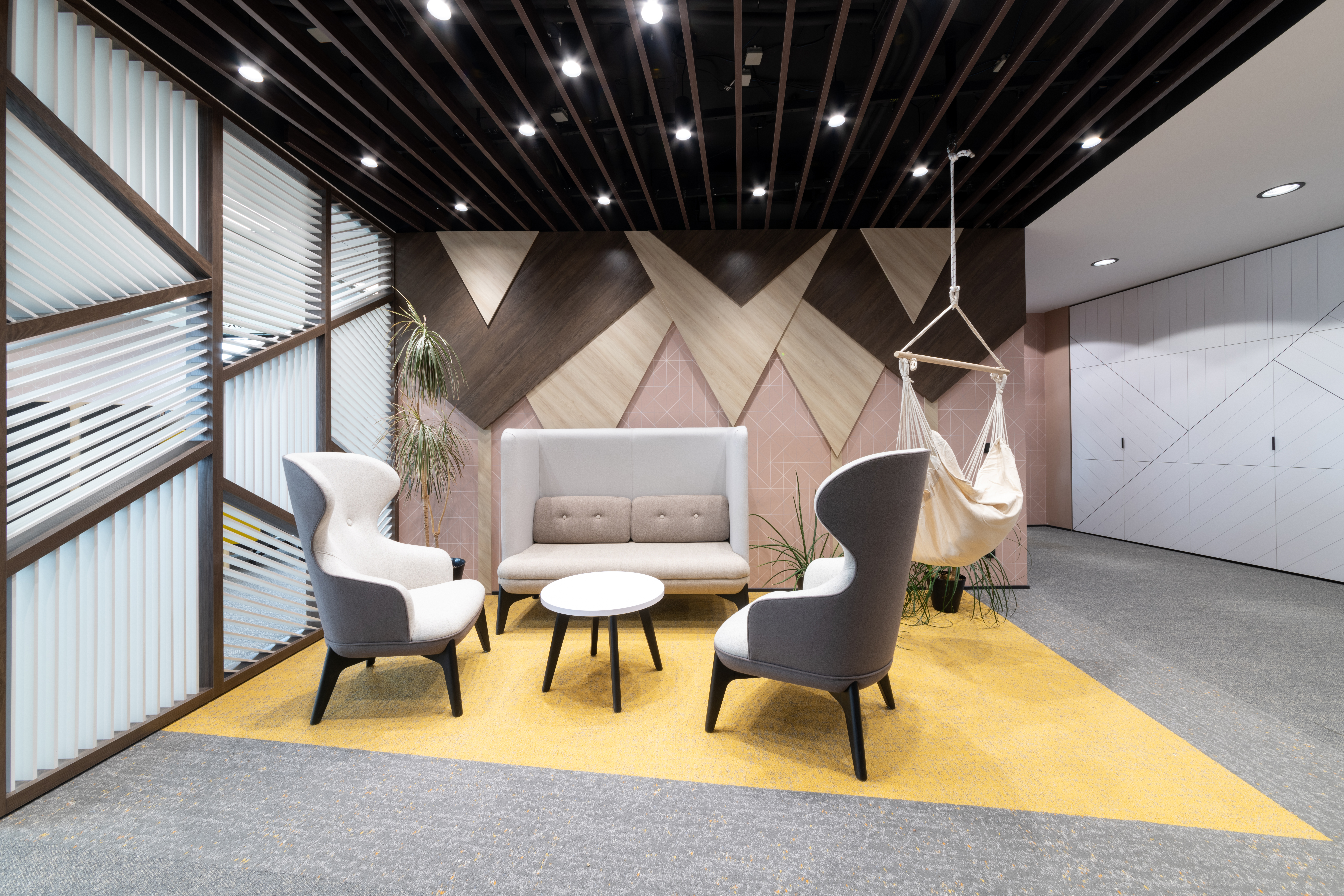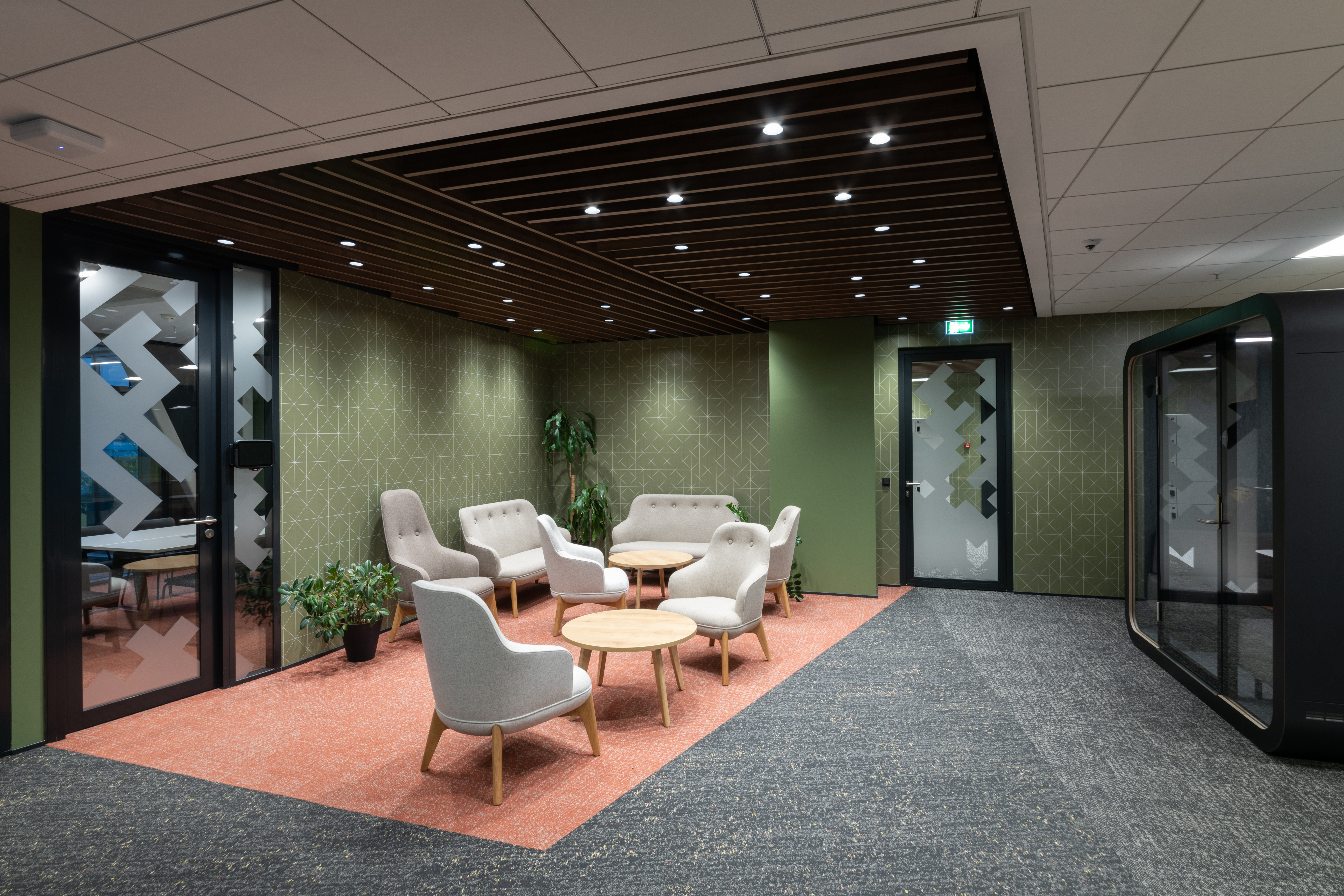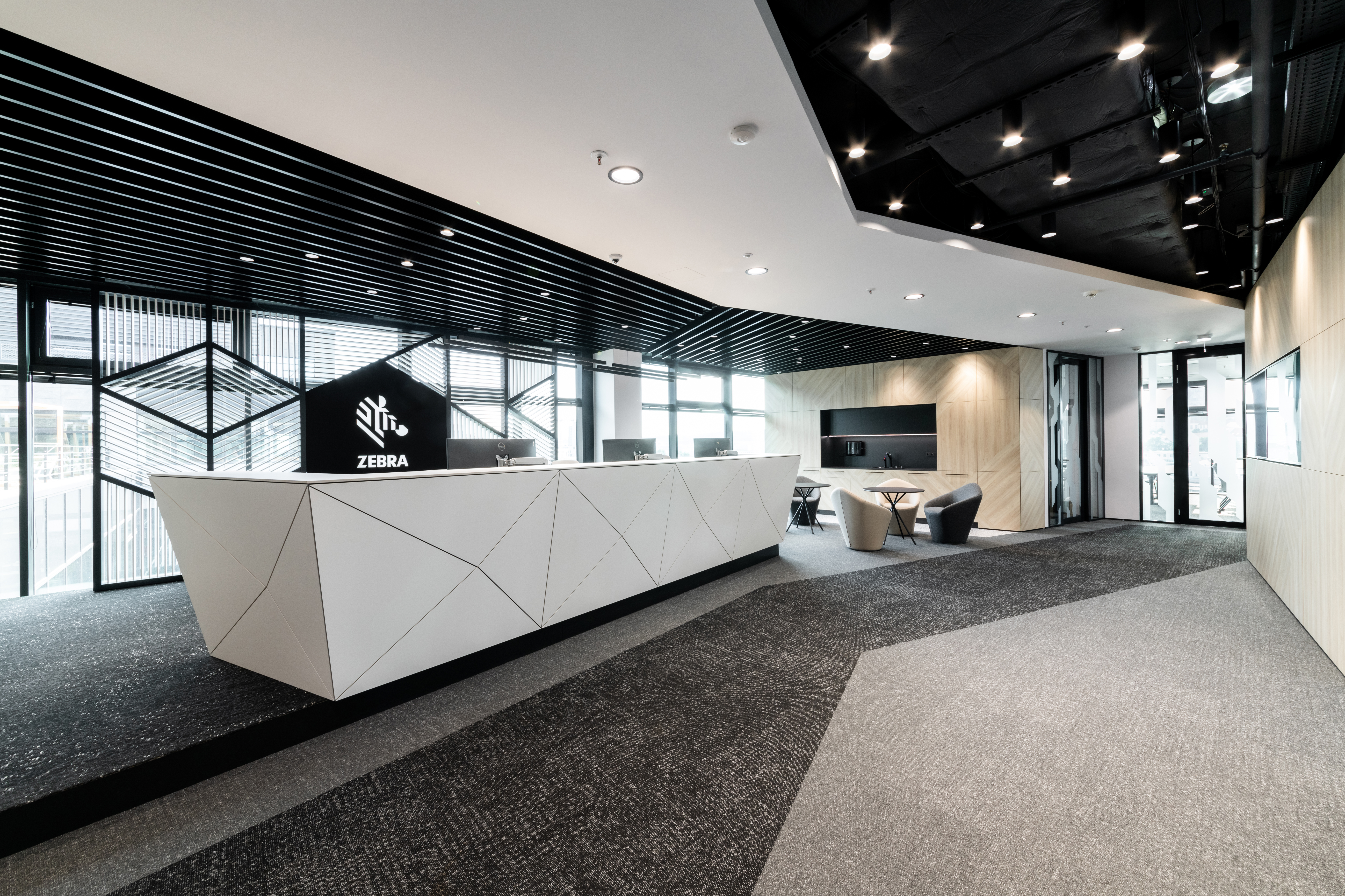 The main botanical and zoological theme is intertwined with all architectural applications - from the first "testfits" and floor plans configurations, through choices of furniture, decors, surfaces, greenery to details at the level of graphic navigation or nomenclature of individual departments. The floor coverings of the sea floor reflect the curves and lines of the sea currents, the jungle floor evokes the atmosphere of natural wilderness thanks to swings and greenery, the savannah level is dominated by typically dark trees and light tones of arid landscape. The whole concept is dominated by the element of Zebra carefully hidden and paraphrased in the form of graphics, a selection of interior plants, textures, iconic seating elements or the choice of folded wood patterns. An integral part of the design is work with post-covid office layouts and all current trends. In addition to standard free-standing furniture, we also supplied the project with all atypical furniture (kitchens, built-in cabinets, wall tiles, outdoor flower beds ...), wallpaper, graphic stickers, curtains, acoustic wall tiles.