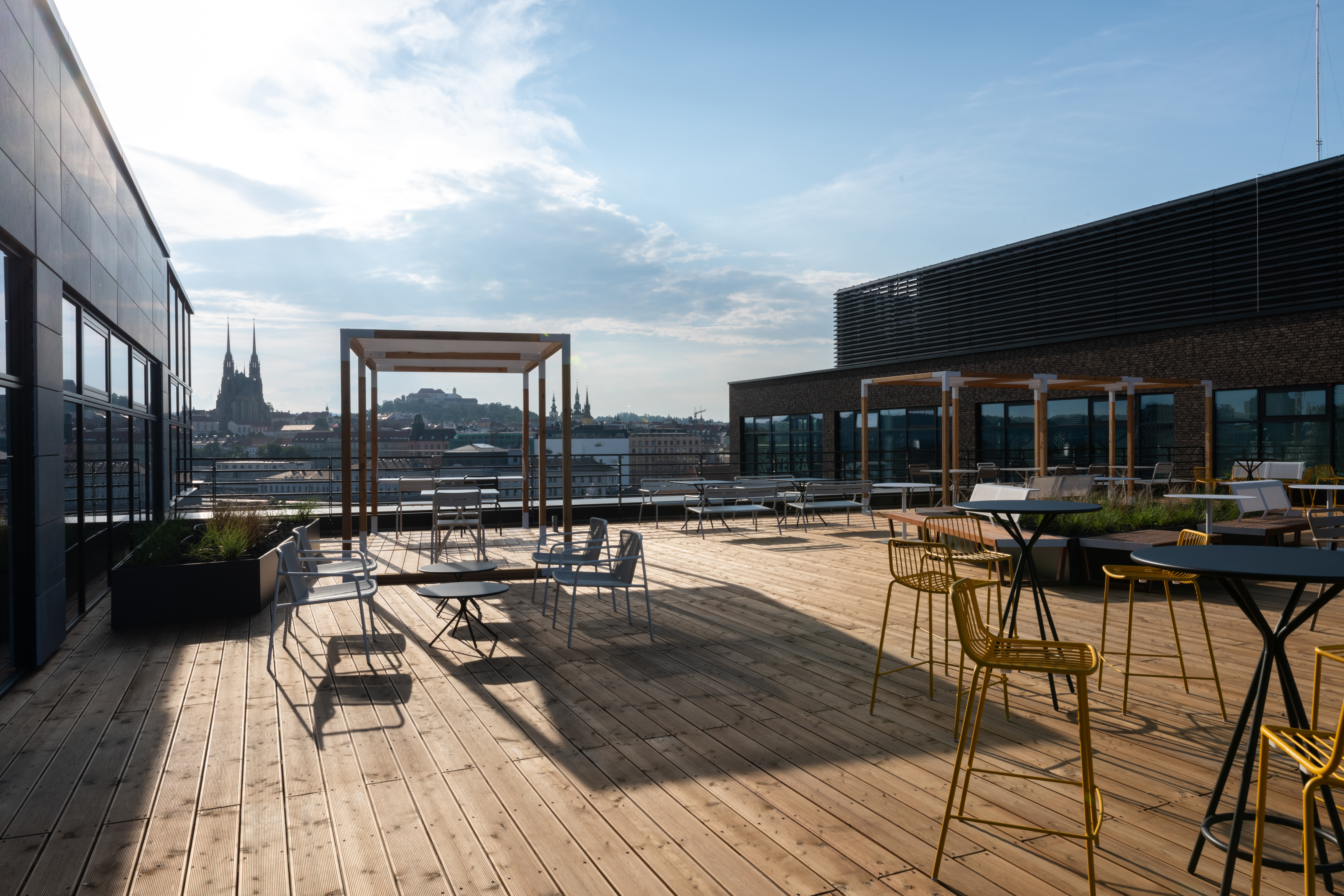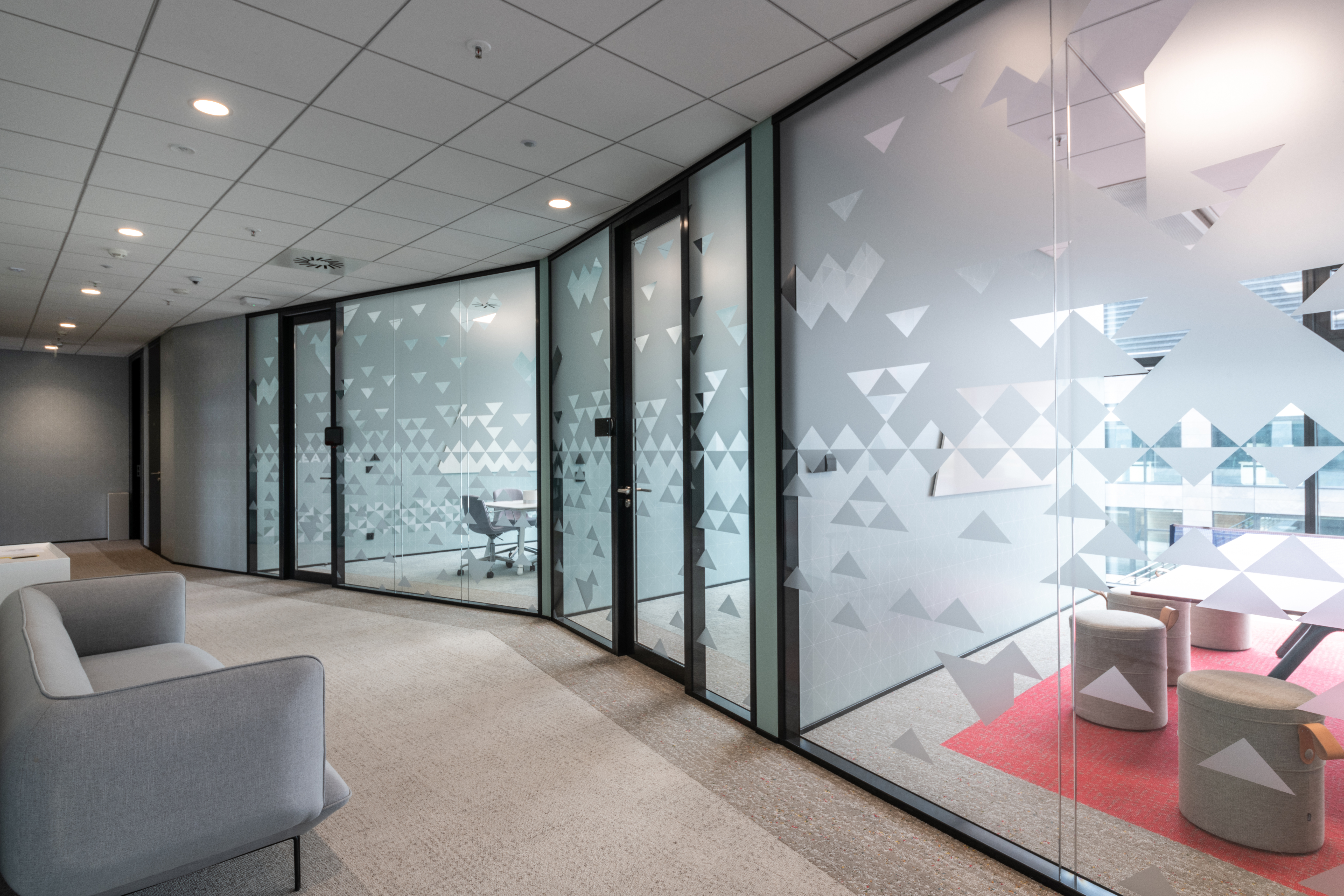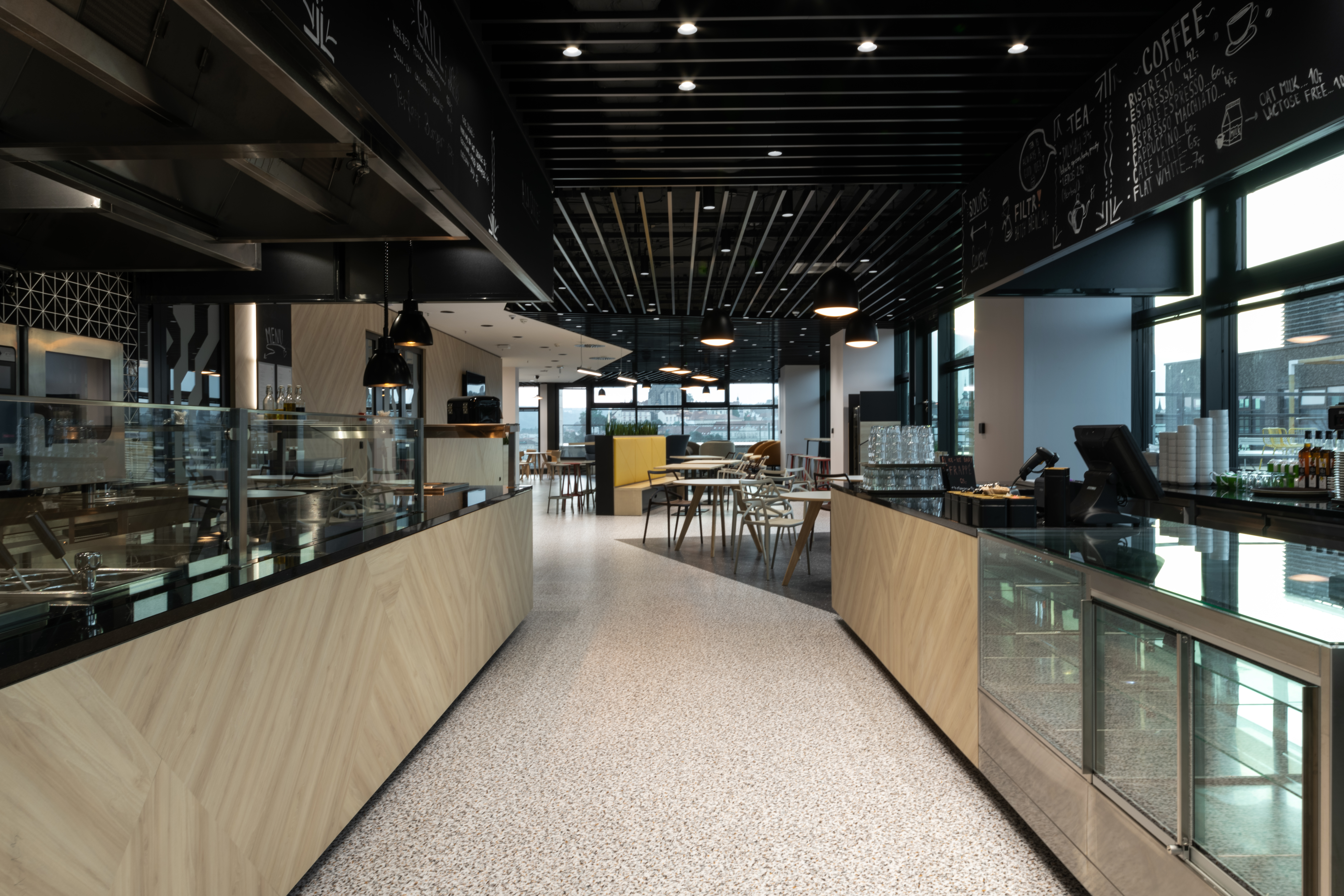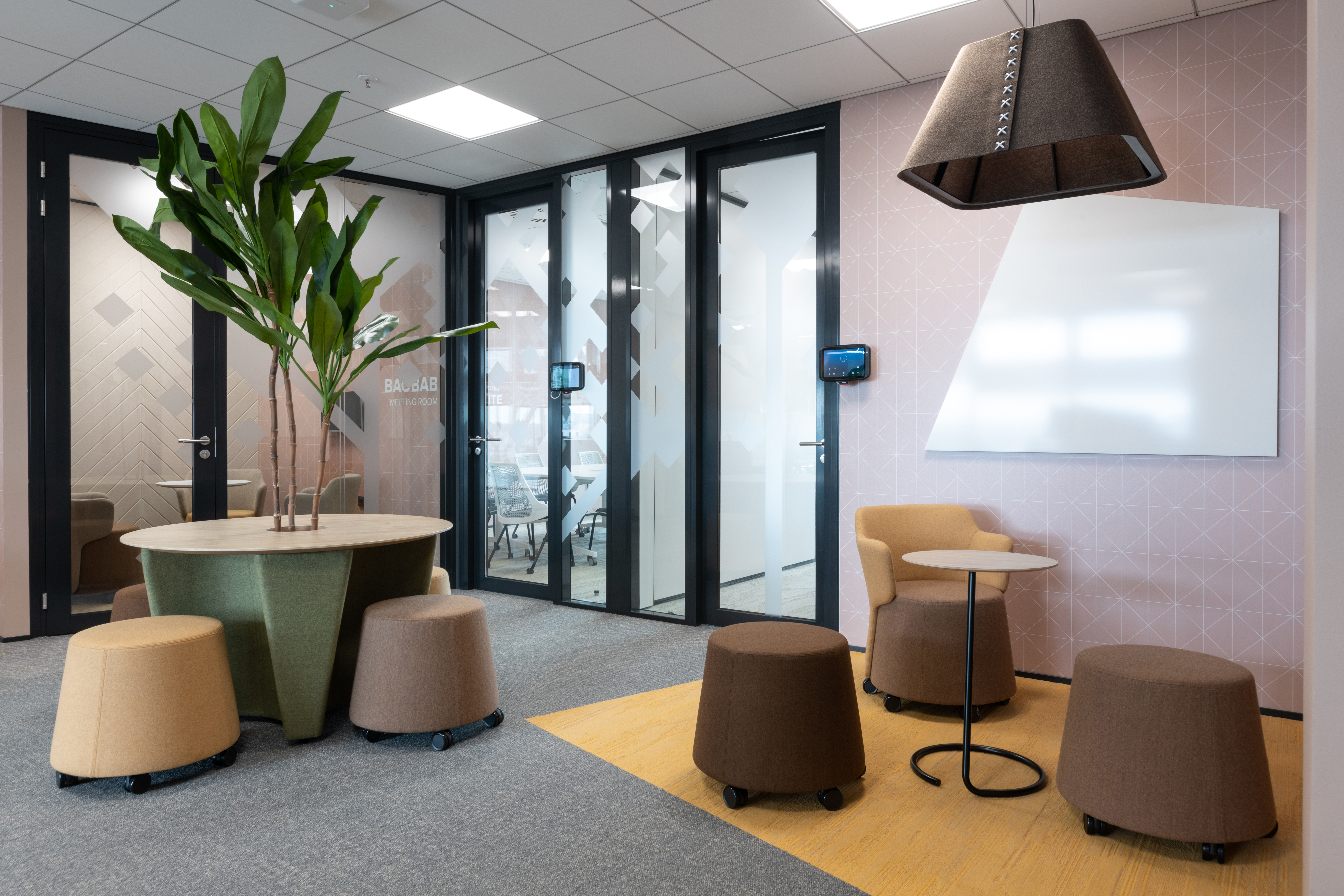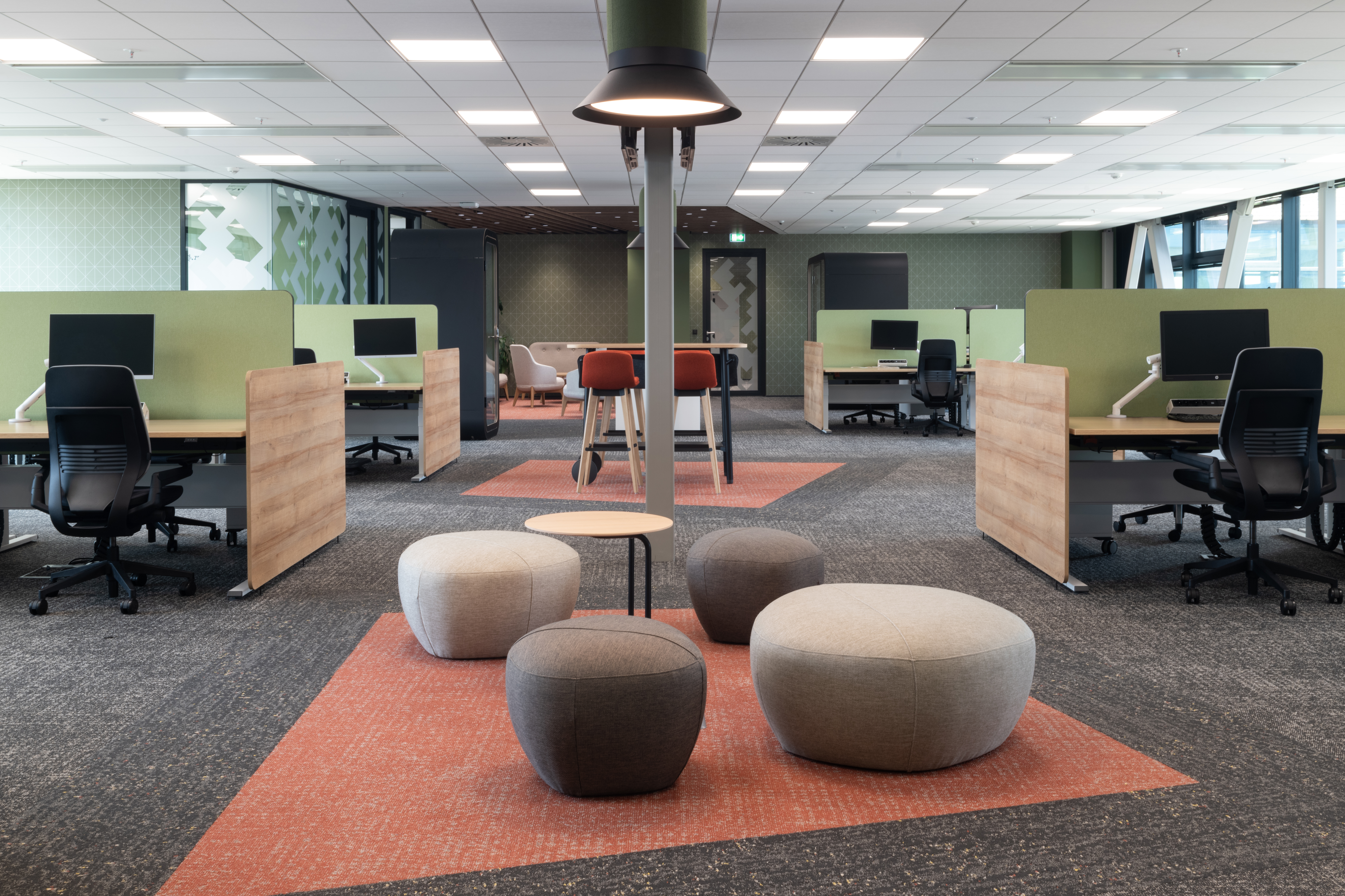 The main botanical and zoological theme is intertwined with all architectural applications - from the first "testfits" and floor plans configurations, through choices of furniture, decors, surfaces, greenery to details at the level of graphic navigation or nomenclature of individual departments. The floor coverings of the sea floor reflect the curves and lines of the sea currents, the jungle floor evokes the atmosphere of natural wilderness thanks to swings and greenery, the savannah level is dominated by typically dark trees and light tones of arid landscape. The whole concept is dominated by the element of Zebra carefully hidden and paraphrased in the form of graphics, a selection of interior plants, textures, iconic seating elements or the choice of folded wood patterns. An integral part of the design is work with post-covid office layouts and all current trends. In addition to standard free-standing furniture, we also supplied the project with all atypical furniture (kitchens, built-in cabinets, wall tiles, outdoor flower beds ...), wallpaper, graphic stickers, curtains, acoustic wall tiles.